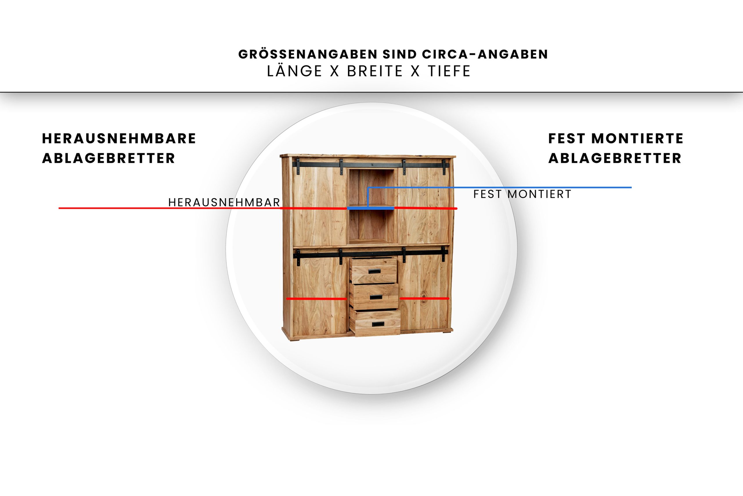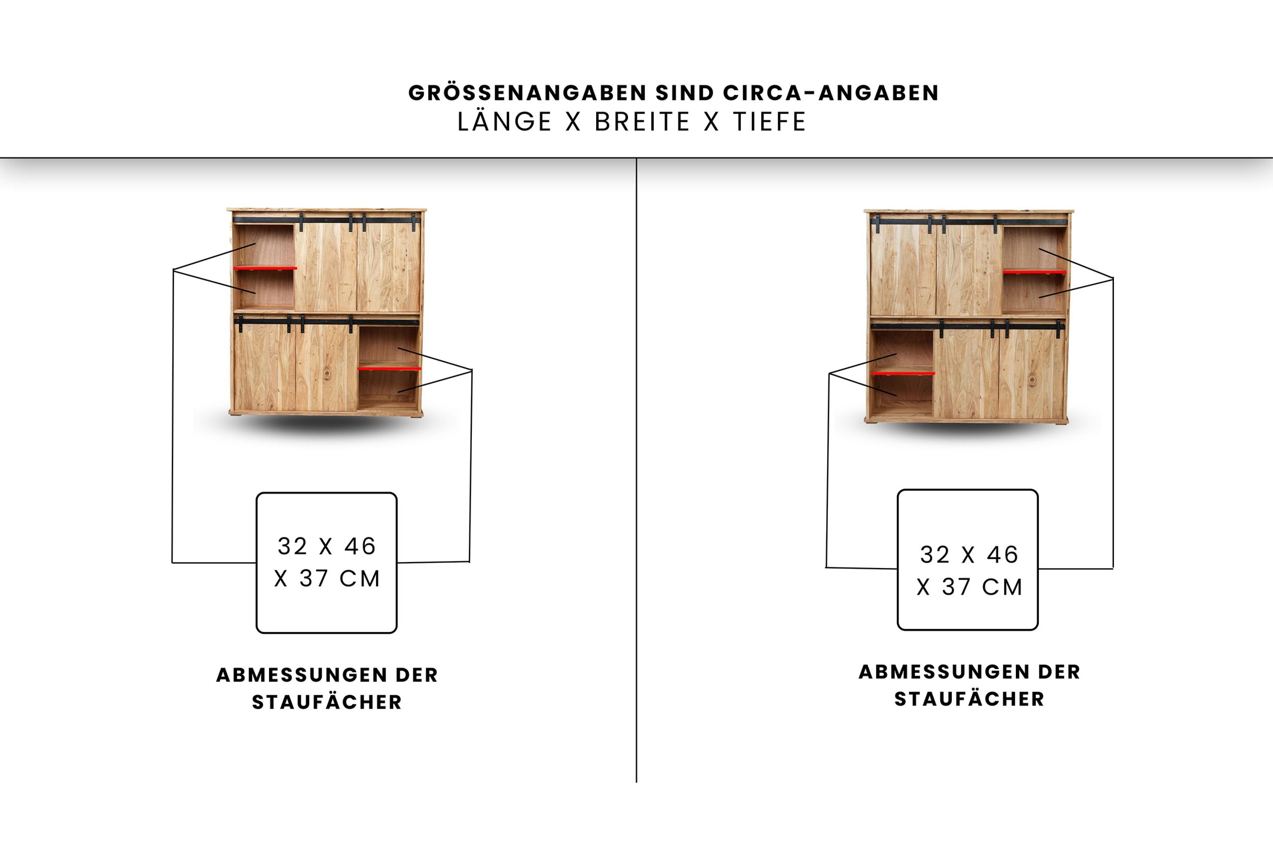 - Die echten Baumkanten der vier Schiebetüren sowie Deck- & Seitenplatten machen jedes Highboard zum individuellen und besonderen Unikat.