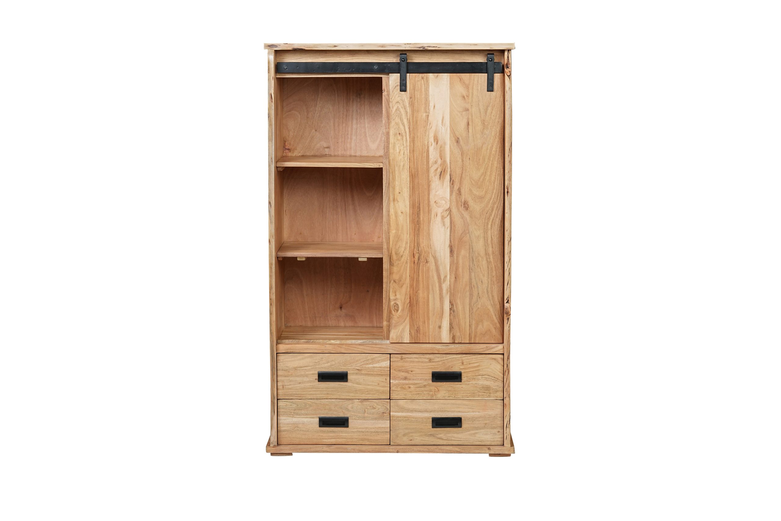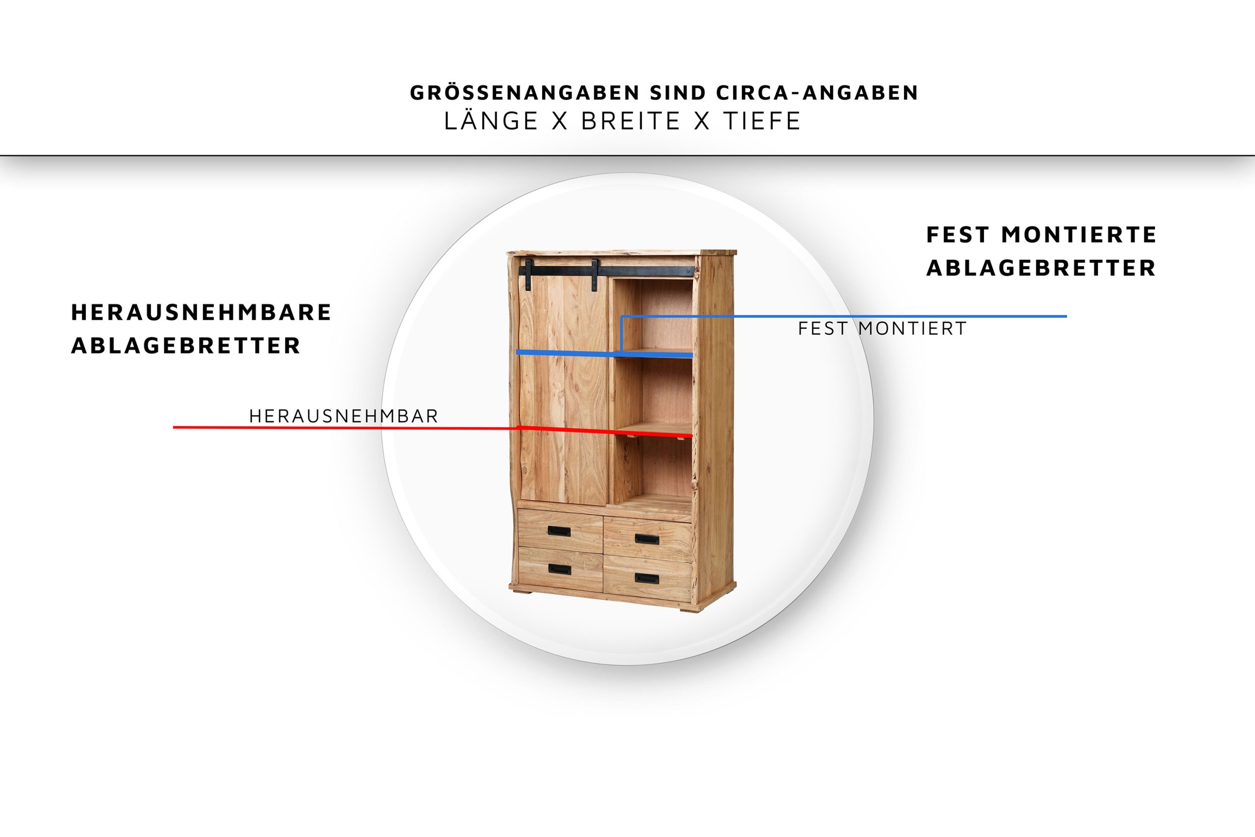 Die echten Baumkanten der Holztür unterstreicht den rustikalen Charakter und macht jedes Möbelstück einzigartig. Die natürlichen Formen sorgen für eine harmonische Optik und ein besonderes Design. Die gusseisernen Griffe der Schubladen und Laufschiene der Tür machen den Schrank zu einem robusten und langlebigen Möbelstück. Sie ermöglichen eine leichtgängige Nutzung der Tür & Schubladen und setzen stilvolle Akzente im Industrial-Design.