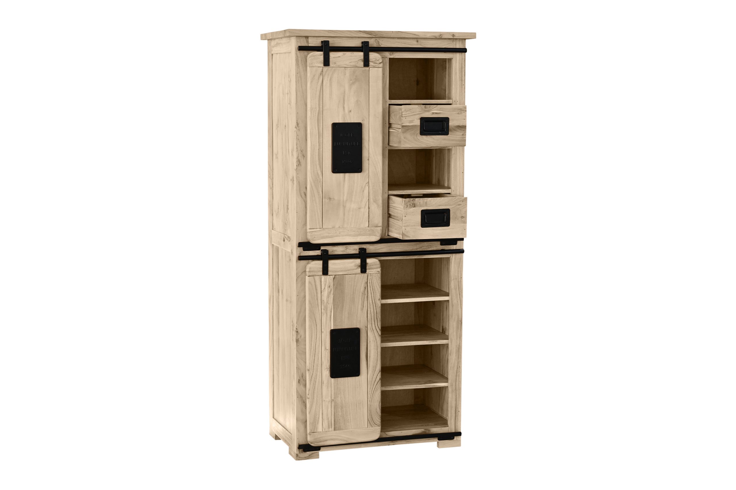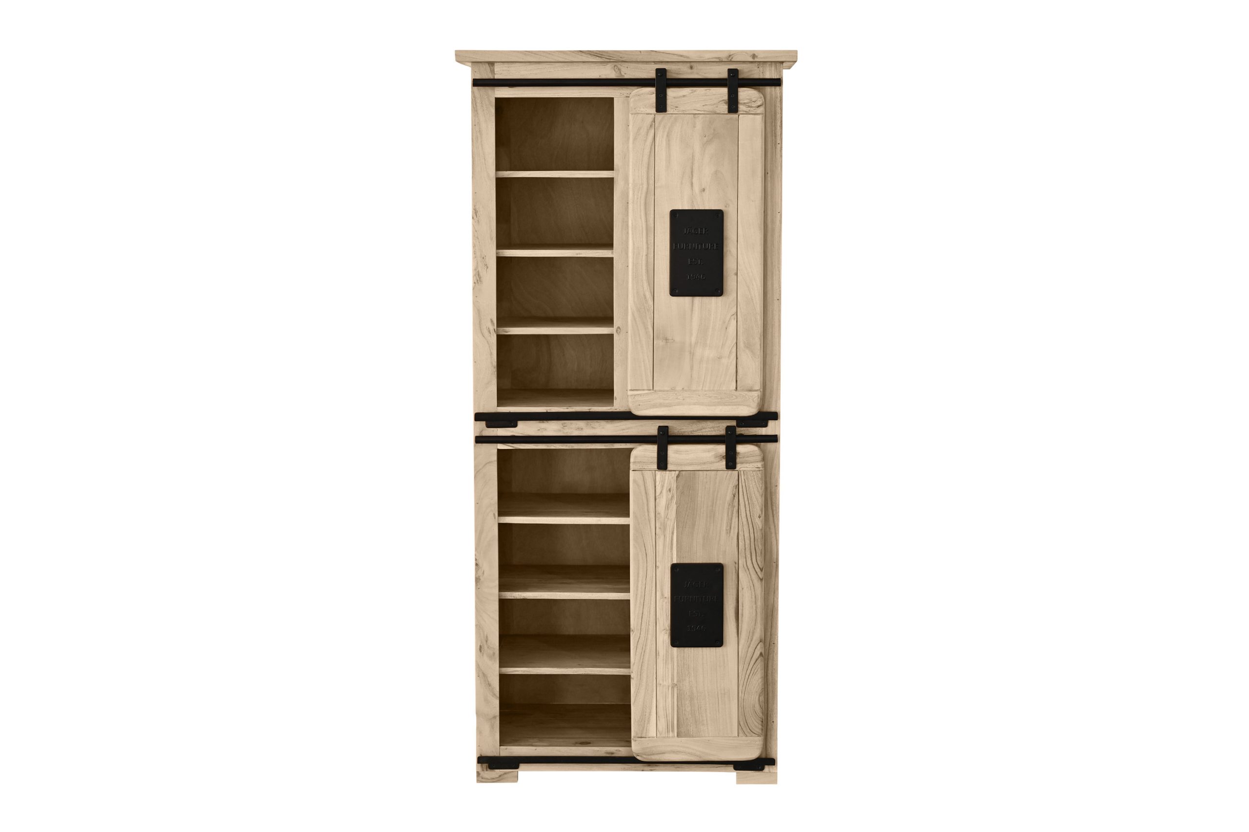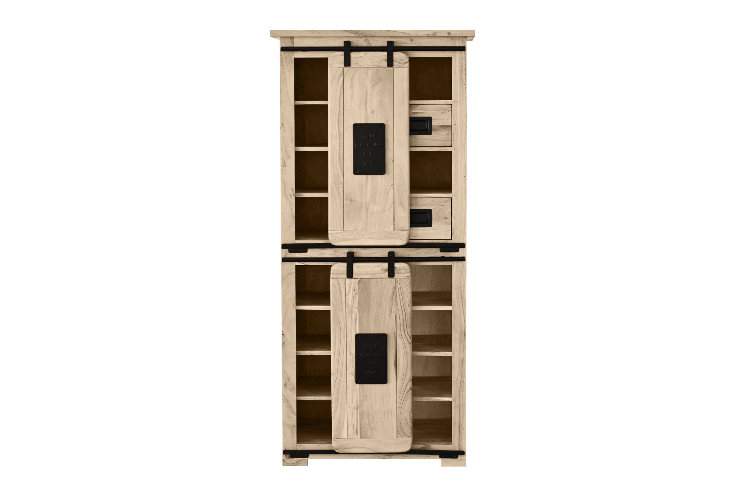 ✔ Zwei Holzschiebetüren – ausgestattet mit stabilen Eisen-Relings und Rollenführung.
