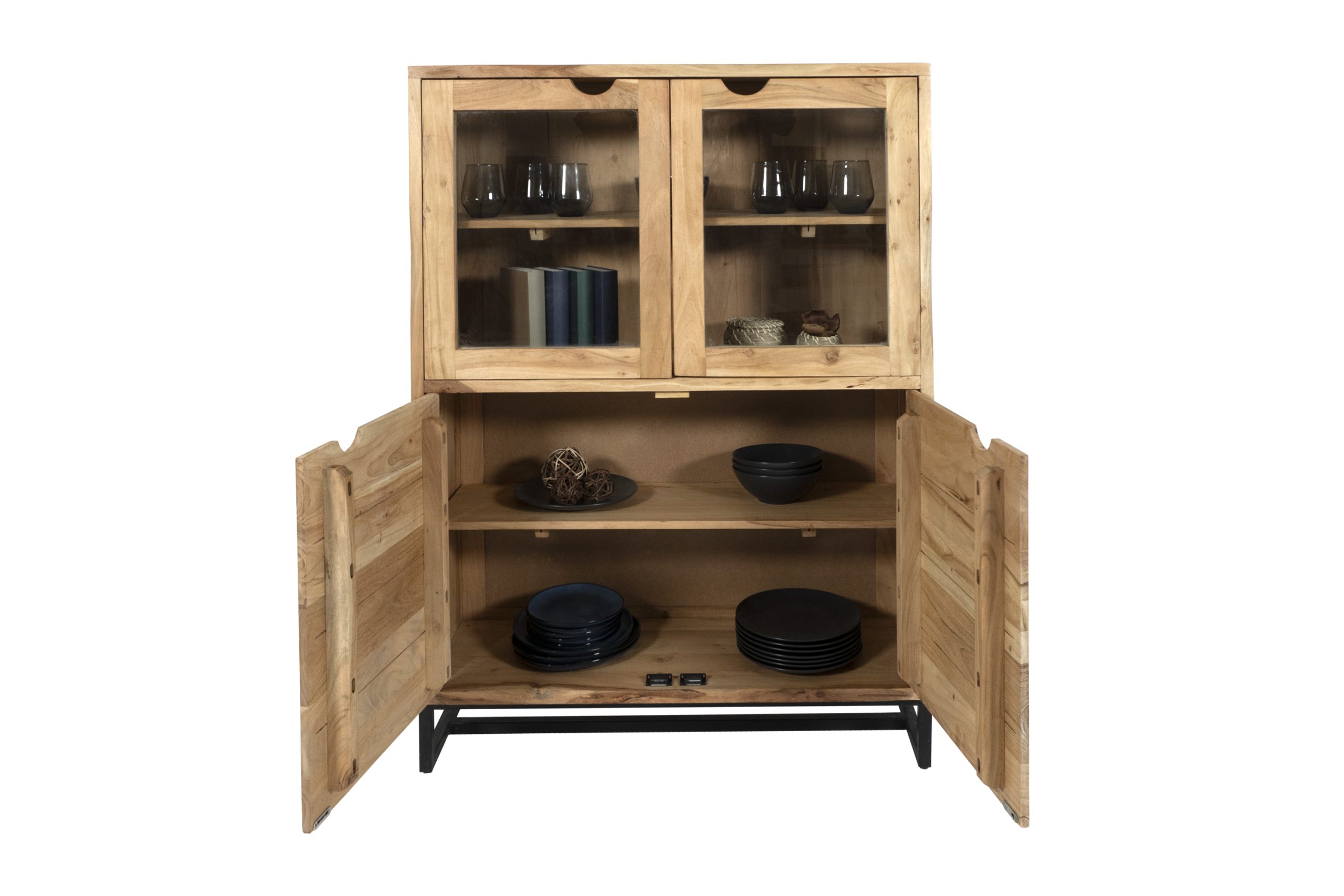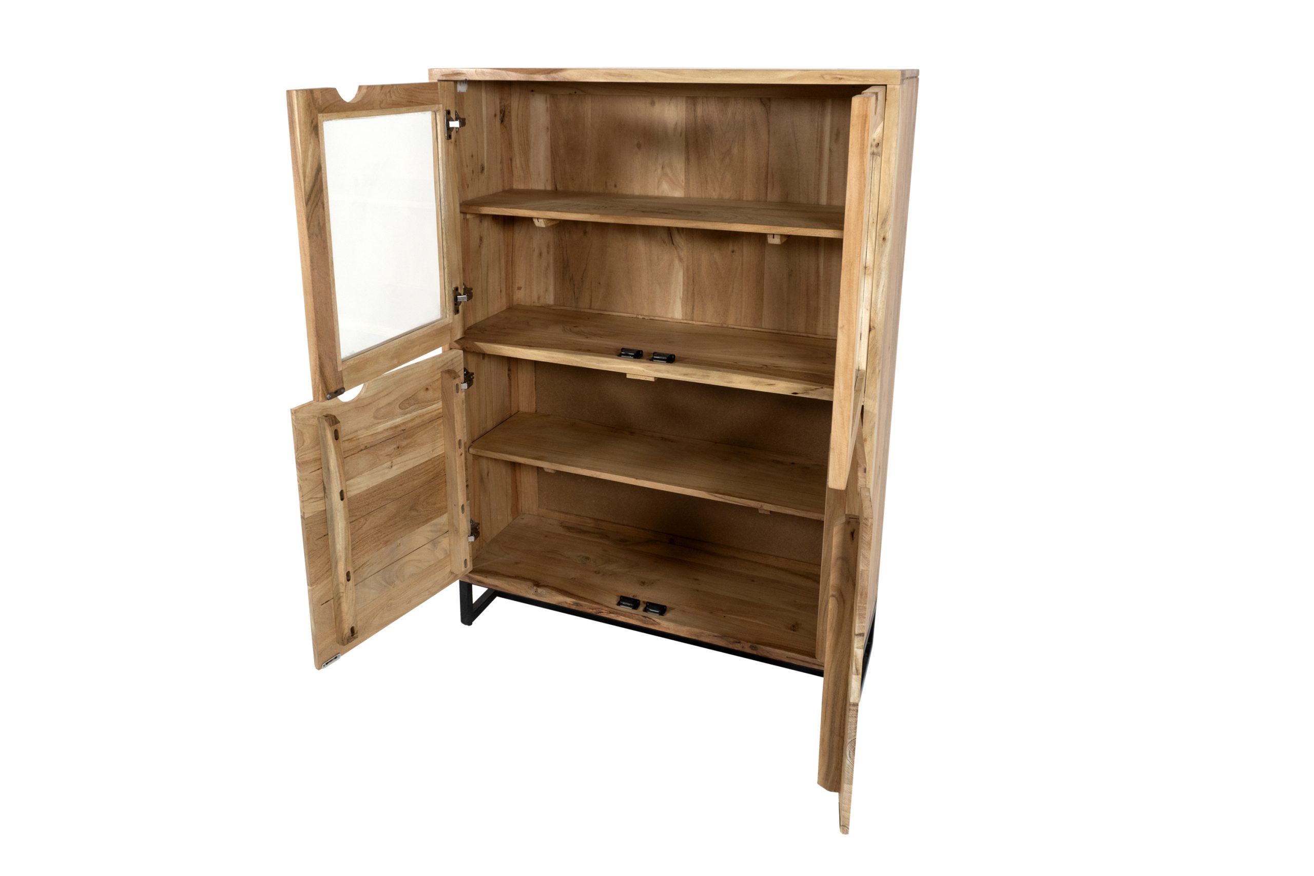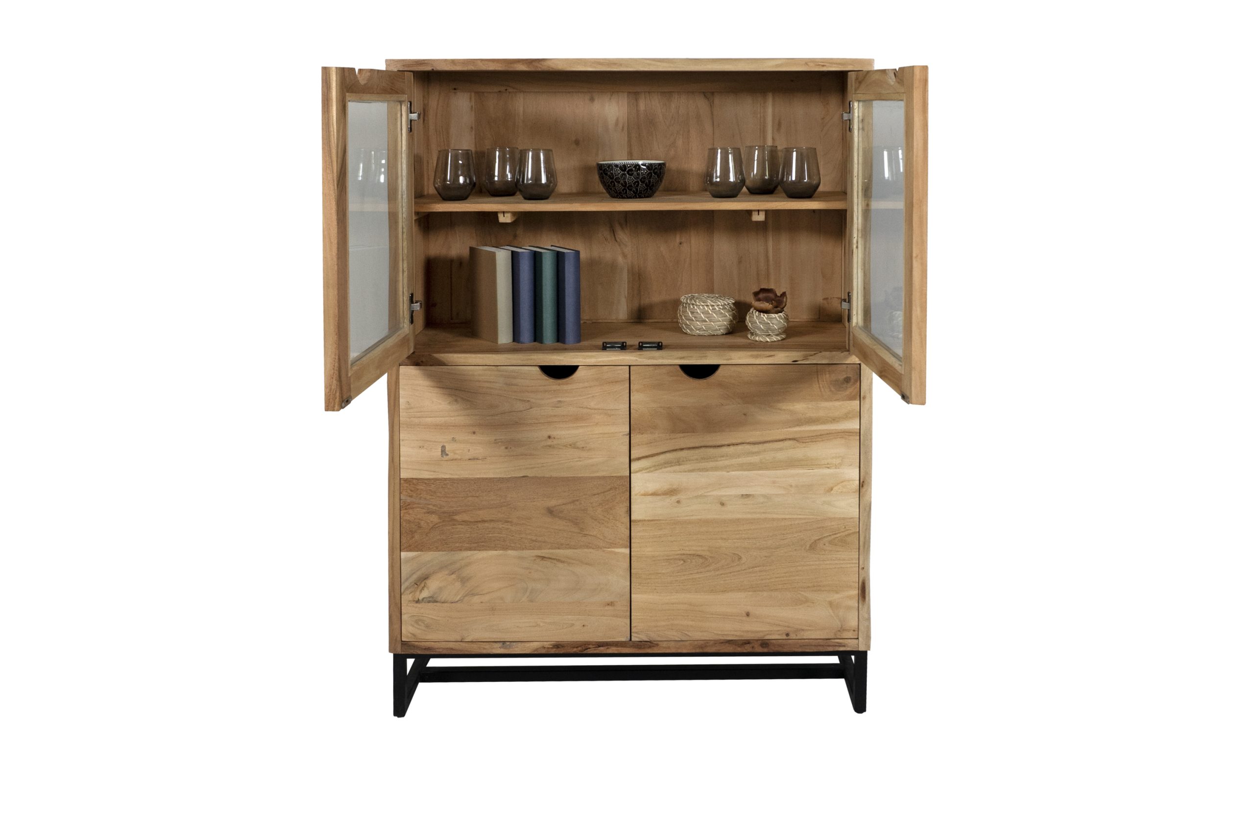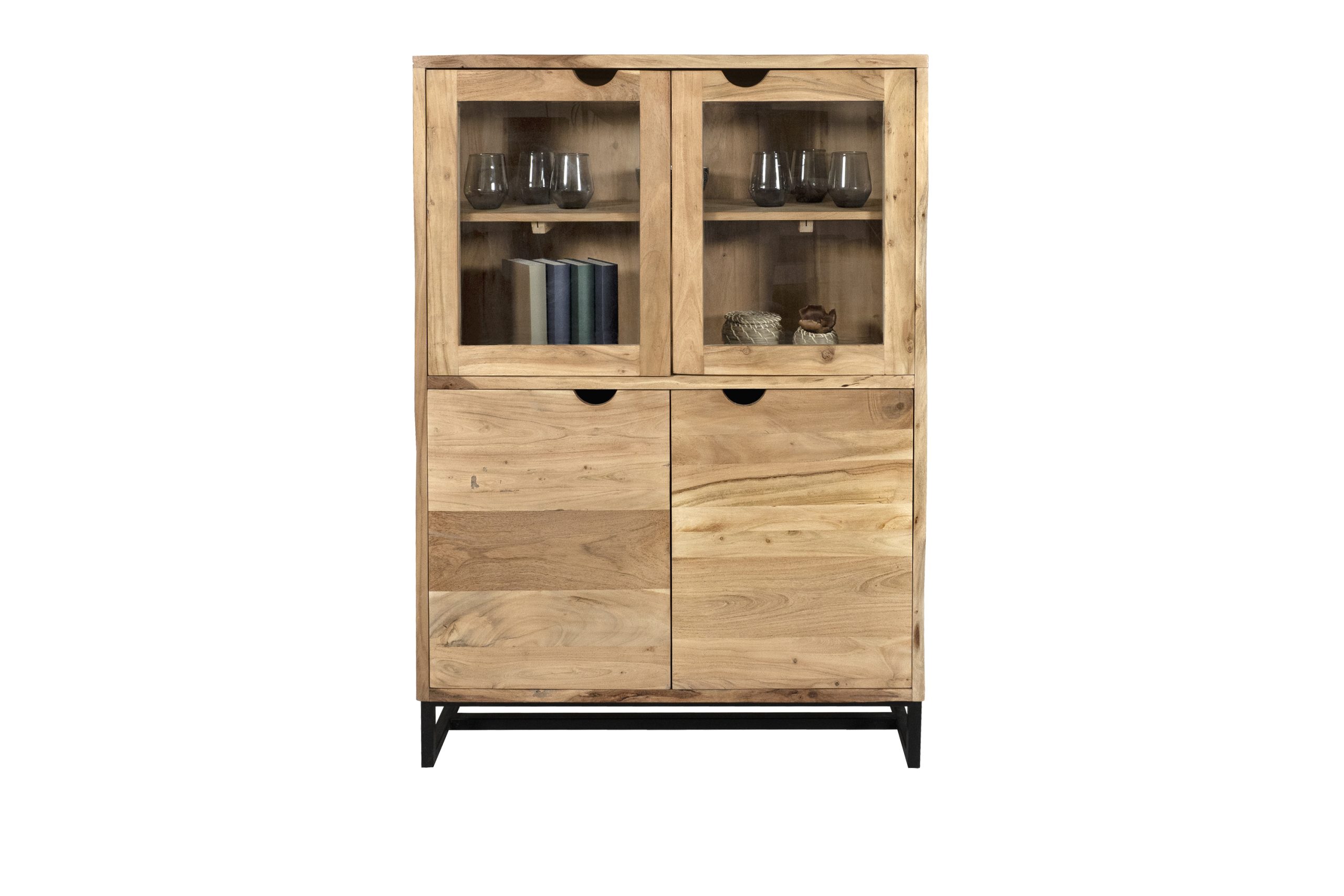 Für dieses Möbelstück wird ausschließlich bestes Akazienholz verwendet. Dies verleiht dem Schrank eine hochwertige Qualität und ansprechende Optik. Jedes Exemplar besitzt zudem eine individuelle Maserung und ist daher ein Unikat. Mit je zwei Glas- und Holztüren ausgestattet, bietet der Hochschrank genügend Stauraum für Geschirr, Bücher und andere Gegenstände. Zusätzlich kann der moderne Schrank mit Deko-Elementen geschmückt und stilvoll präsentiert werden. Alle Türen besitzen stilgerechte Griffmulden.