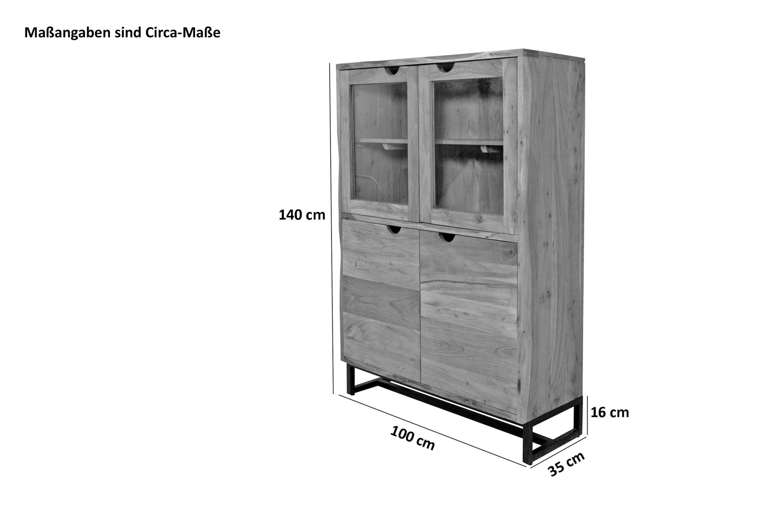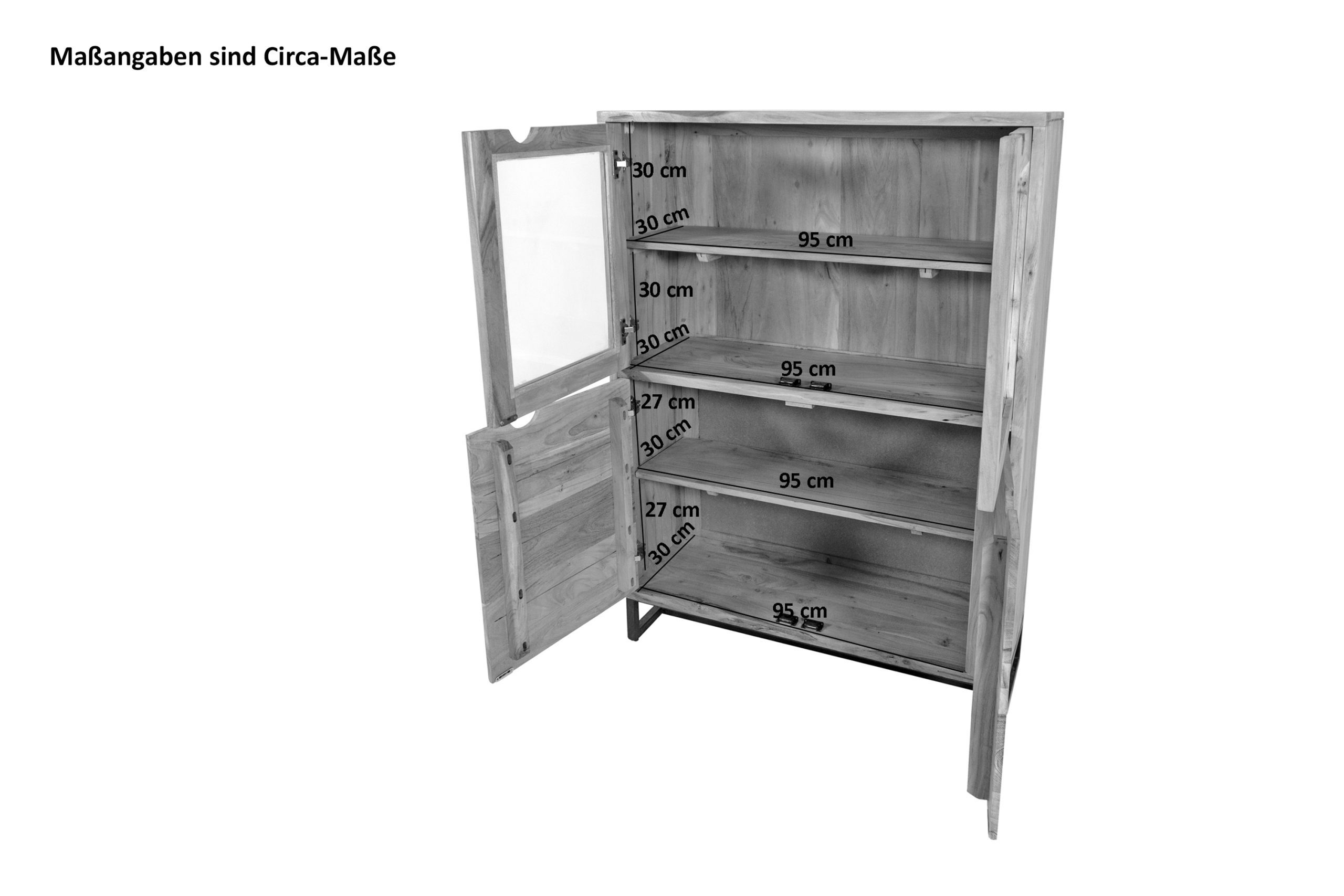 Trendiges Highboard Sukhothai, Akazienholz naturfarben, massiv & lackiert, mit je 2 Glas- und Holztüren, 100 x 35 x 140 cm