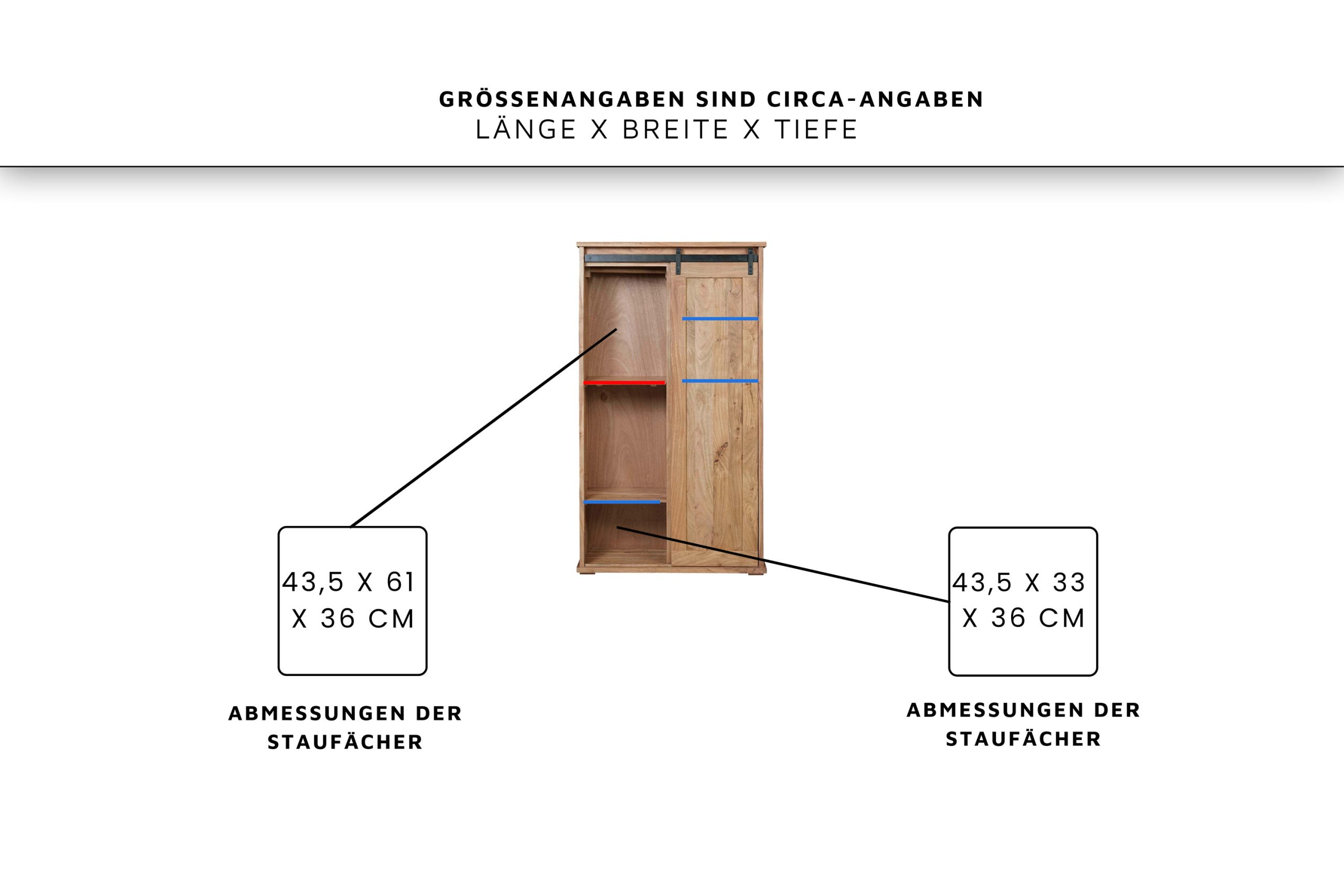 - Die Kombination aus Massivholz & Eisen fügt sich harmonisch in moderne & rustikale Schlafzimmer oder Ankleidezimmer ein – auch ideal als Garderobenschrank.