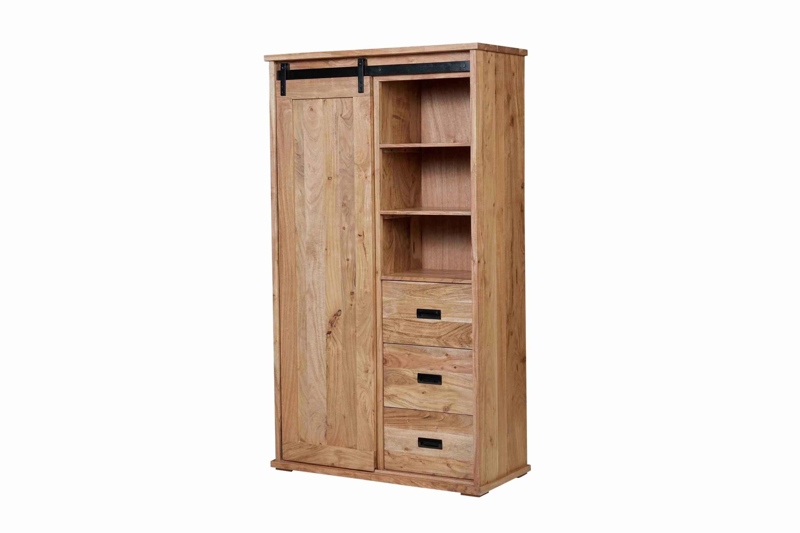 Kleiderschrank Liano | Akazienholz massiv + naturfarben | Schiebetür, 6 Fächer & 3 Schubladen | 100x45x175 cm