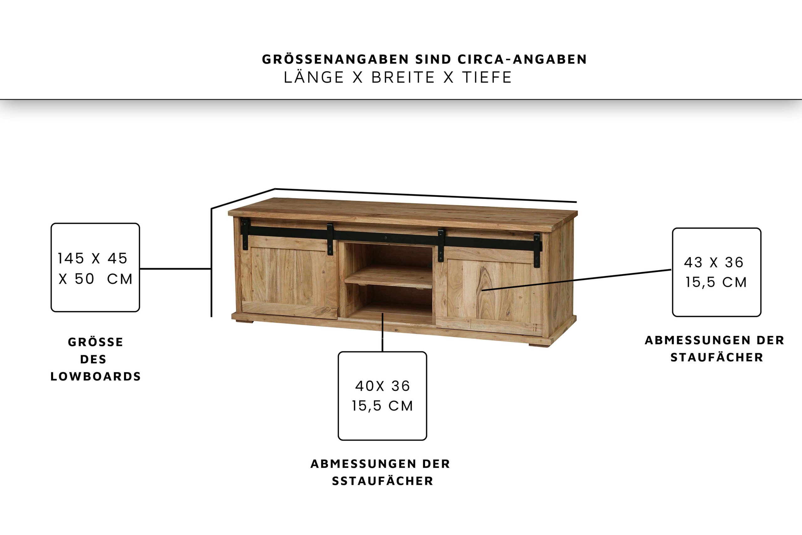 TV-Board Liano V | Akazienholz massiv | Naturfarben | 2 Schiebetüren & 6 Fächer | 145x45x50 cm