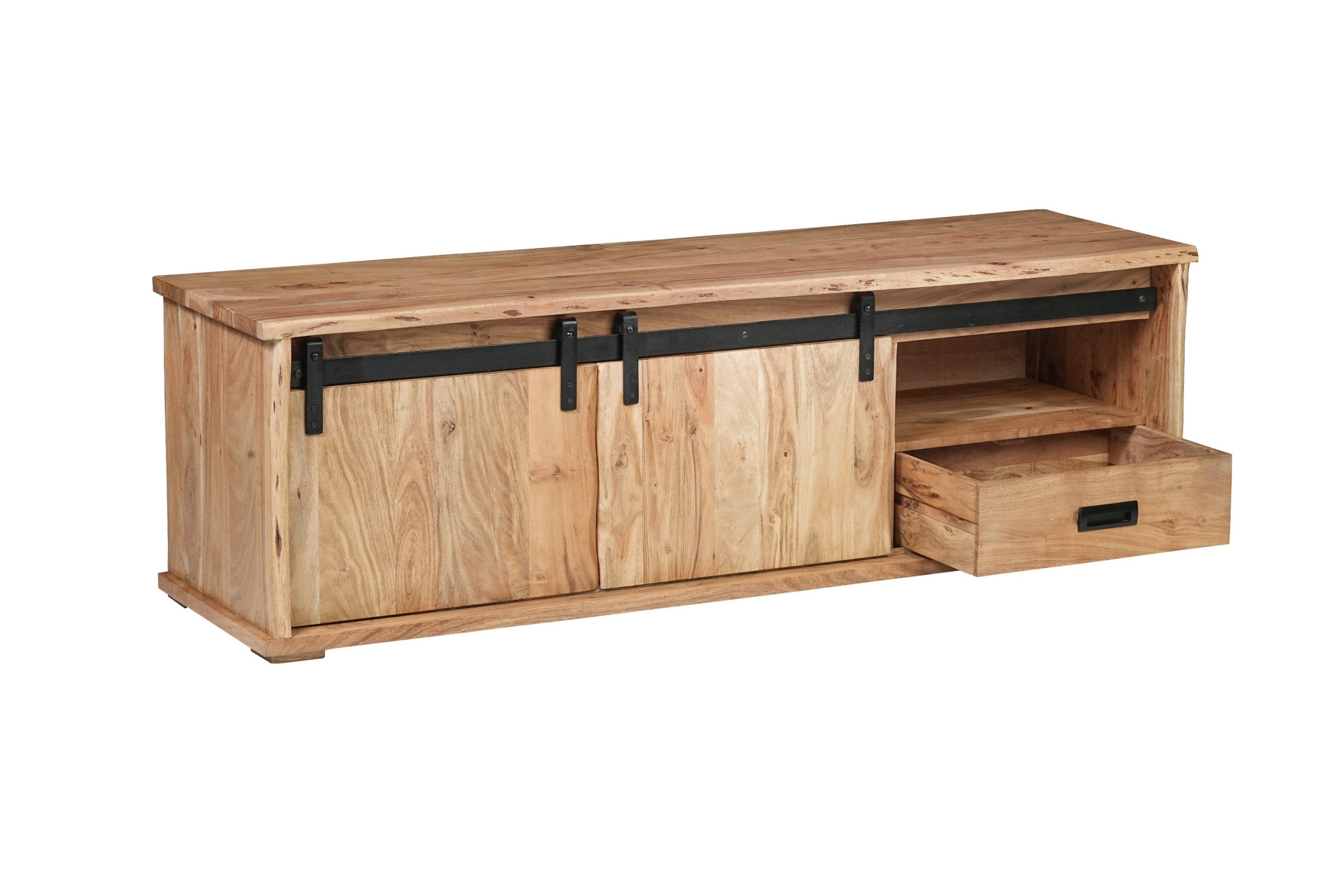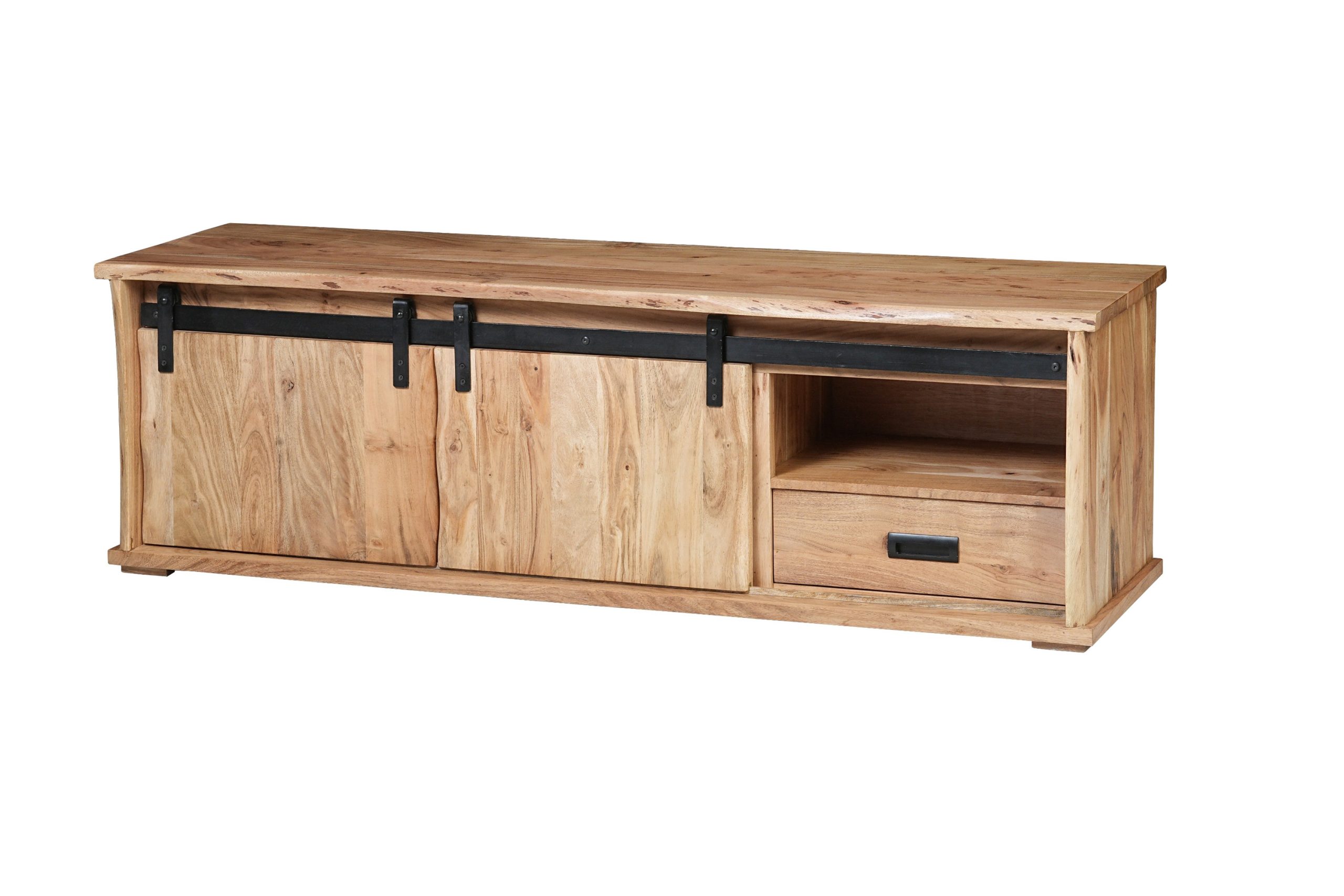 TV-Board Lian III | Akazienholz massiv | Naturfarben | 2 Schiebetüren, 3 Fächer & ein Schubfach | mit Baumkante | 160x45x50 cm