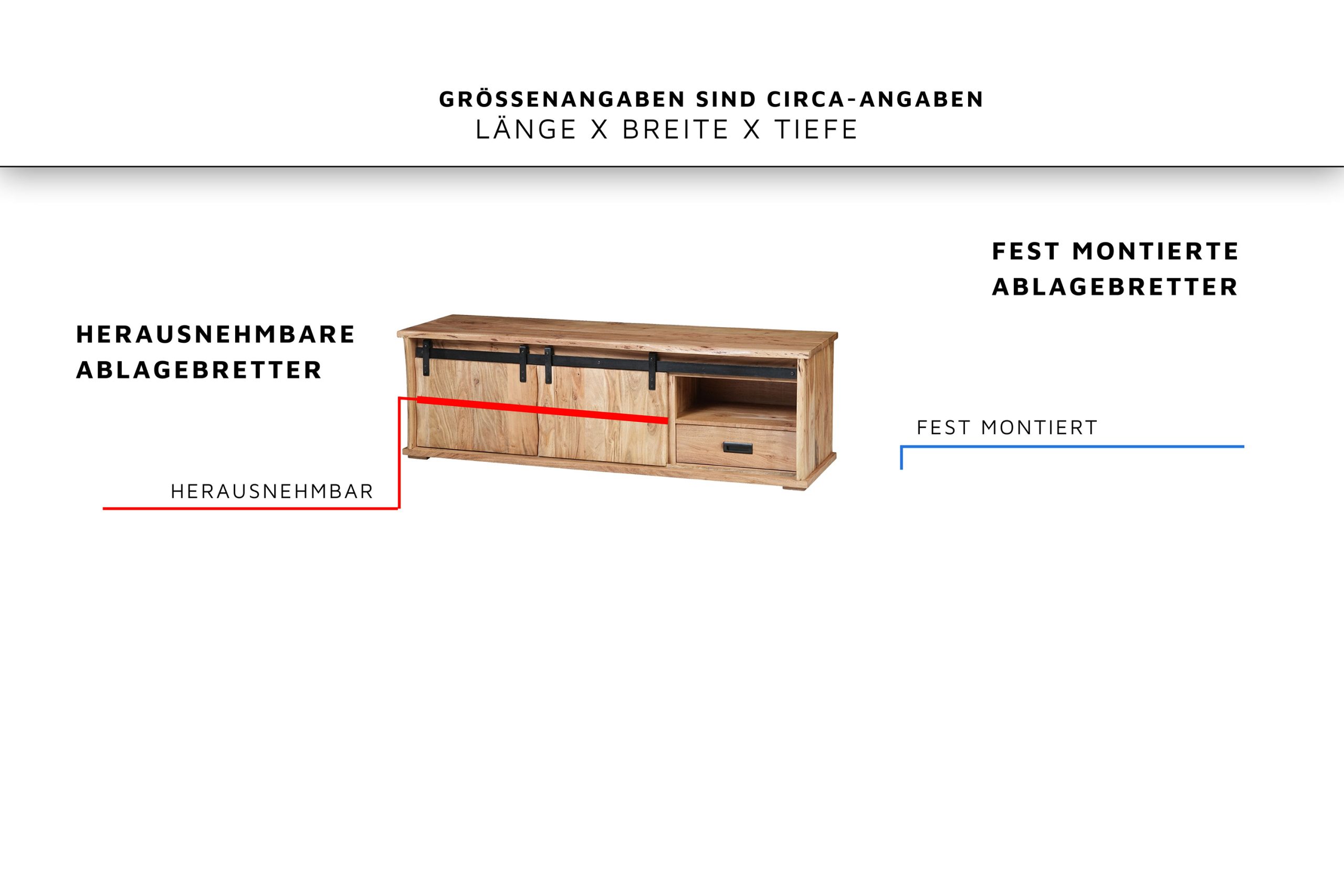 • Die echten Baumkanten der zwei Schiebetüren sowie Deck- & Seitenplatten machen jedes Lowboard zum individuellen und besonderen Unikat.