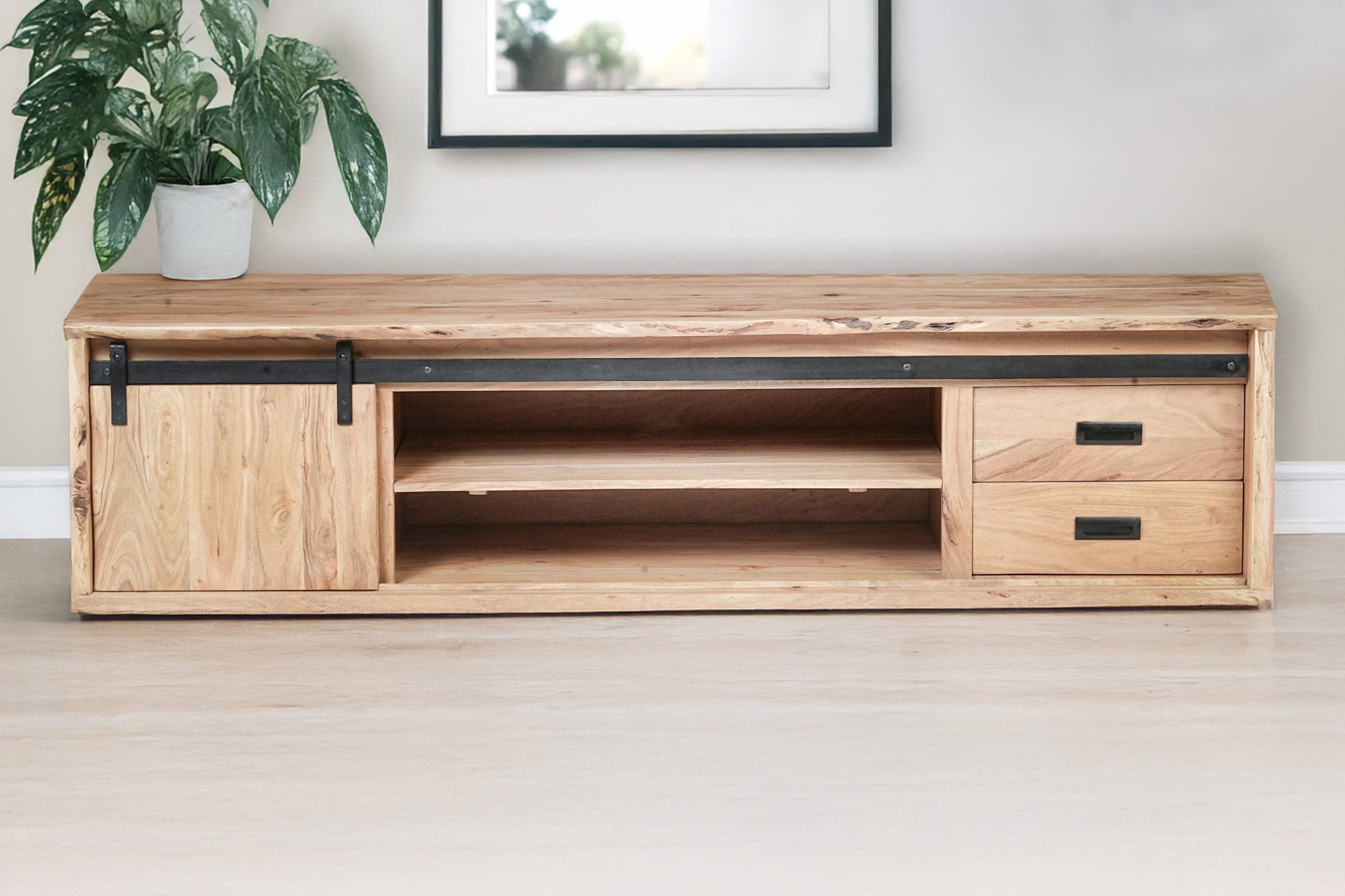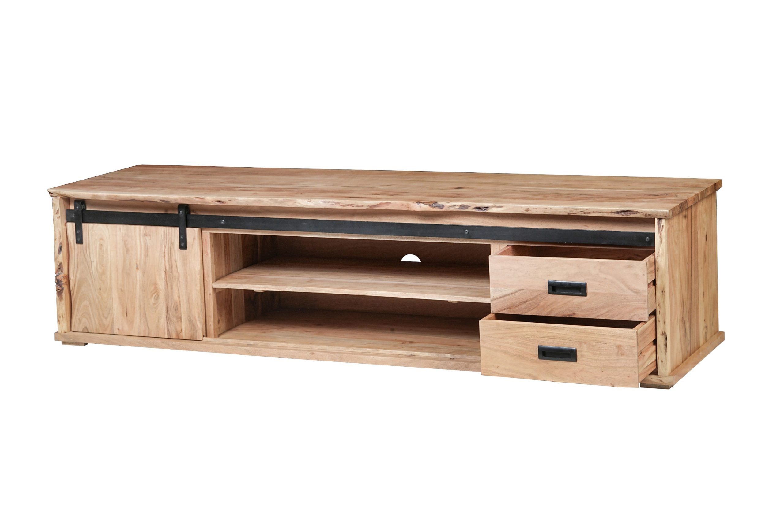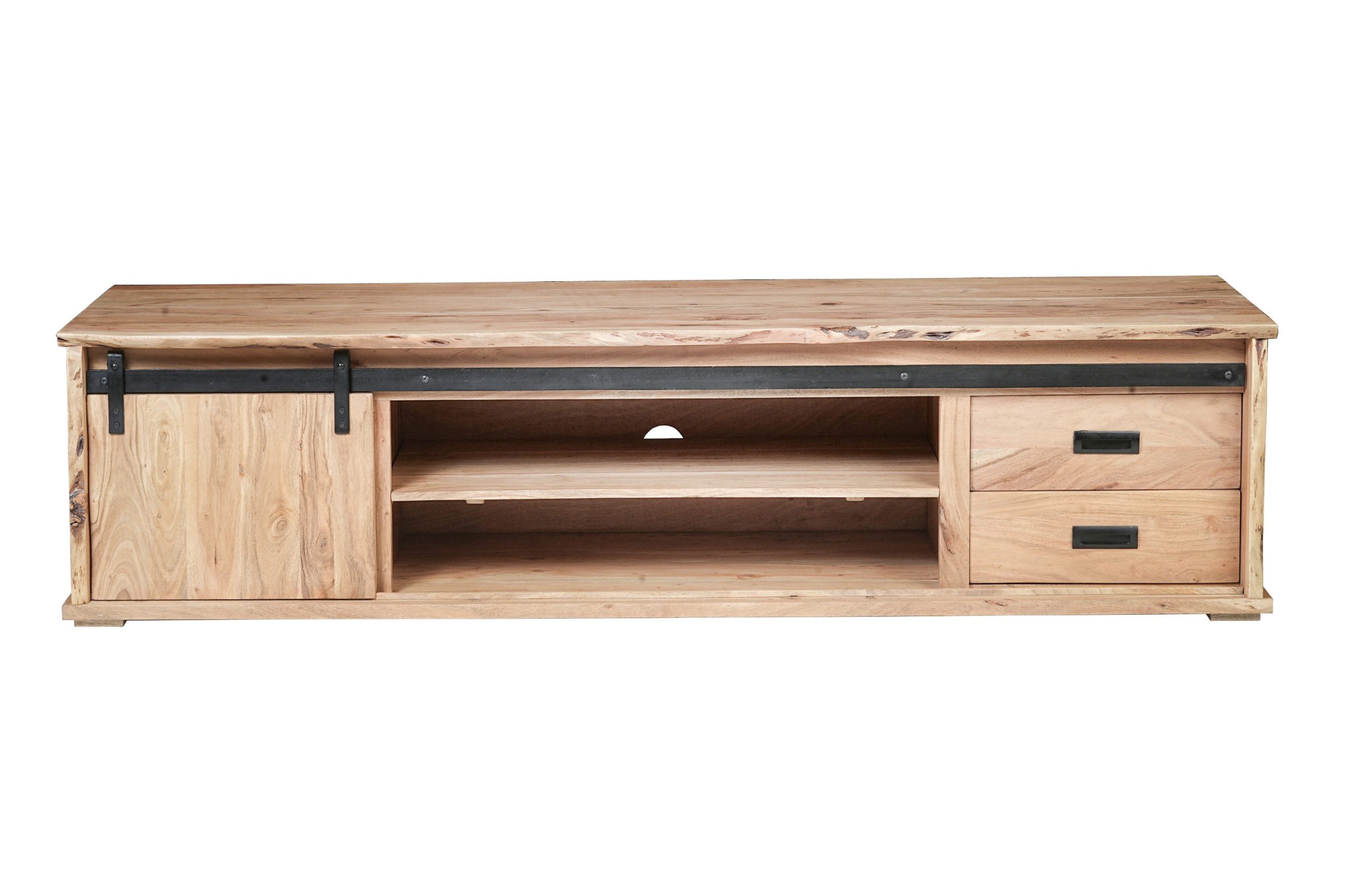 TV-Board Lian II | Akazienholz massiv | Naturfarben | Schiebetür, 4 Fächer & 2 Schubfächer | mit Baumkante | 200x55x50 cm