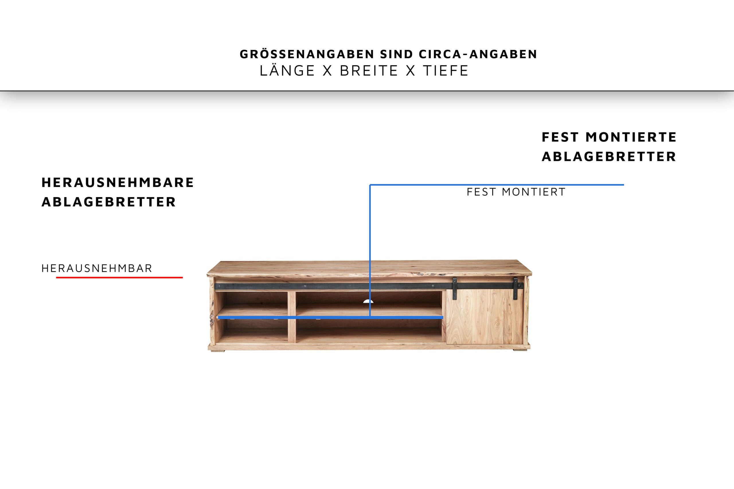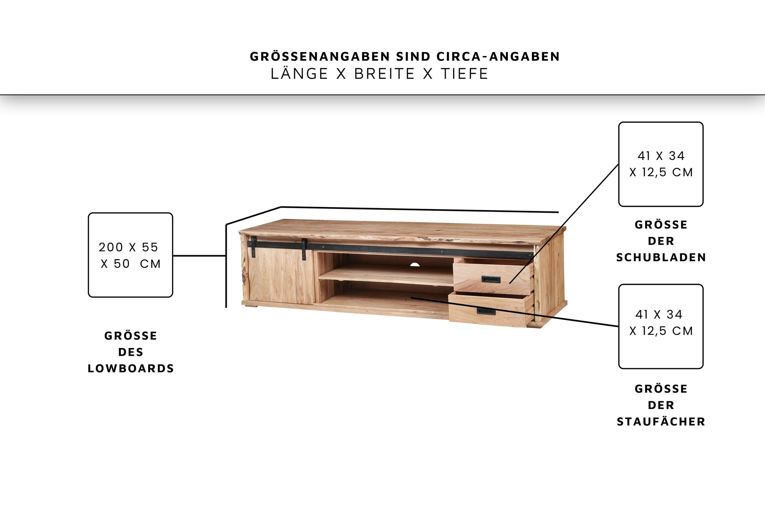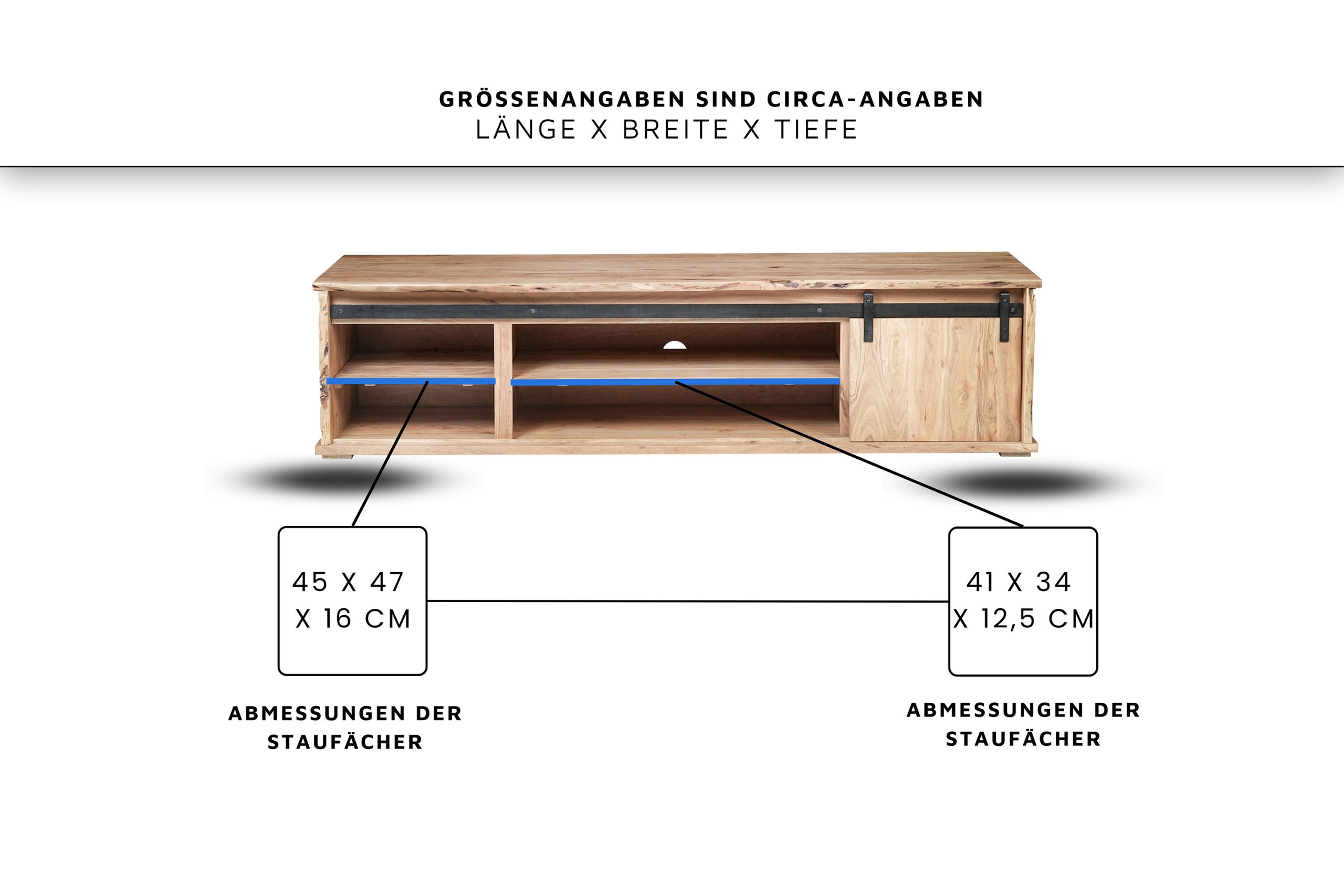 • Die echten Baumkanten der zwei Schiebetüren sowie Deck- & Seitenplatten machen jedes Lowboard zum individuellen und besonderen Unikat.