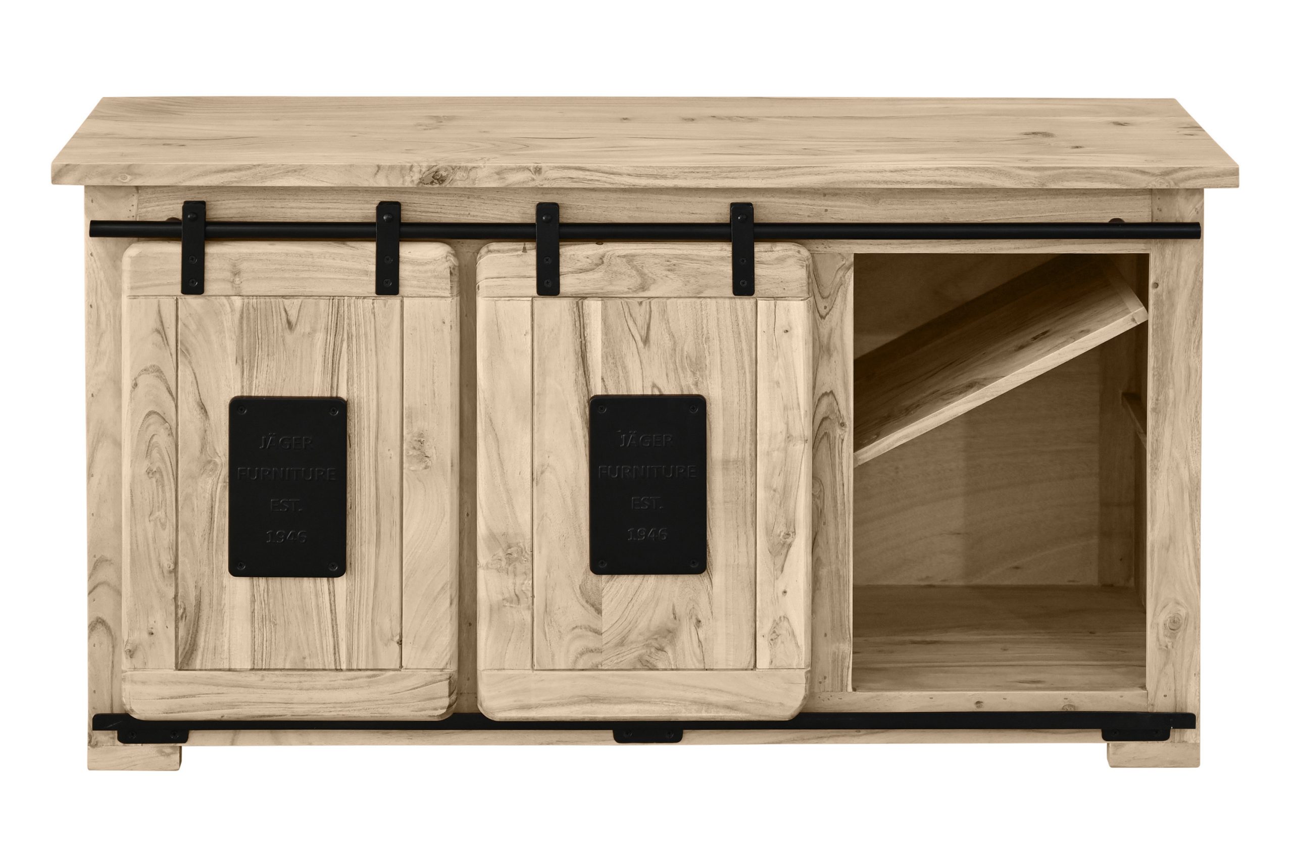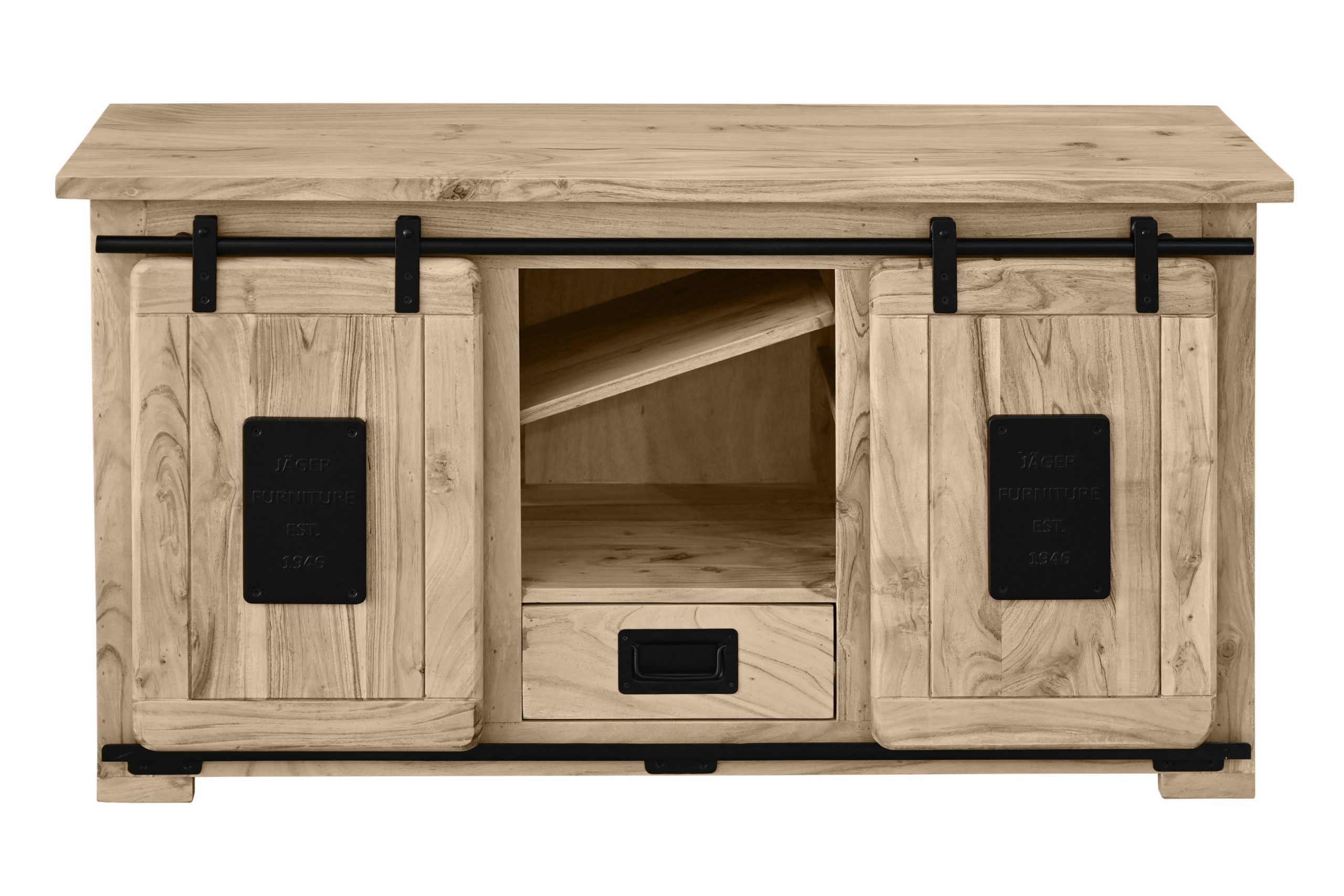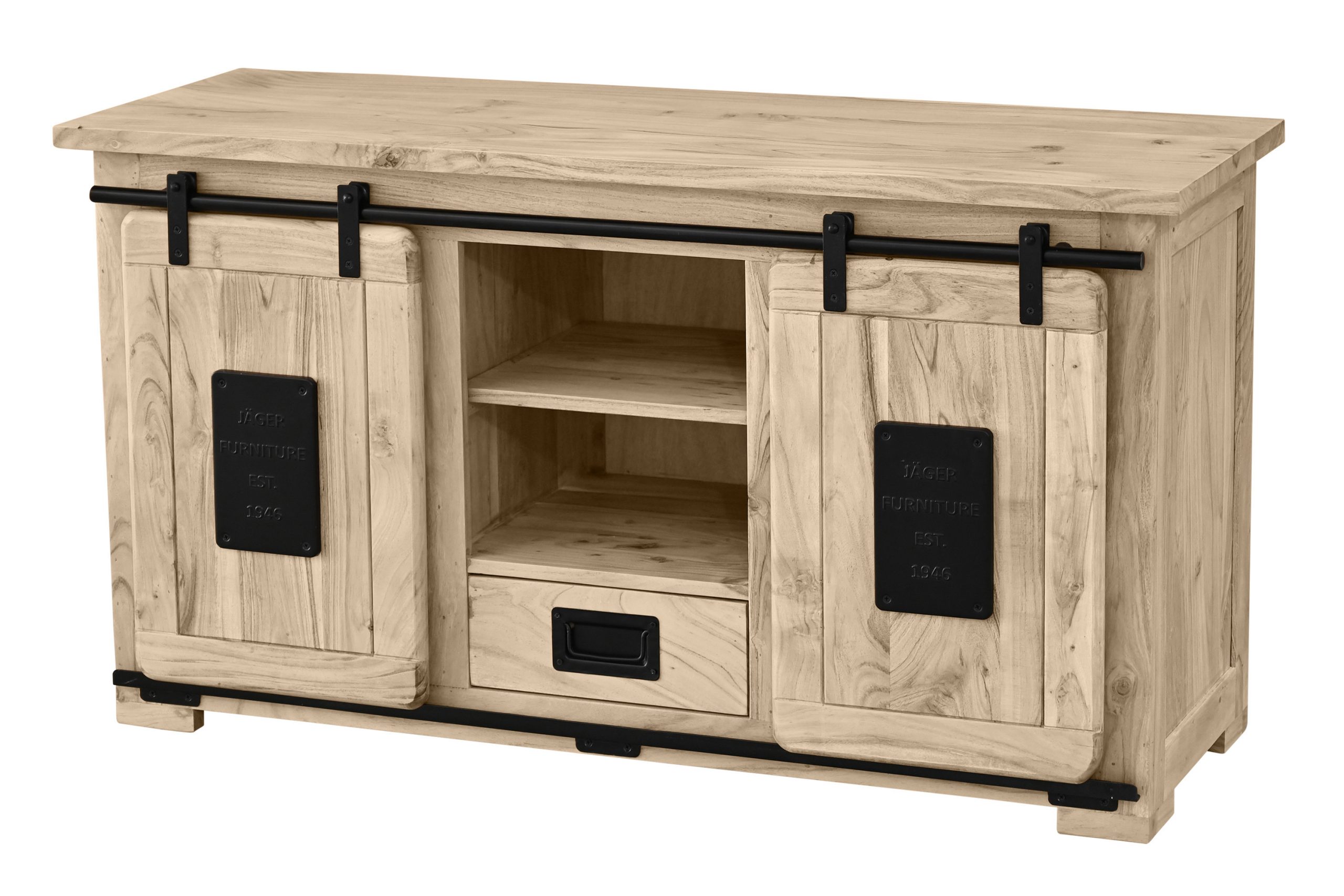 Die beiden Holzschiebetüren laufen sanft auf einer robusten Eisen-Reling mit Metallrollen und ermöglichen bequemen Zugriff. Eine Schublade sowie sechs offene Fächer schaffen viel Platz für Receiver, Konsolen, Blu-Ray-Player oder dekorative Accessoires. Stilvolle Gusseisen-Applikationen runden das Design ab und machen Libro V zu einem echten Hingucker im Industrial- oder Used-Look.