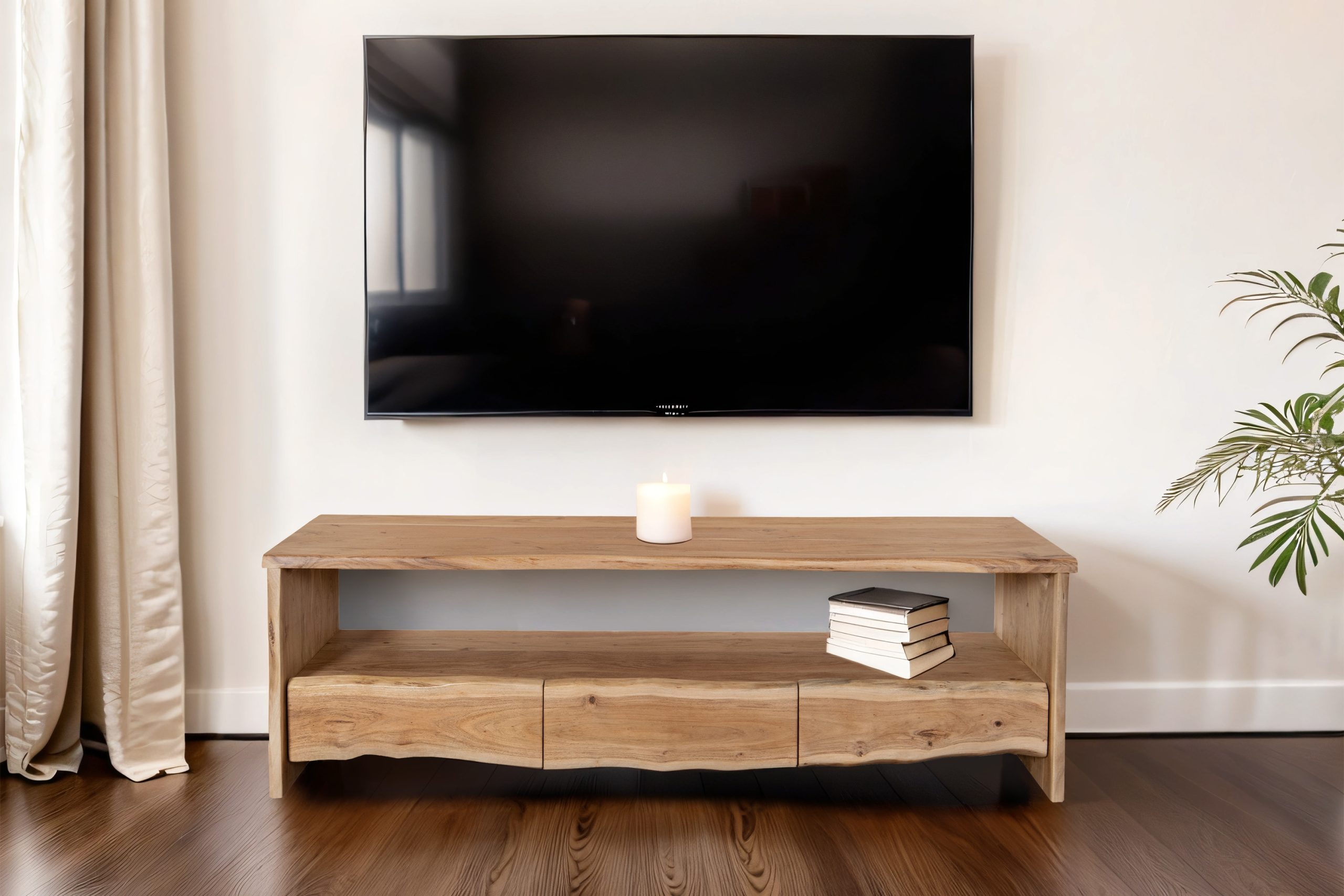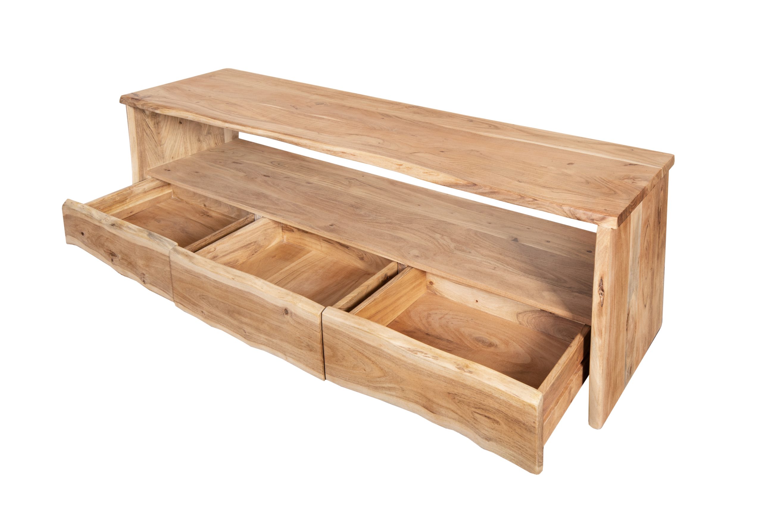 Für dieses Möbelstück wird ausschließlich bestes Akazienholz verwendet. Dies verleiht dem TV-Board eine hochwertige Qualität und ansprechende Optik. Jedes Exemplar besitzt zudem eine individuelle Maserung und ist daher ein Unikat. Mit drei Schubfächern und einem offenen Fach ausgestattet, bietet die TV-Kommode genügend Stauraum für DVD´s, Blu-Ray´s, Fernbedienungen und viele weitere Gegenstände. In den offenen Fächern können Receiver und Blu-Ray-Player platziert werden.
