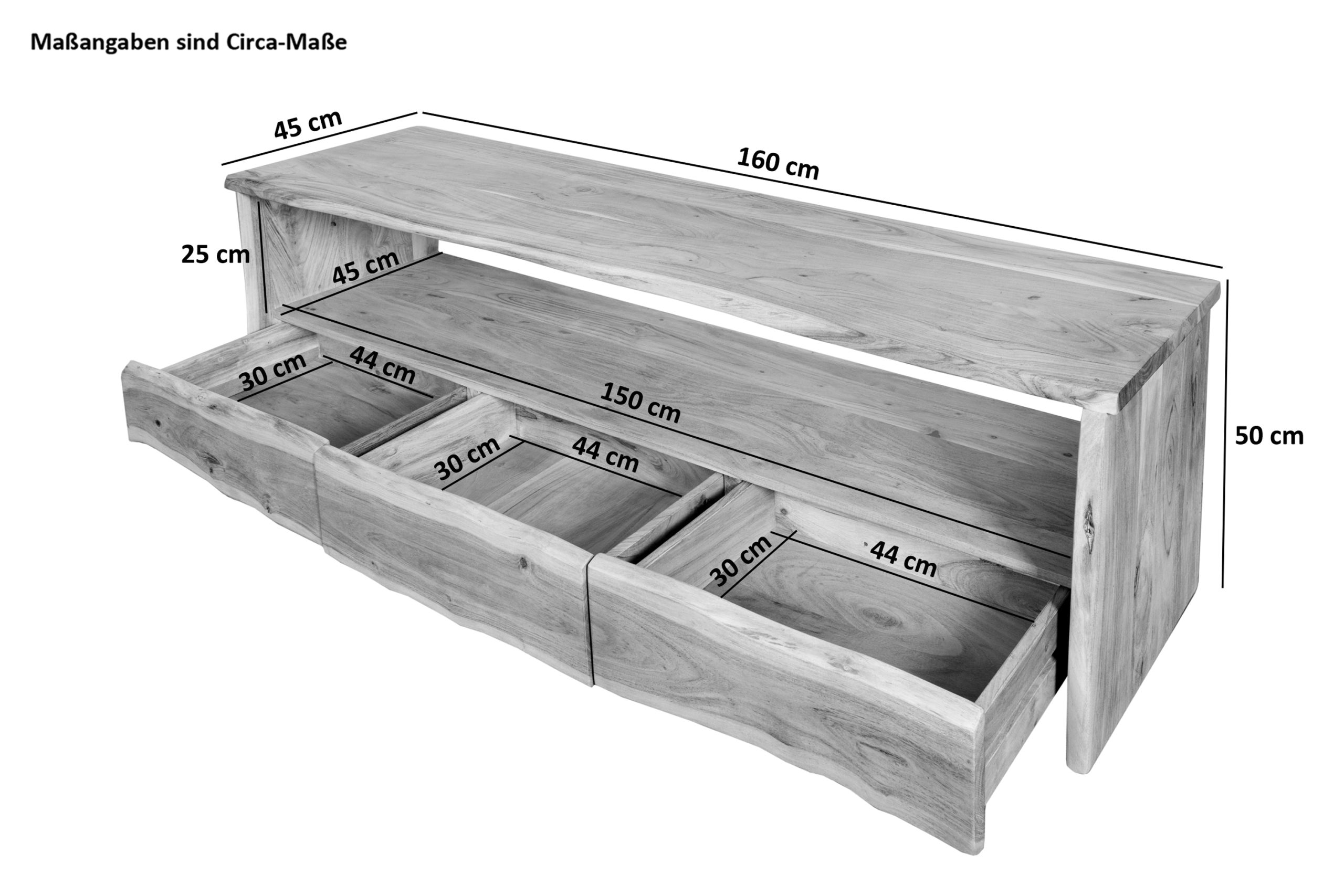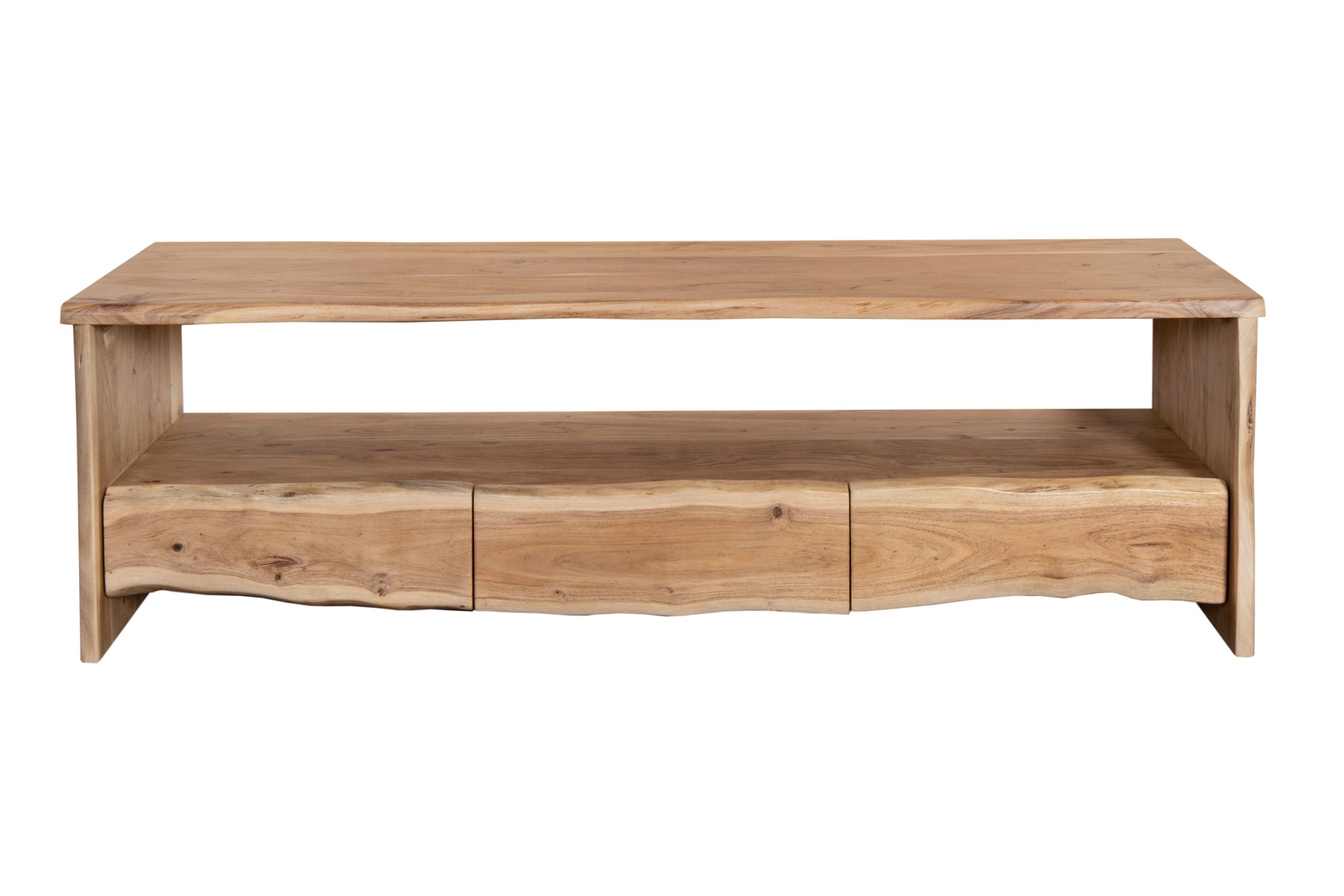 Hochwertiges Lowboard Dahlia I, Akazienholz naturfarben, massiv & lackiert, mit je 3 Schubladen & offenem Fach, echte Baumkante, 160 x 45 x 50 cm