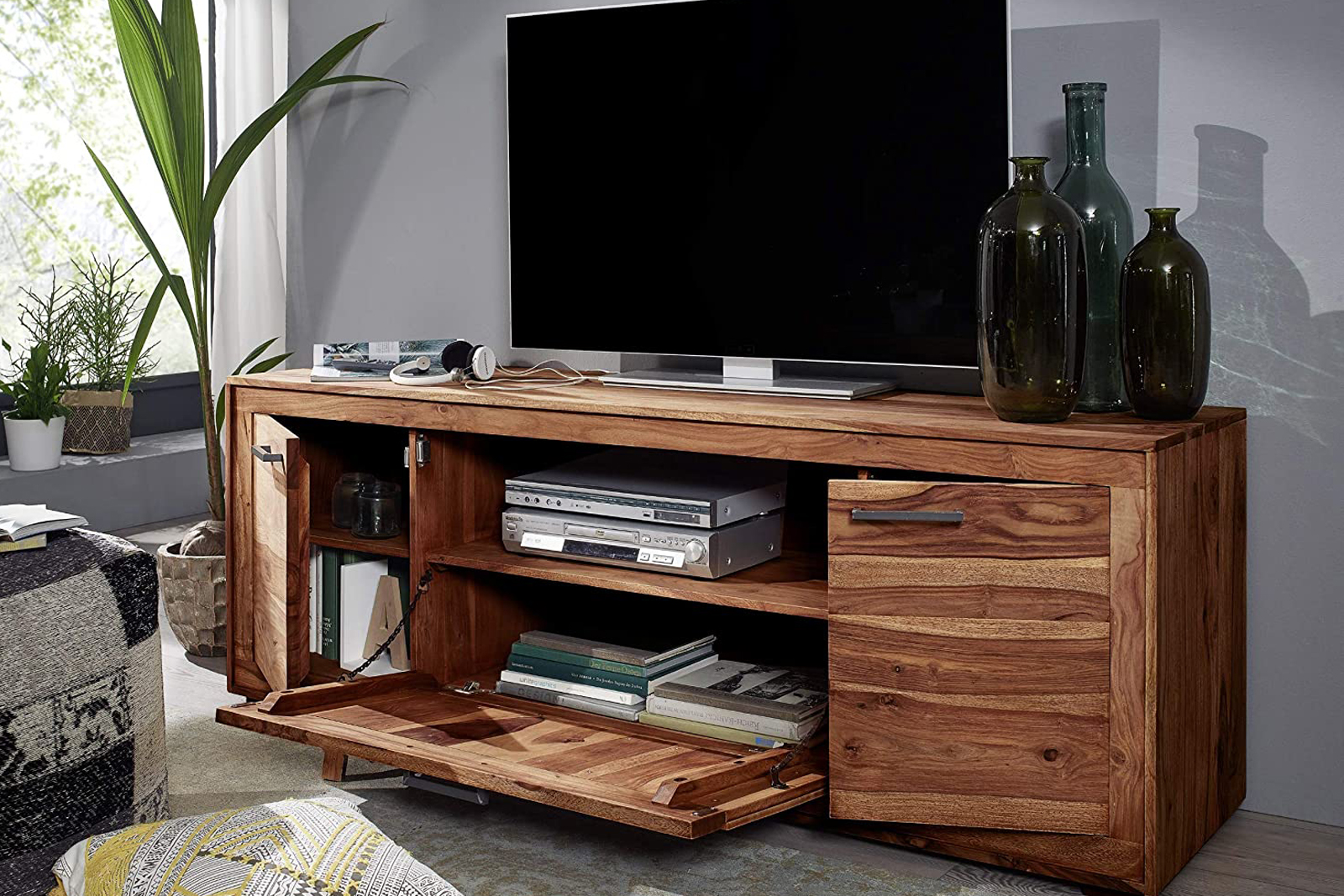 - Das TV-Lowboard besteht aus massivem Akazienholz. Das Holz ist nussbaumfarben lackiert.
