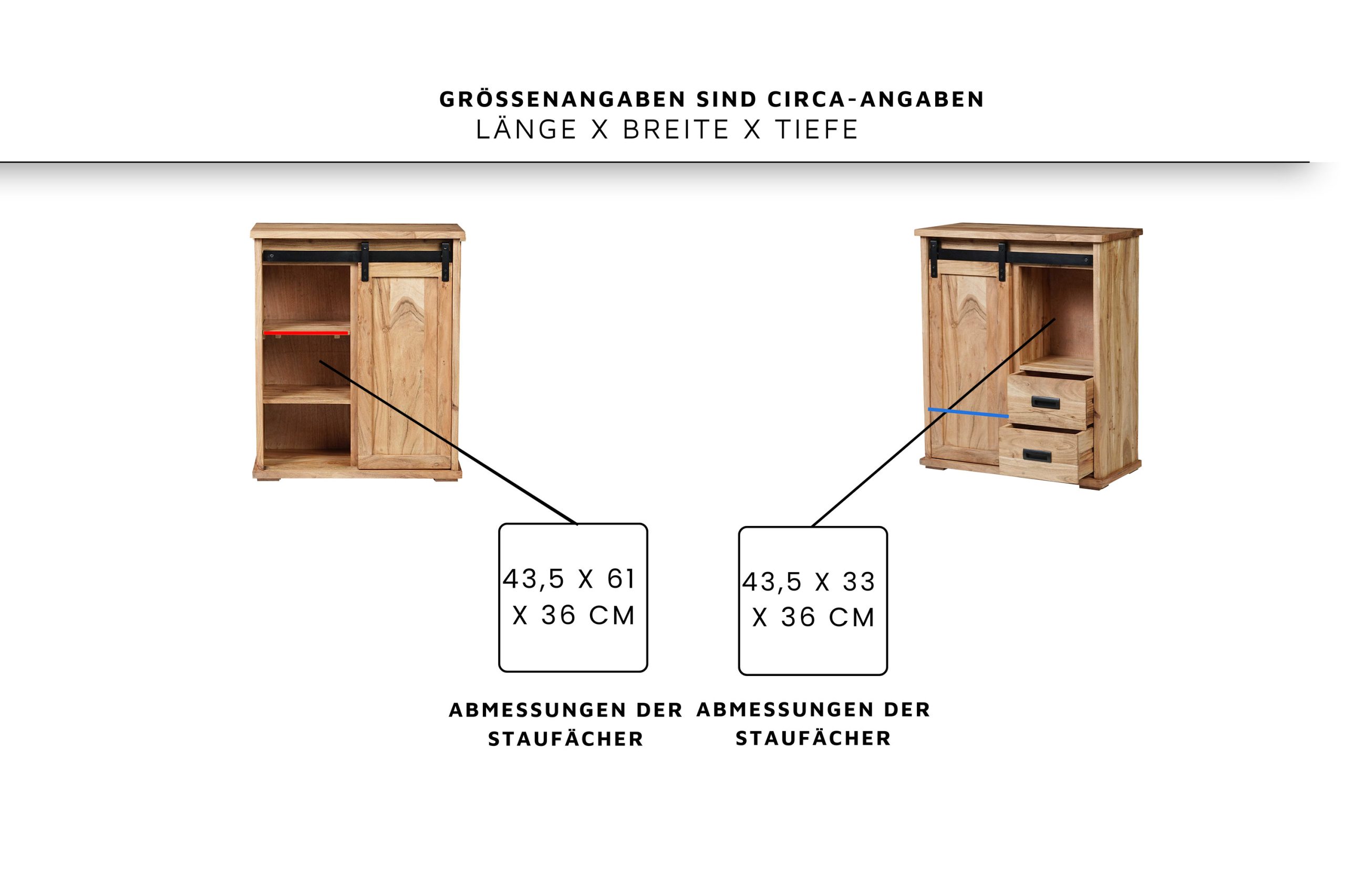 - Die gusseiserne Laufschiene und Griffe unterstreichen den angesagten Industrial-Style und gewährleisten eine leichtgängige Bedienung der Türen & Schubladen.