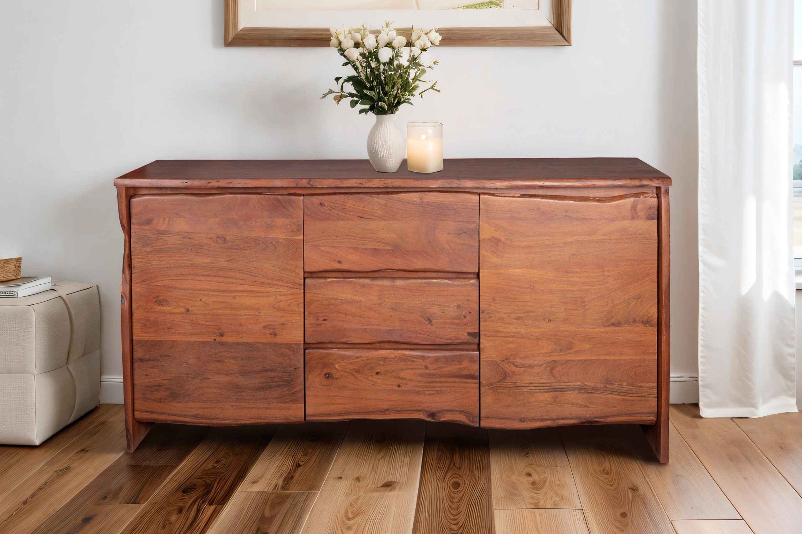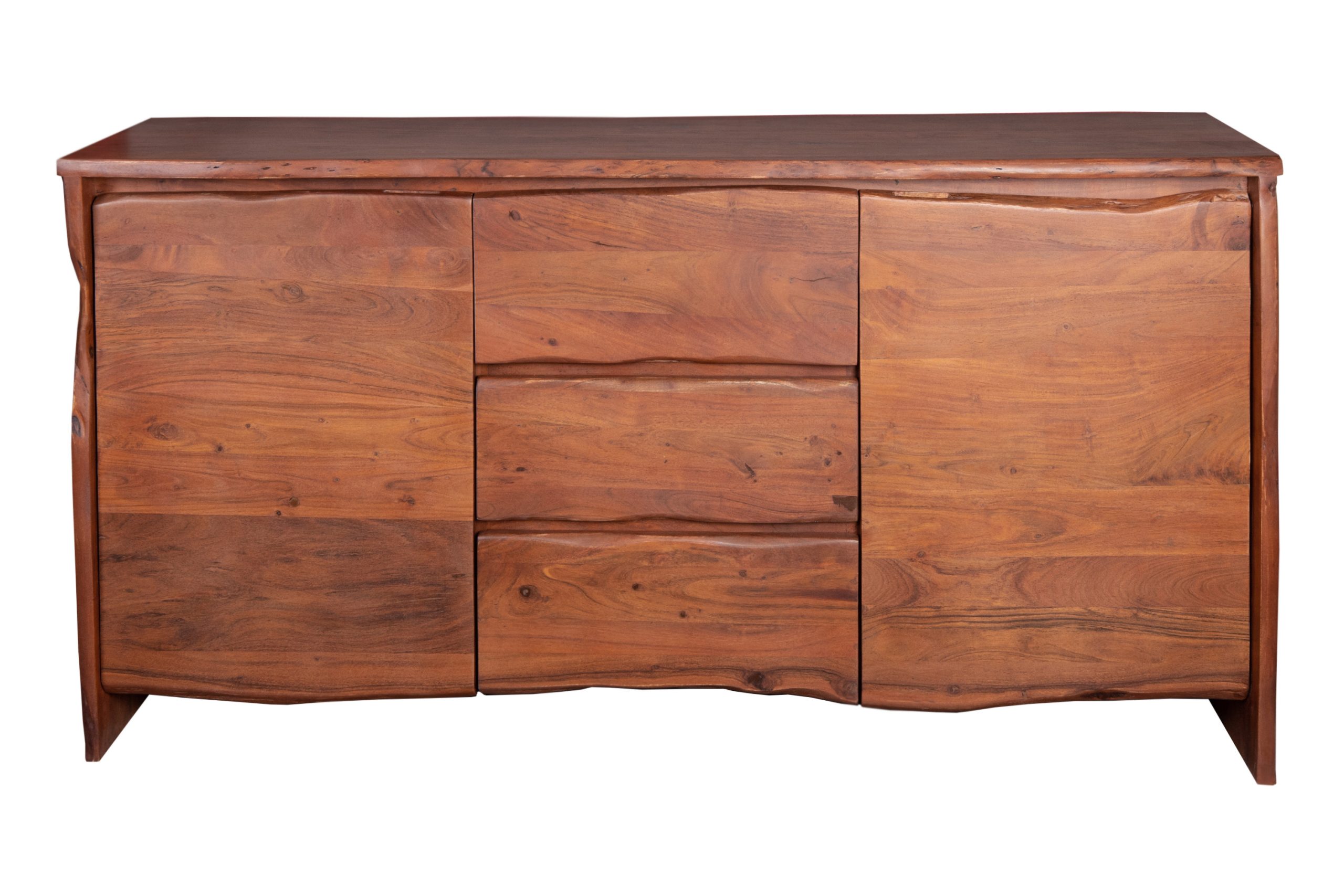 Hochwertiges Sideboard Dahlia I, Akazienholz nussbaumfarben, massiv & lackiert, mit 2 Türen & 3 Schubladen, echte Baumkante, 170 x 45 x 90 cm