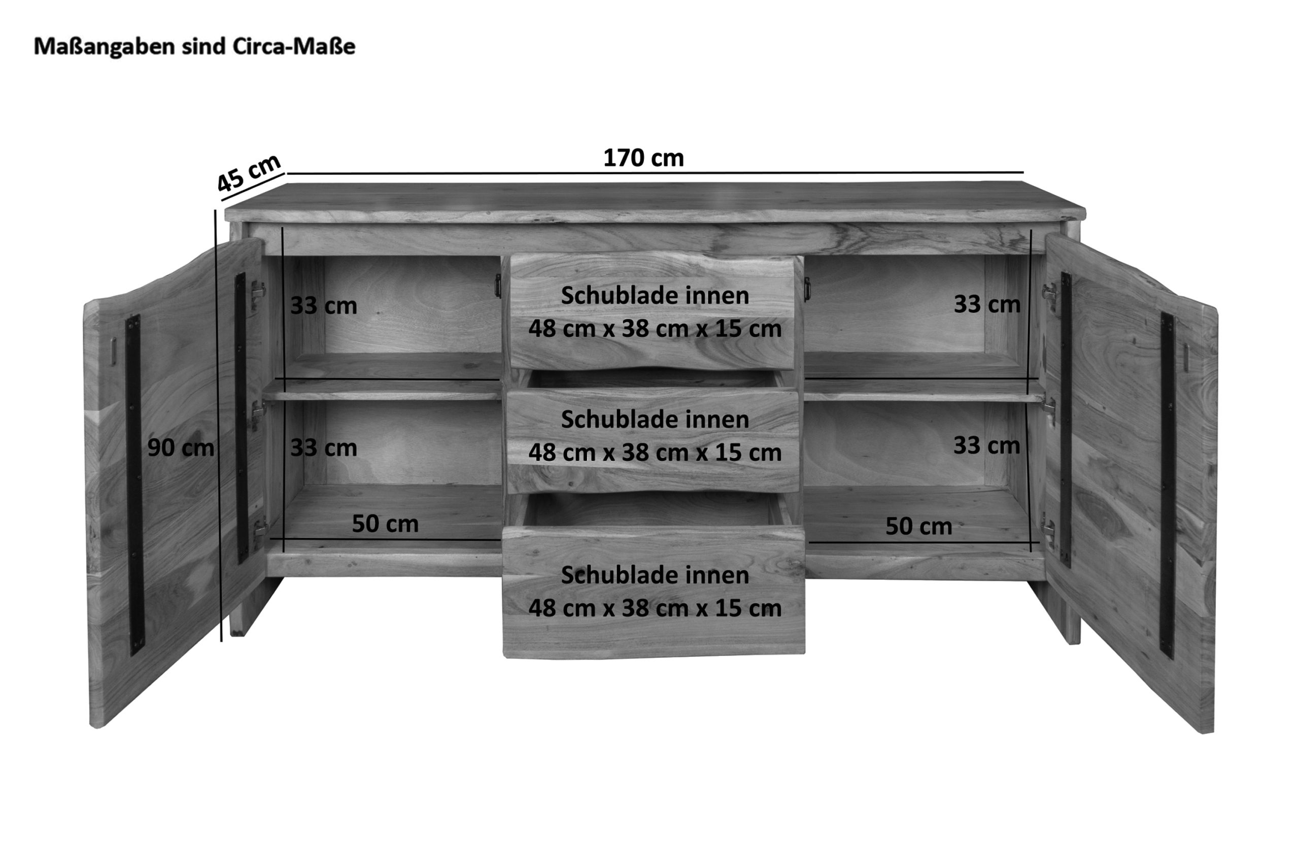 Für dieses Möbelstück wird ausschließlich bestes Akazienholz verwendet. Dies verleiht der Kommode eine hochwertige Qualität und ansprechende Optik. Jedes Exemplar besitzt zudem eine individuelle Maserung und ist daher ein Unikat. Mit zwei Türen und drei Schubladen ausgestattet, bietet das Sideboard genügend Stauraum für Geschirr, Tischwäsche und andere Gegenstände. Zusätzlich kann das moderne Sideboard mit Deko-Elementen geschmückt und stilvoll präsentiert werden.