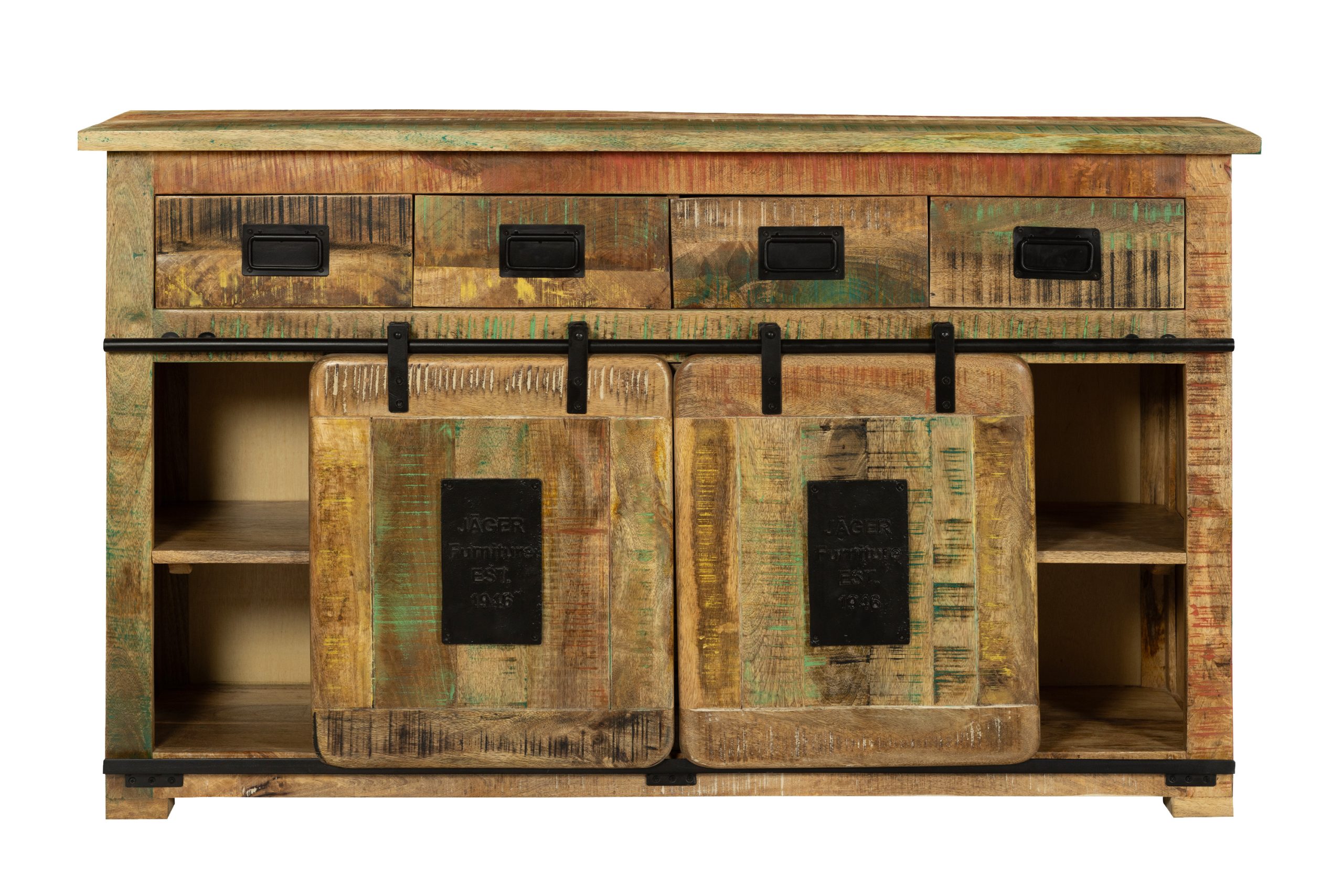 Trendiges Sideboard Libro II, Mangoholz massiv & bunt, 7 Schubladen & 2 offene Fächer, 2x Holzrolltür, 150 x 90 x 45 cm