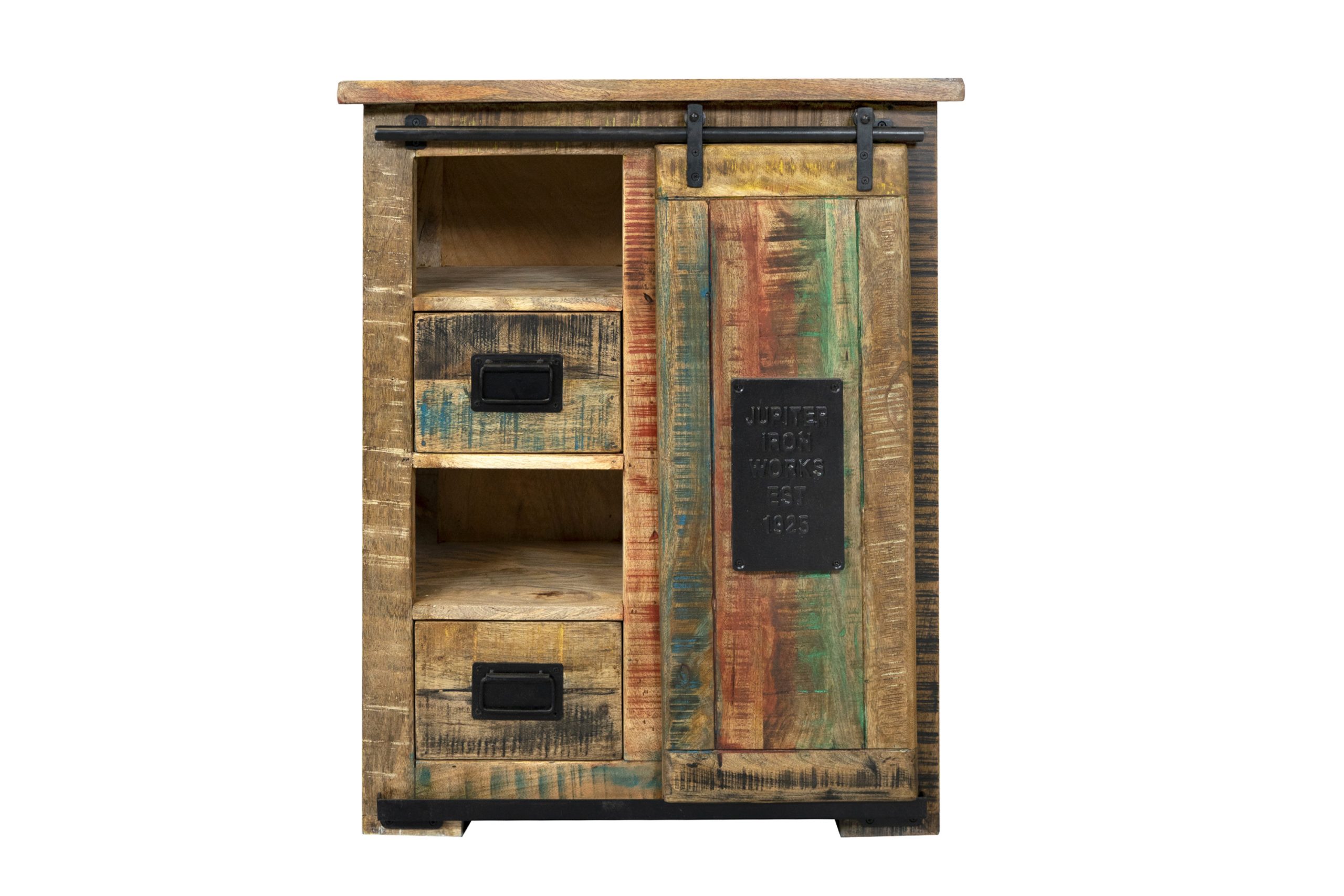 Trendiges Sideboard Libro I, Mangoholz massiv & bunt, 2 Schubladen & 4 offene Fächer, Holzrolltür, 75 x 90 x 36 cm