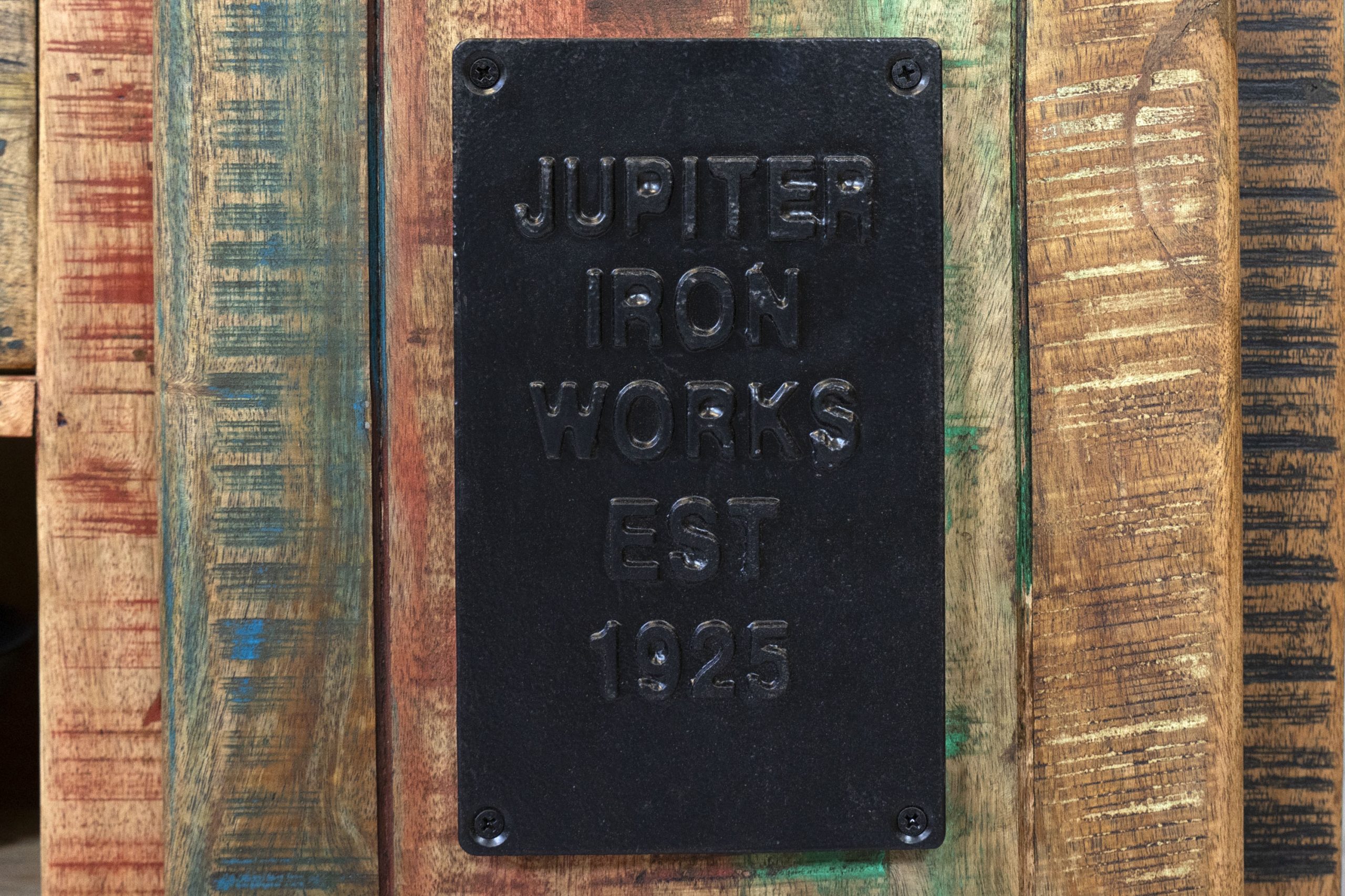 Die Kommode besitzt verschiedene Metallelemente. Die Schiebetür besitzt eine Eisen-Reling und Metallrollen mit deren Hilfe Sie die Tür nach rechts und links schieben können. An der Tür befindet sich eine stilvolle Applikation aus Gusseisen. Alle Schubfächer besitzen stilgerechte Griffe aus Eisen. Der Schrank harmoniert bestens mit anderen Wohnmöbeln aus den Stilrichtungen Industrial oder dem Shabby Chic.