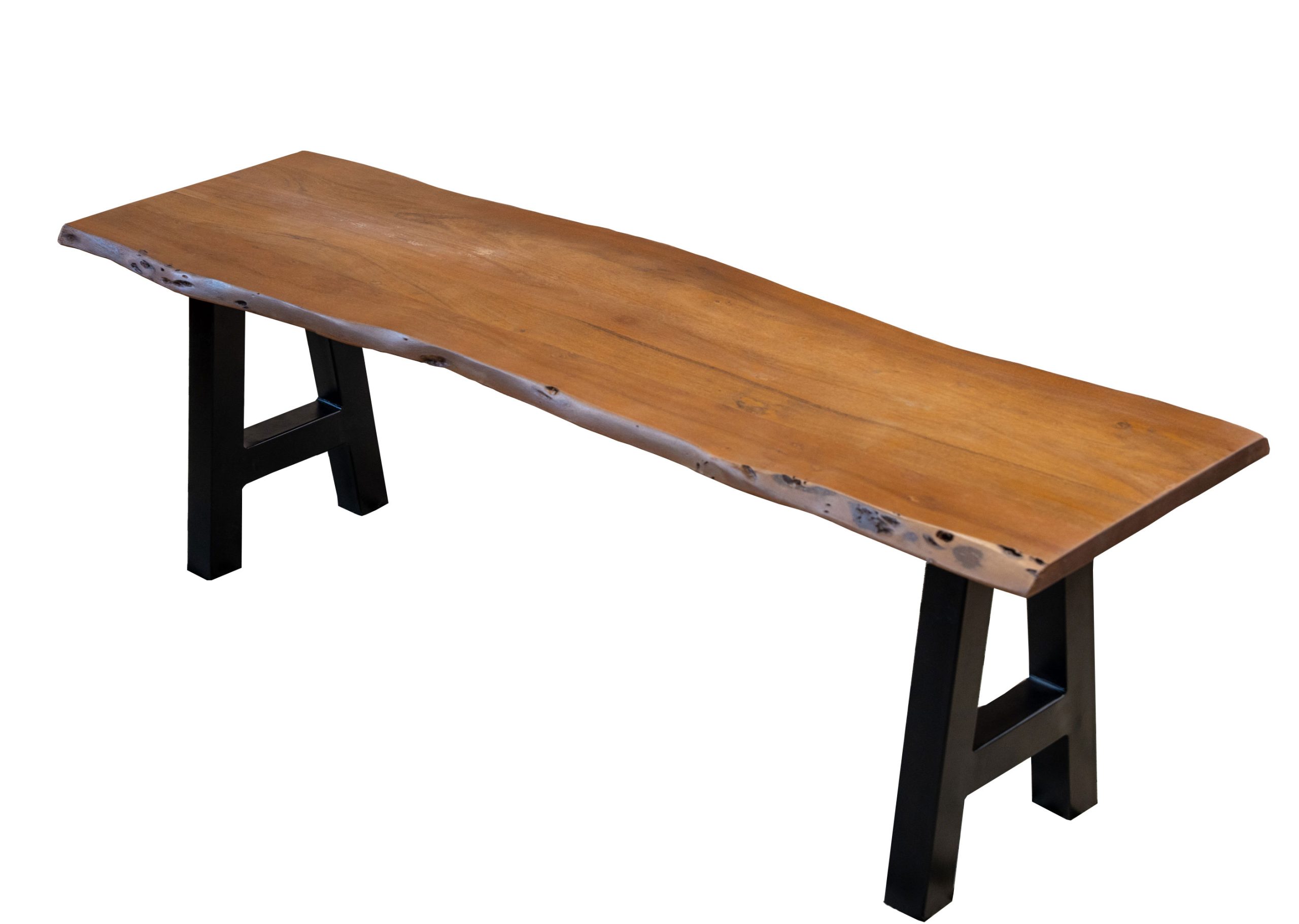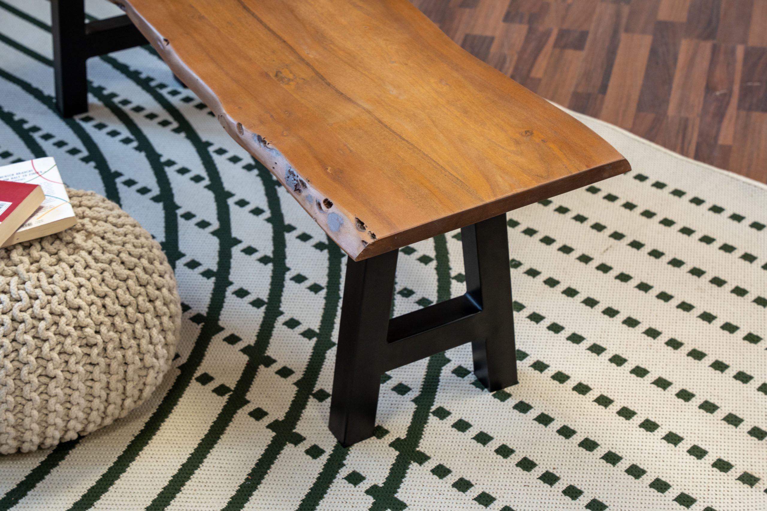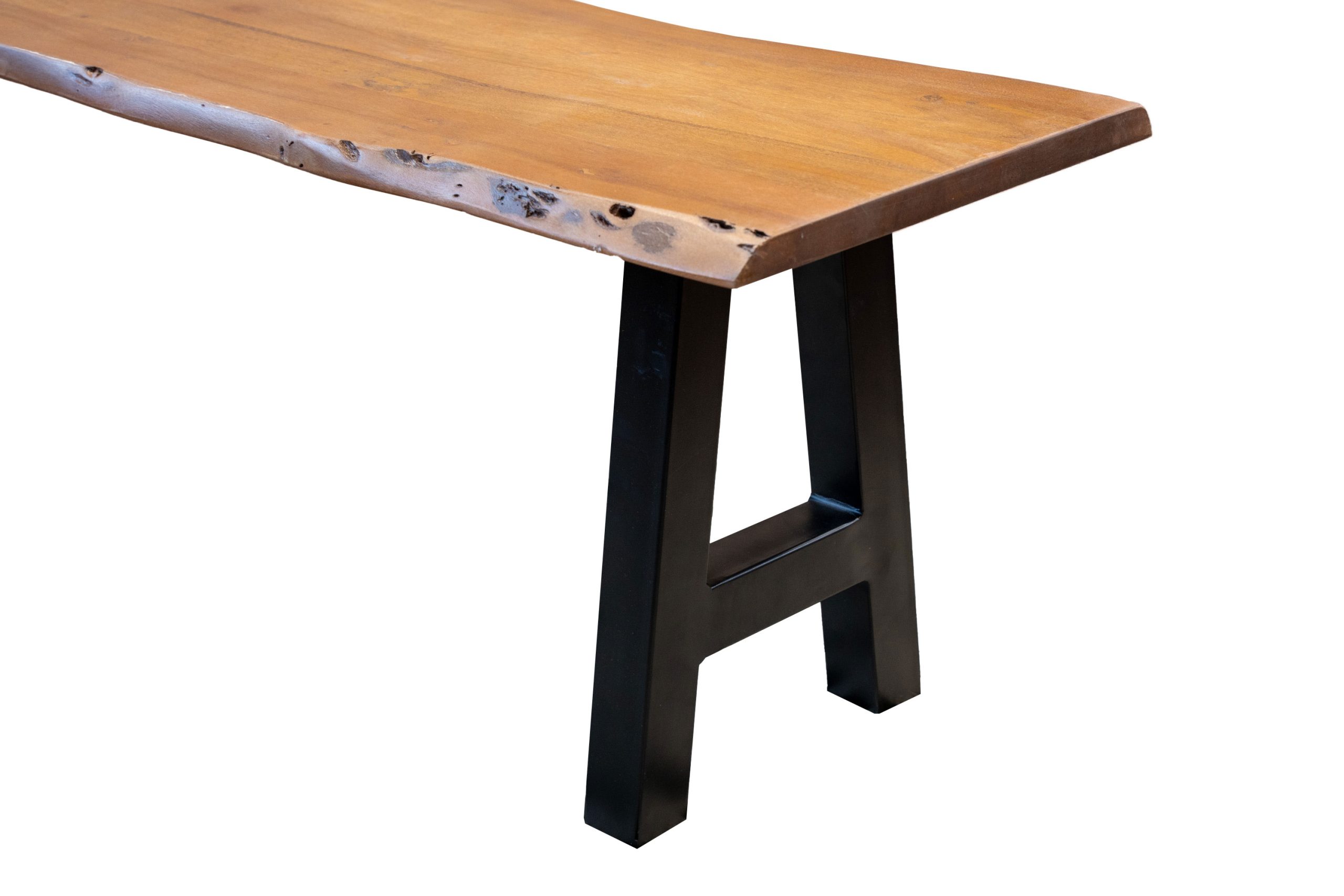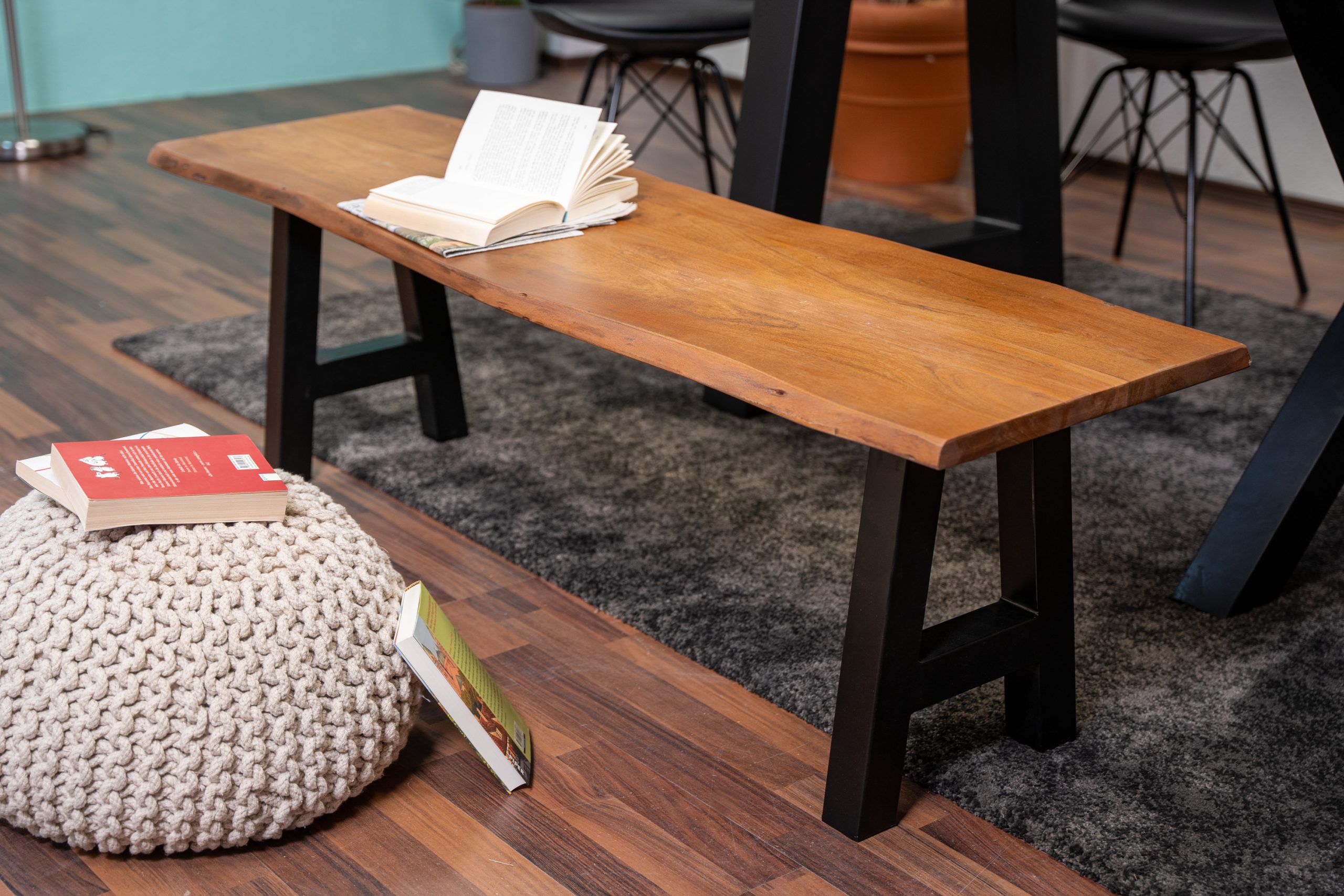 Stilvolle Sitzbank Quintus, Akazienholz massiv + nussbaumfarben, 140x42cm, echte Baumkante, A-Gestell aus Metall Schwarz