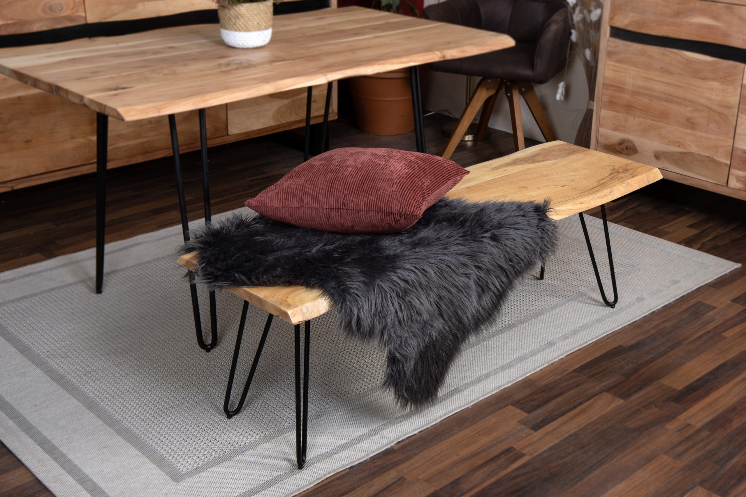 Die Sitzfläche ist aus massiver Akazie gefertigt und besteht aus echter und naturbelassener Baumkante. Durch die naturbelassene Optik kann es zu Astlöchern oder unterschiedlichen Farbschmückungen kommen. Diese Unterschiede sind kein Reklamationsgrund, sondern unterstreichen den einzigartigen Charme dieses Möbelstücks.