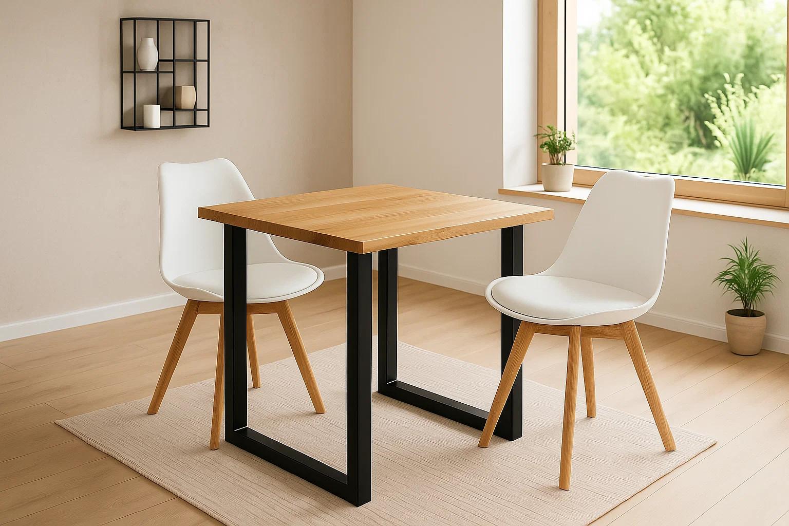 3 tlg. Tischgruppe Serra | 90 x 90 cm | Eiche massiv | U-Gestell Schwarz | Echte Baumkante | 2x Schalenstühle Weiß