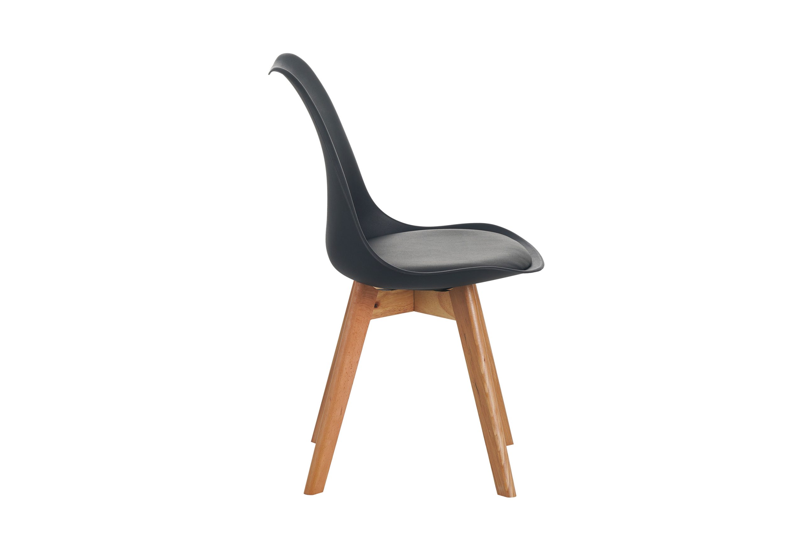 Abgerundet wird das Set durch bequeme Schalenstühle mit schwarzer Sitzschale und gepolstertem Kissen. Das elegante Vierfußgestell aus eichefarbenem Massivholz passt optisch perfekt zum Tisch und bietet zugleich Stabilität und Gemütlichkeit.