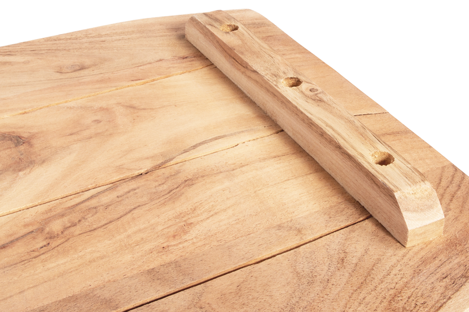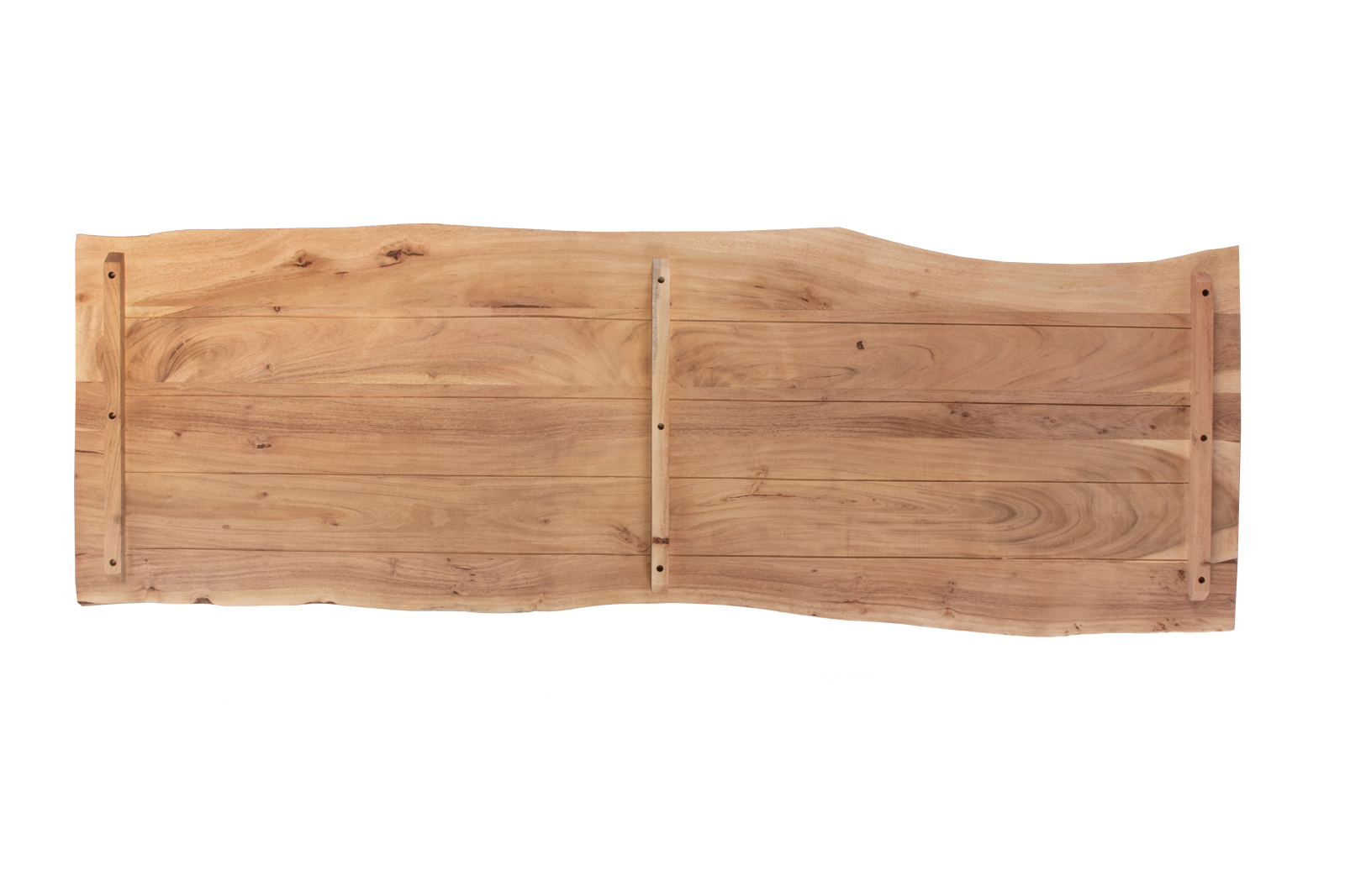 An der Unterseite der Tischplatte befinden sich keine Bohrlöcher, sondern lediglich zwei Gratleisten, welche die Holzplanken miteinander verbinden und vor verziehen schützen. Diese Leisten können abmontiert oder versetzt werden, wenn Sie z.B. ein Regal oder ein Fensterbrett daraus herstellen möchten.