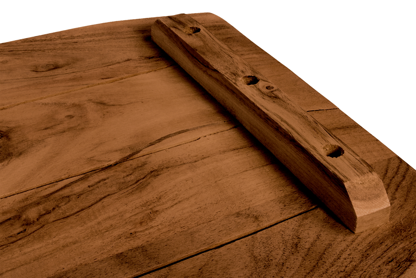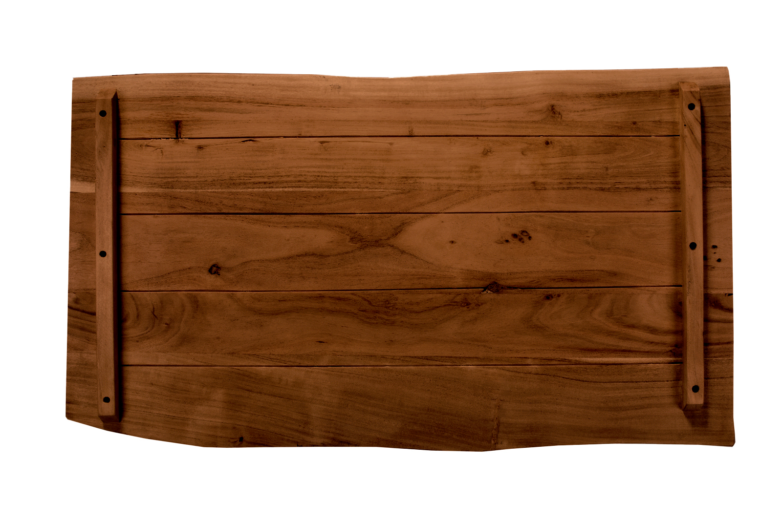 An der Unterseite der Tischplatte befinden sich keine Bohrlöcher, sondern lediglich zwei Gratleisten, welche die Holzplanken miteinander verbinden und vor verziehen schützen. Diese Leisten können abmontiert oder versetzt werden, wenn Sie z.B. ein Regal oder ein Fensterbrett daraus herstellen möchten.