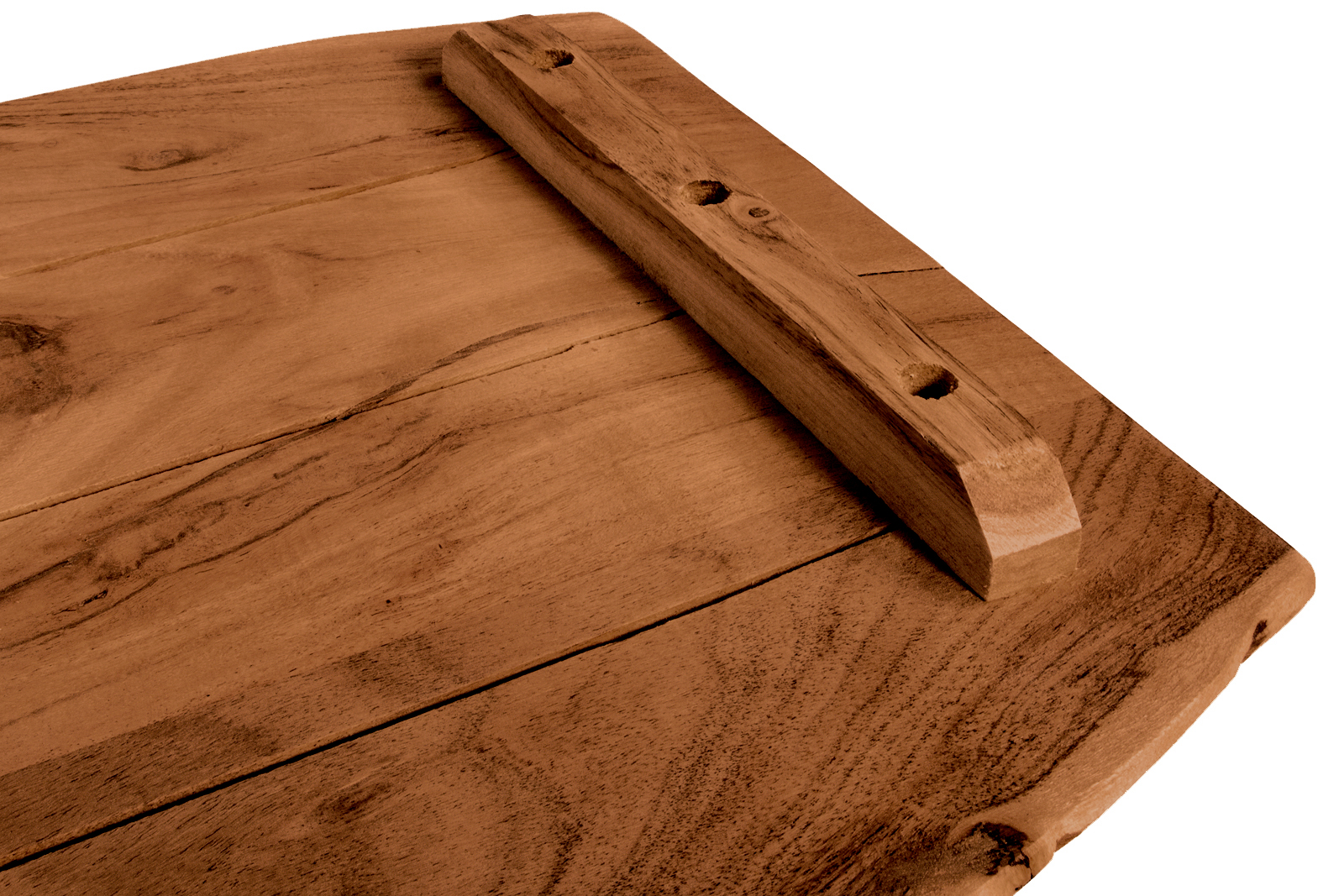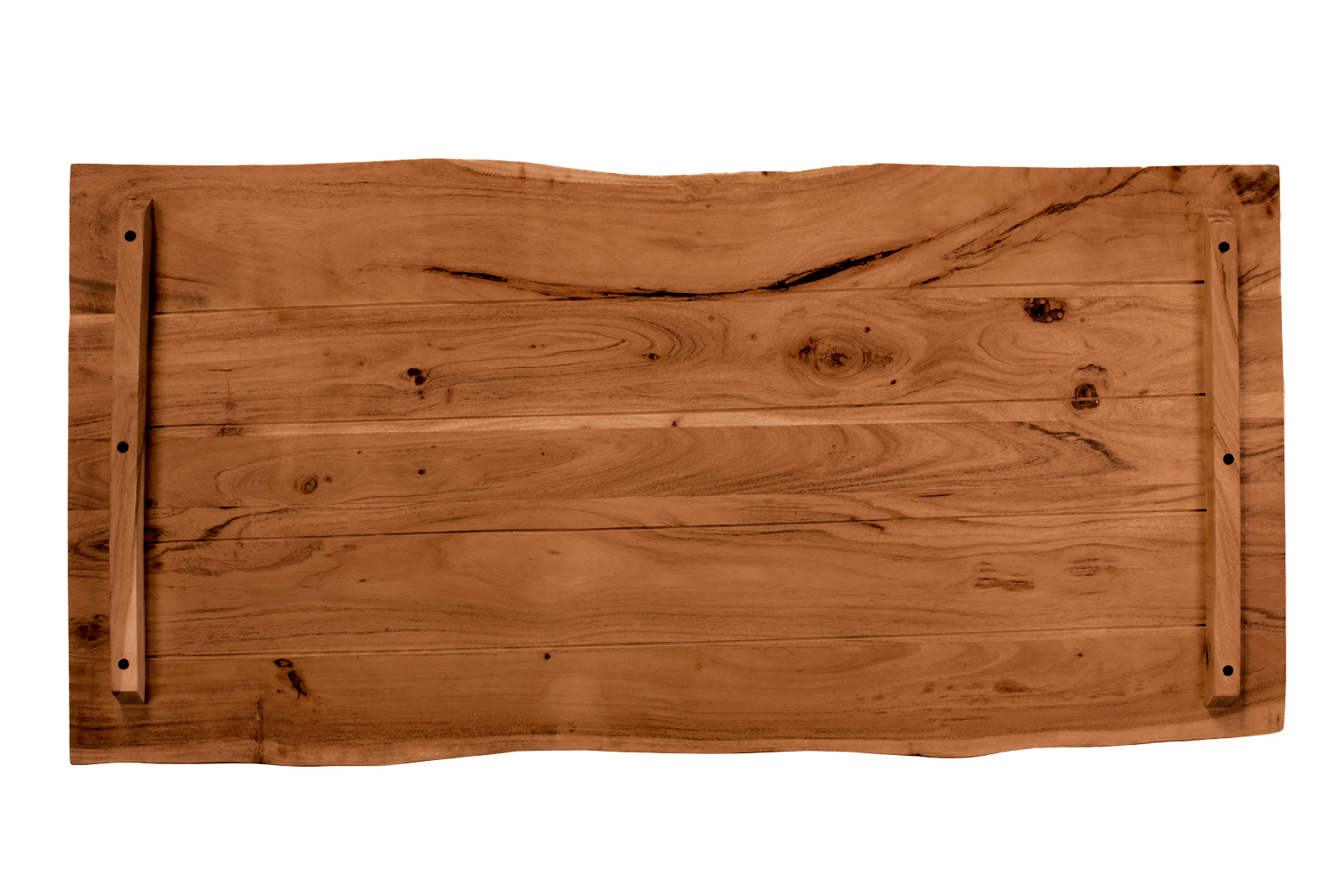 An der Unterseite der Tischplatte befinden sich keine Bohrlöcher, sondern lediglich zwei Gratleisten, welche die Holzplanken miteinander verbinden und vor verziehen schützen. Diese Leisten können abmontiert oder versetzt werden, wenn Sie z.B. ein Regal oder ein Fensterbrett daraus herstellen möchten.