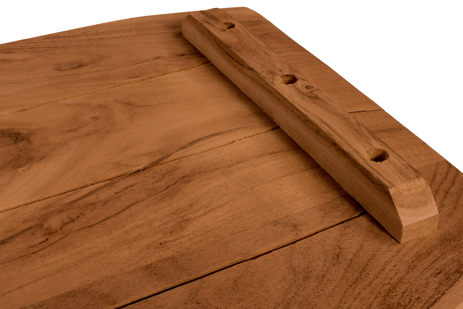 An der Unterseite der Tischplatte befinden sich keine Bohrlöcher, sondern lediglich zwei Gratleisten, welche die Holzplanken miteinander verbinden und vor verziehen schützen. Diese Leisten können abmontiert oder versetzt werden, wenn Sie z.B. ein Regal oder ein Fensterbrett daraus herstellen möchten.