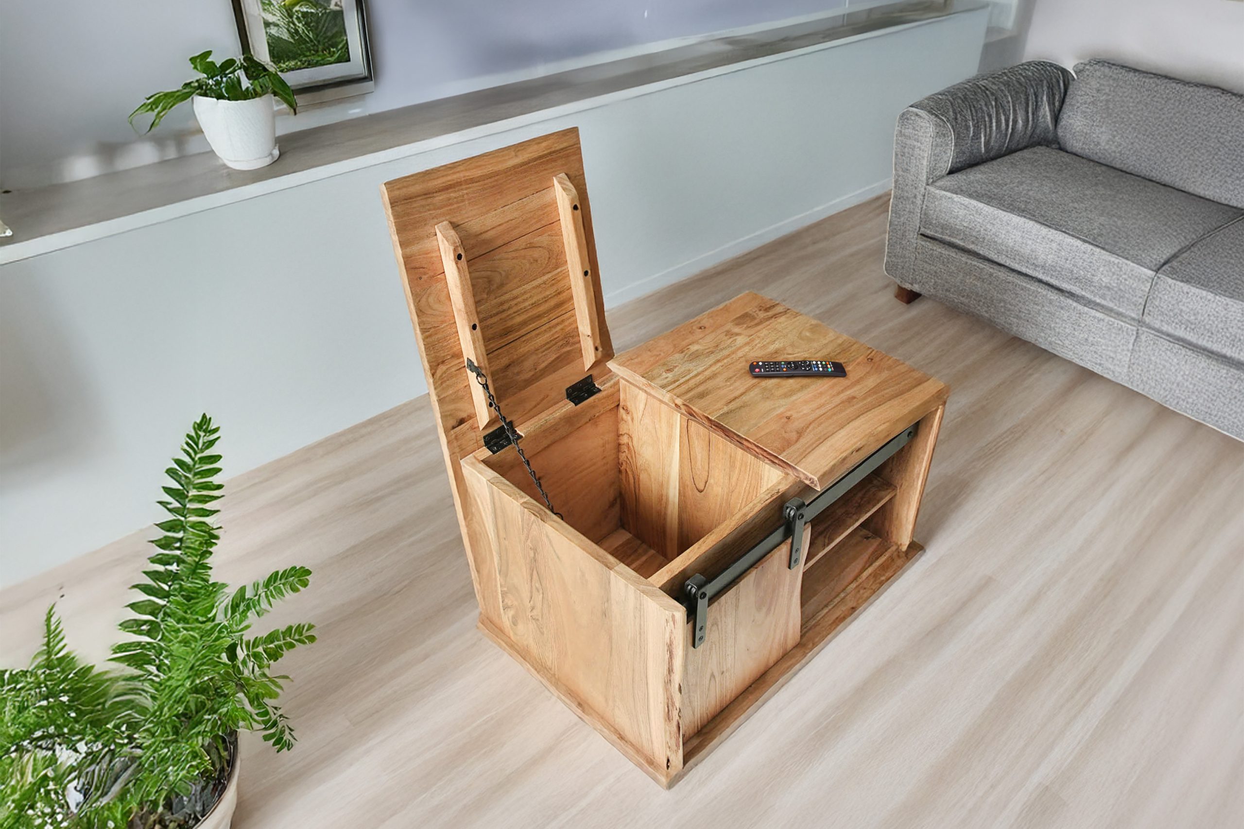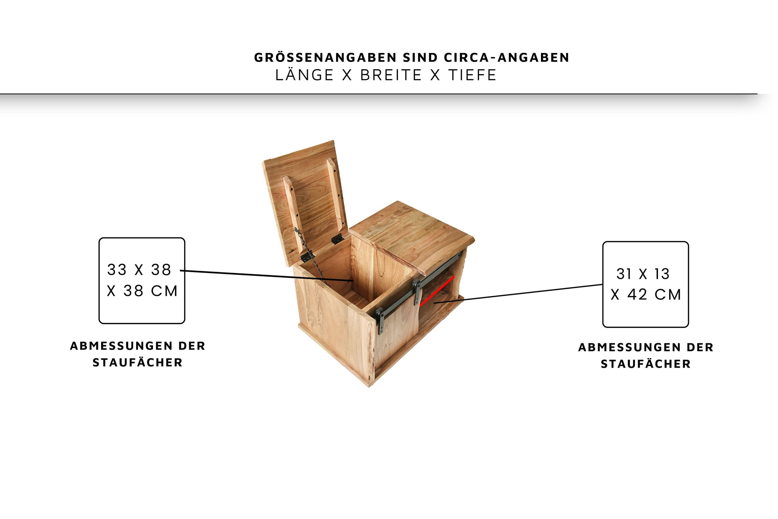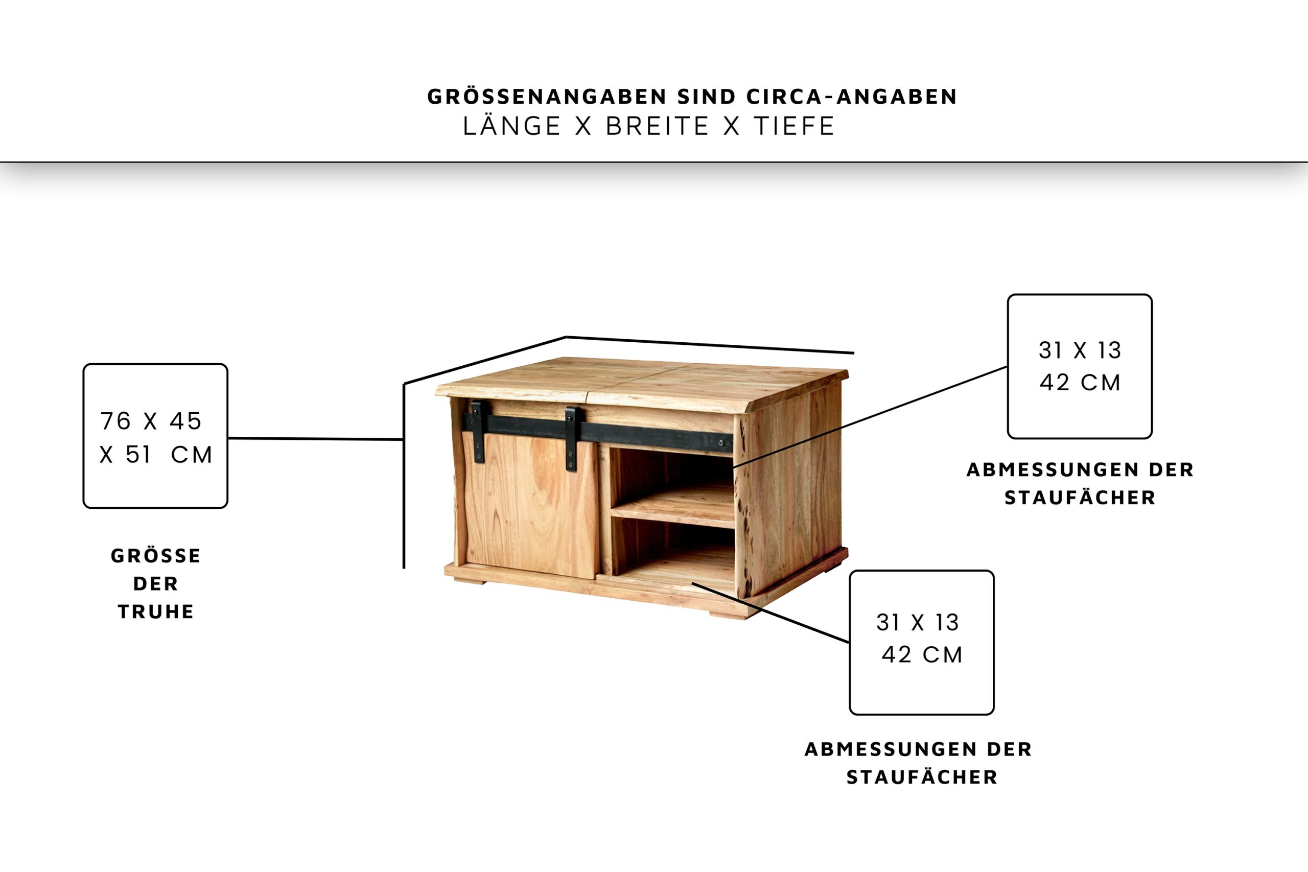 Truhe Lian | Akazienholz massiv | Naturfarben | Schiebetür, 2 Klappen & 2 Fächer | echte Baumkante | 76x51x45 cm