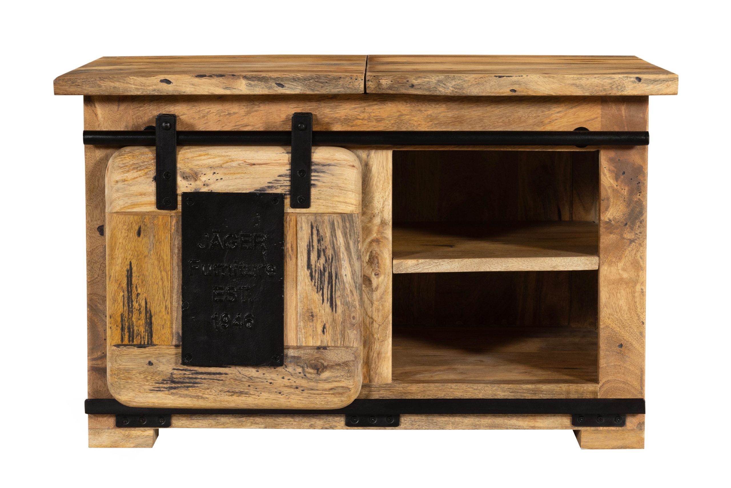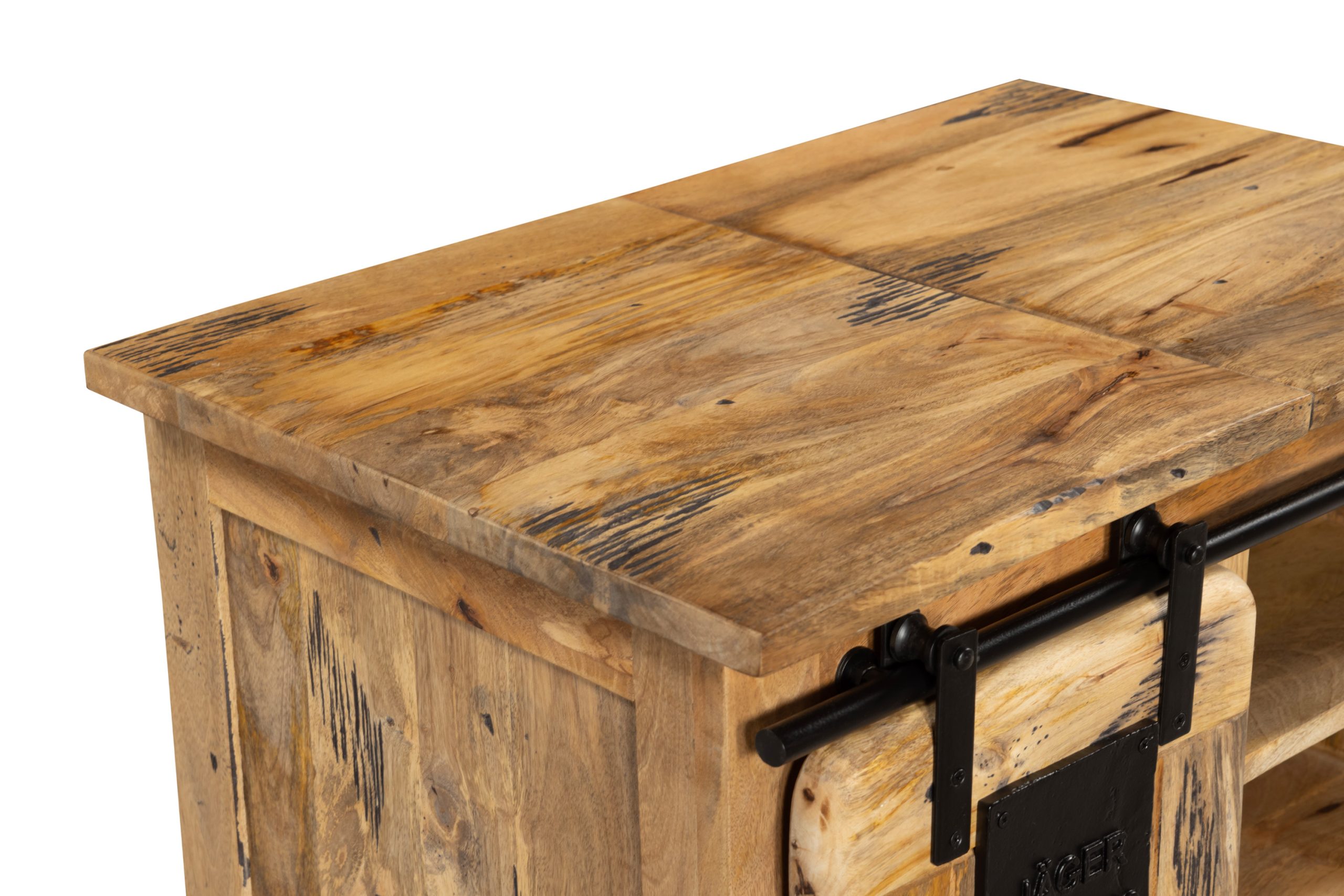 Truhe Libro | 76 x 45 x 51 cm | Mangoholz massiv | Vintage-Optik | 1 Schiebetür + 3 offene Fächer | gusseiserne Elemente