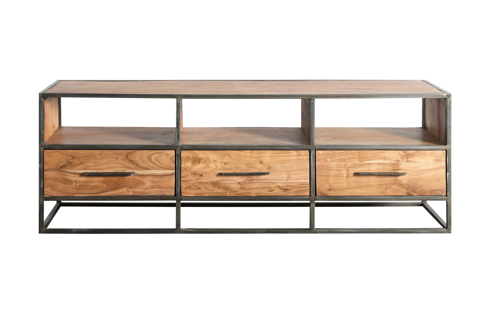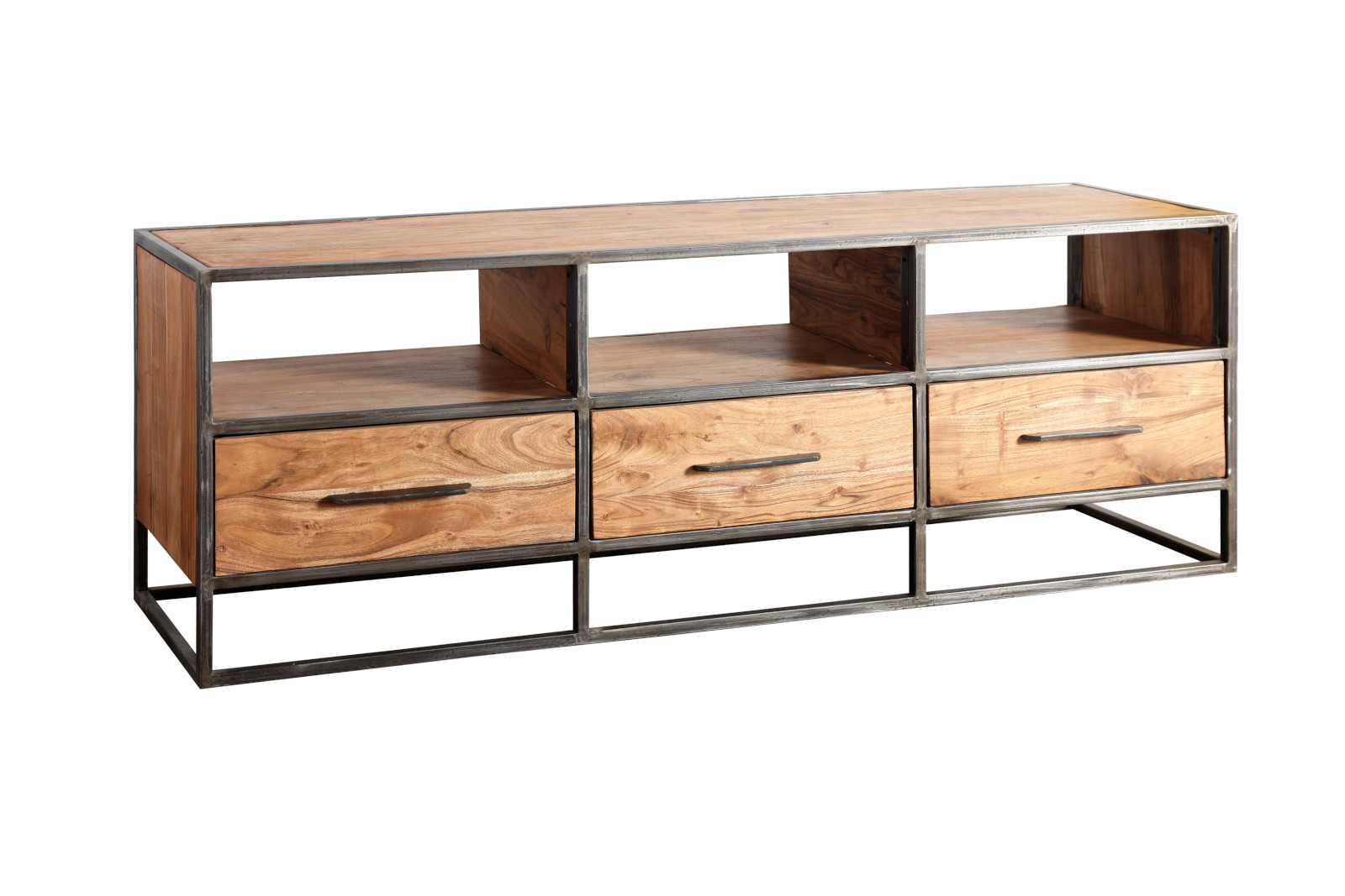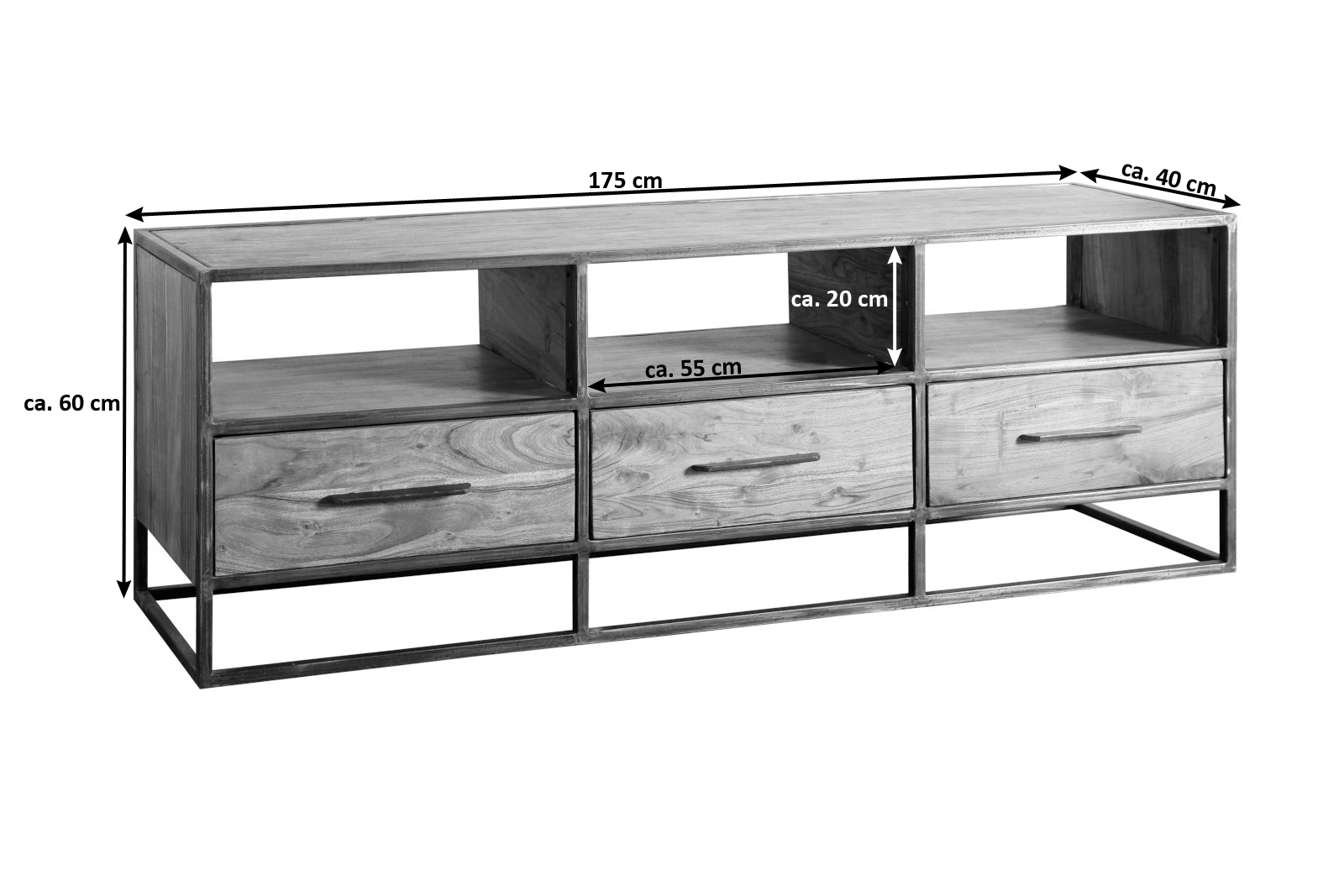 Die TV-Board besitzt dunkle Metallelemente. Gestell, Rahmen und Griffe bestehen aus Metall und verleihen dem Möbelstück einen industriellen Look. Der Schrank harmoniert bestens mit anderen Wohnmöbeln aus den Stilrichtungen Industrial, Vintage oder dem Loft-Look. Mit einer Gesamtgröße von 175 x 60 x 40 cm und und drei Schubfächern lässt sich alles nach Herzenslust sauber und ordentlich verstauen.