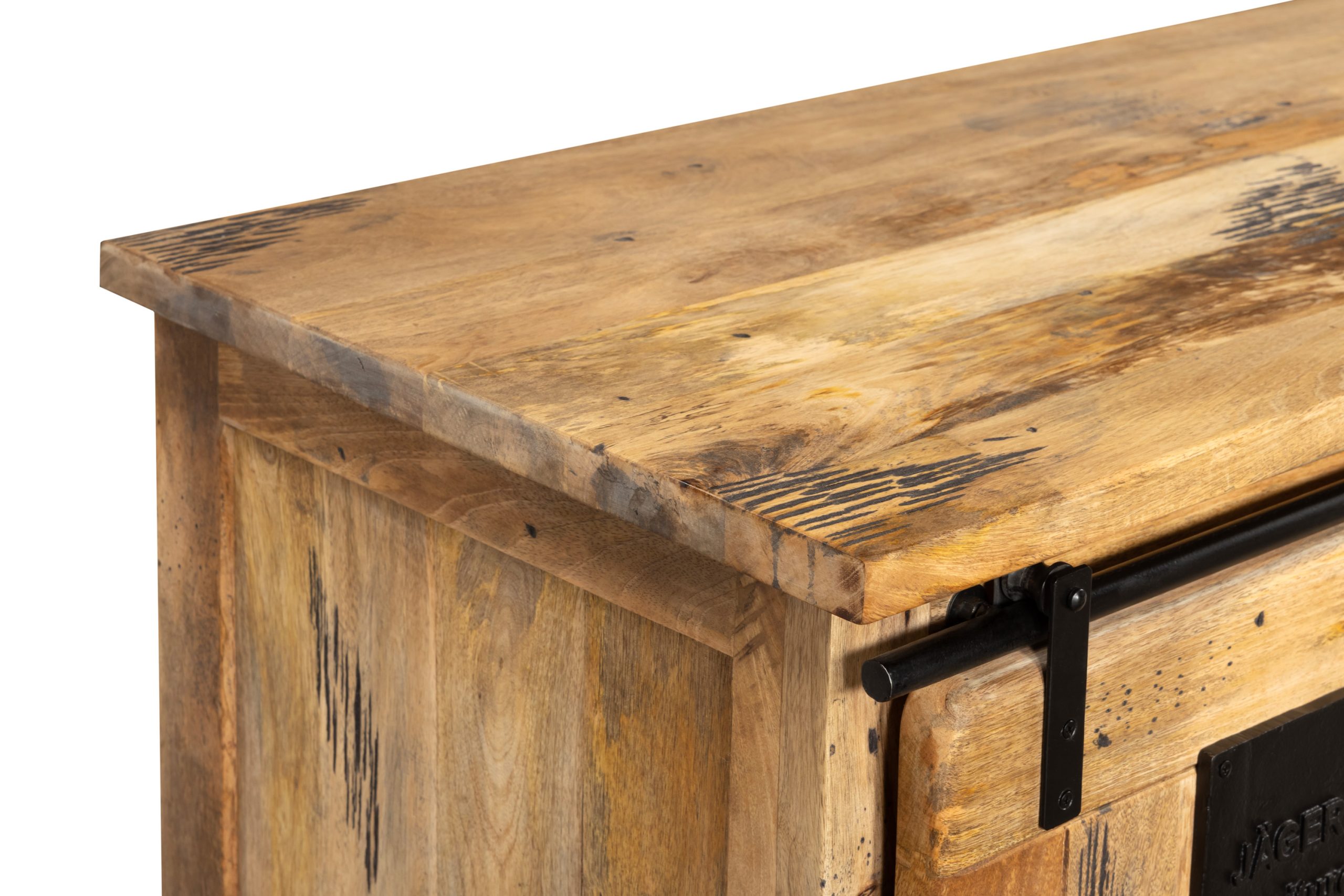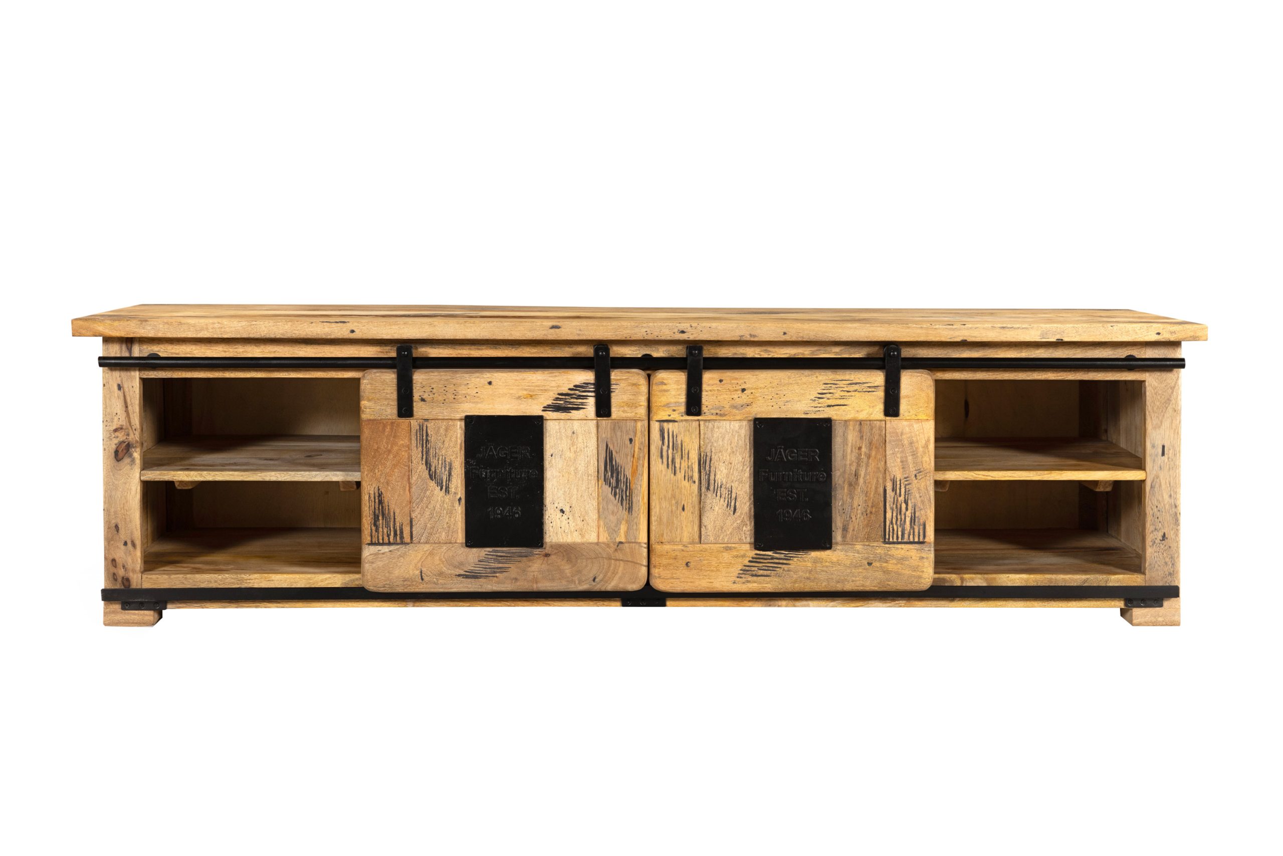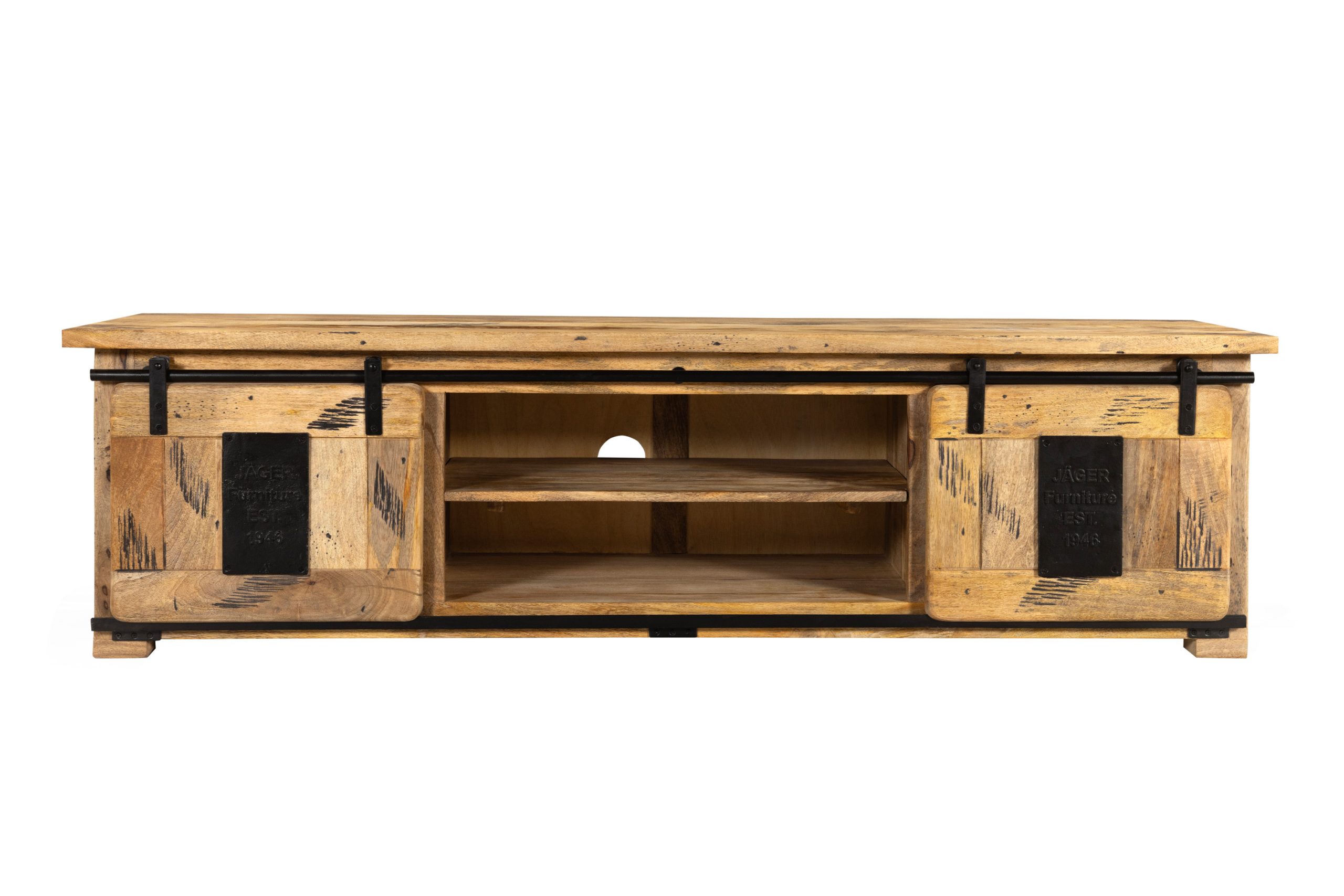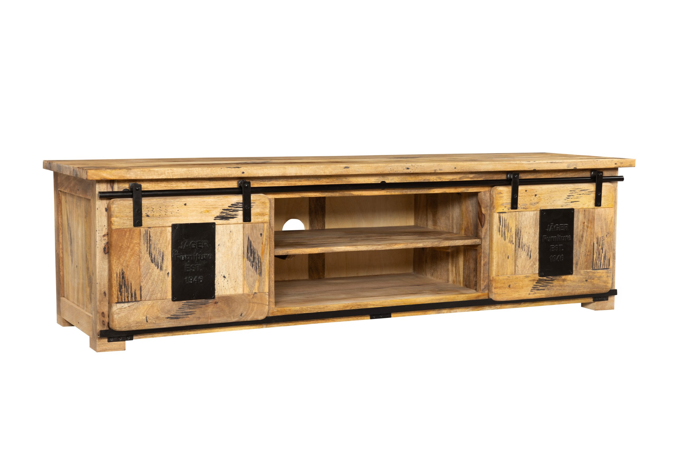 Die Kombination aus zwei großen Schiebetüren mit dekorativen Gusseisen-Elementen und drei offenen Fächern schafft ein durchdachtes Stauraumkonzept – perfekt für alle gängigen TV-Geräte, Medienzubehör und Alltagsgegenstände. Das dunkle Eisen an Türen und Reling unterstreicht den rauen Charme des Holzes und verleiht dem Möbelstück seinen markanten Industrial Style.