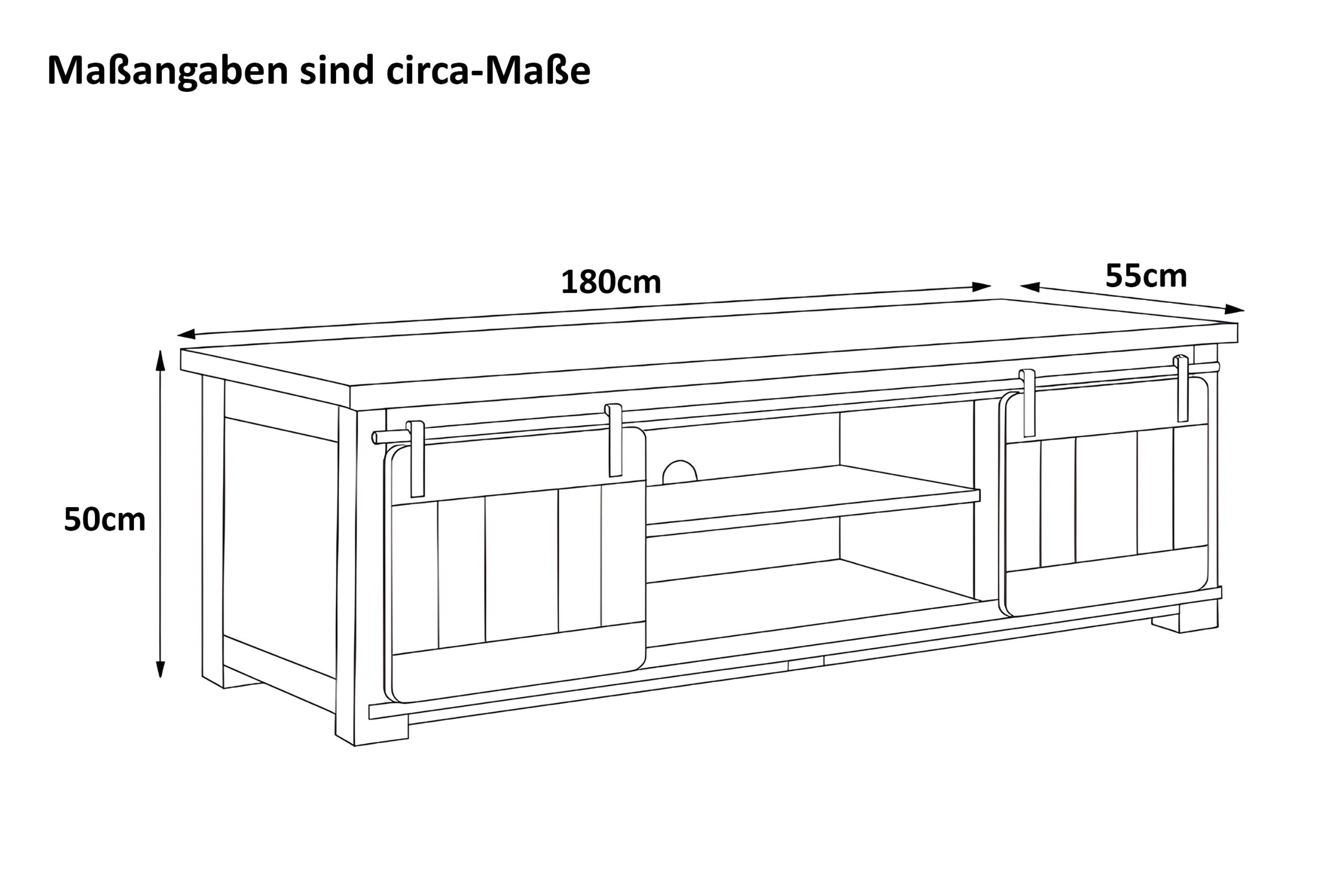 TV-Board Libro | 180 x 50 x 55 cm | Mangoholz massiv | Vintage-Optik | 2 Schiebetüren + 3 offene Fächer | gusseiserne Elemente
