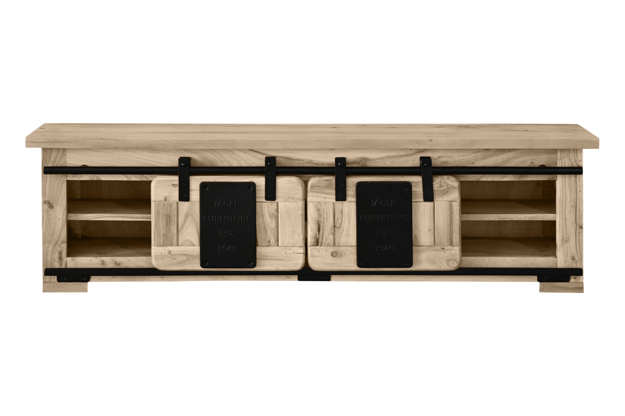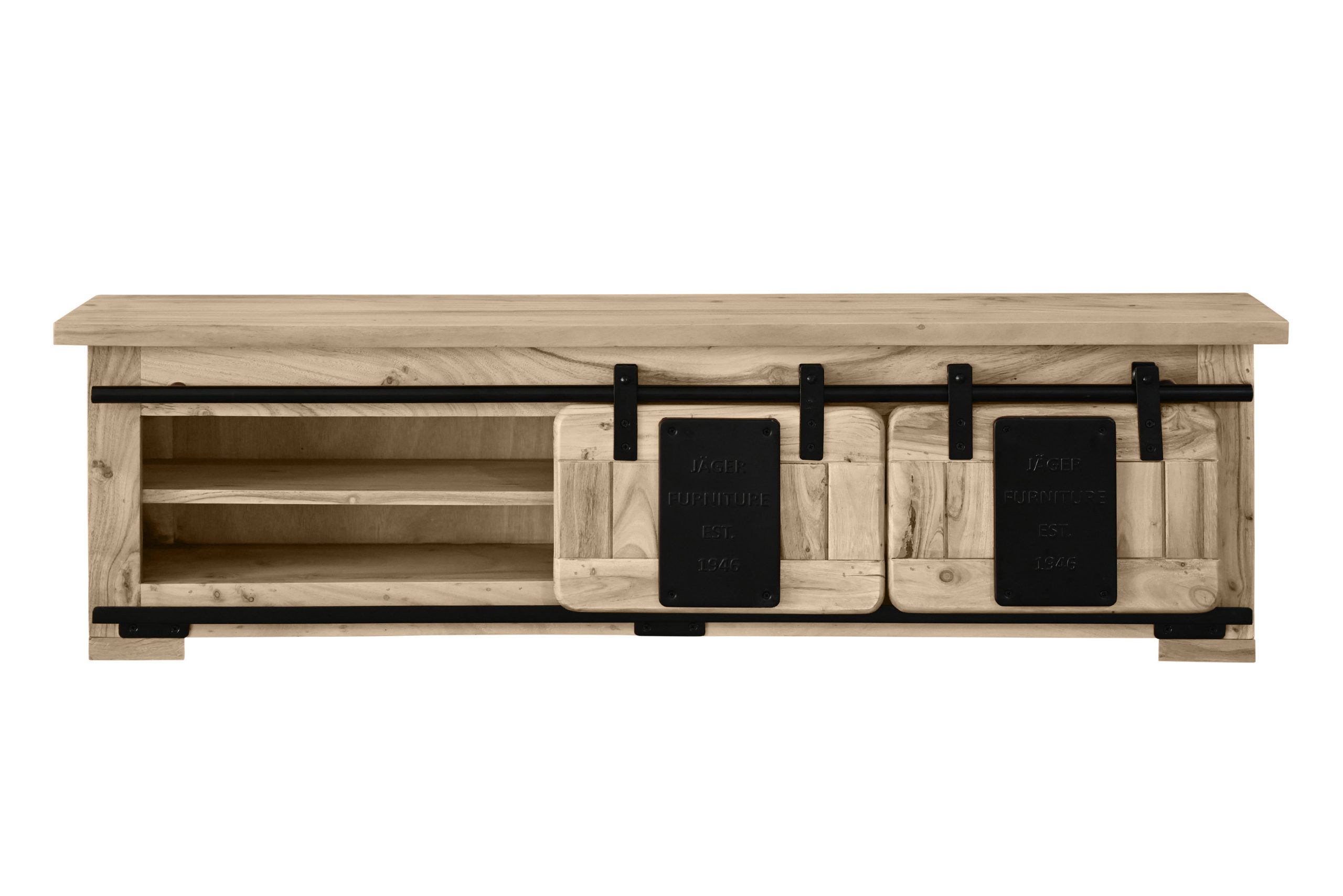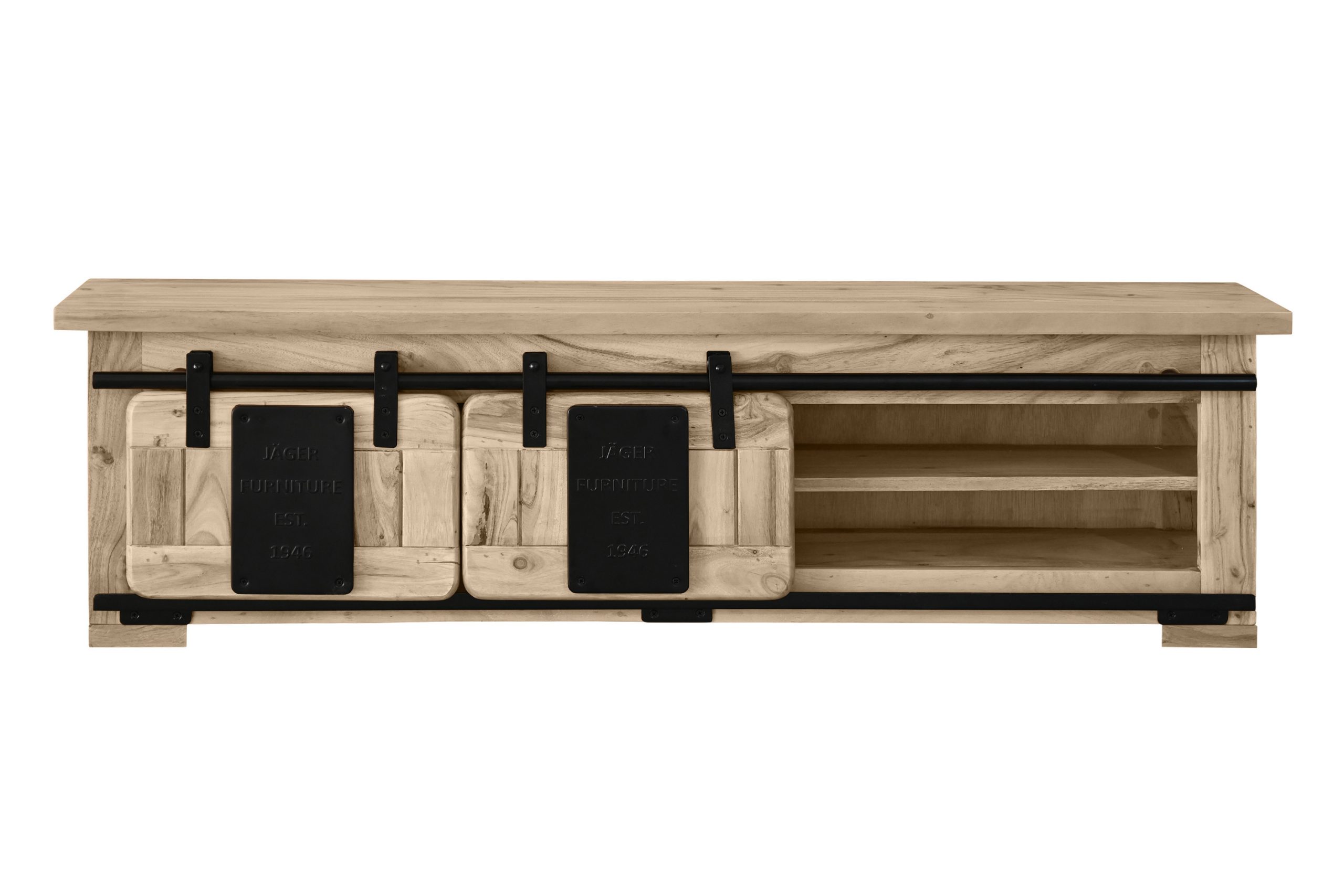 Die beiden Holzschiebetüren gleiten sanft auf stabilen Eisen-Relings mit Metallrollen und lassen sich flexibel nach rechts und links bewegen. Dahinter und in den offenen Fächern bietet das Regal Platz für Bücher, Deko oder Alltagsgegenstände. Stilvolle Applikationen aus Gusseisen verstärken den angesagten Industrial- und Used-Look und machen das Wandregal zu einem markanten Blickfang in Ihrem Wohnraum.