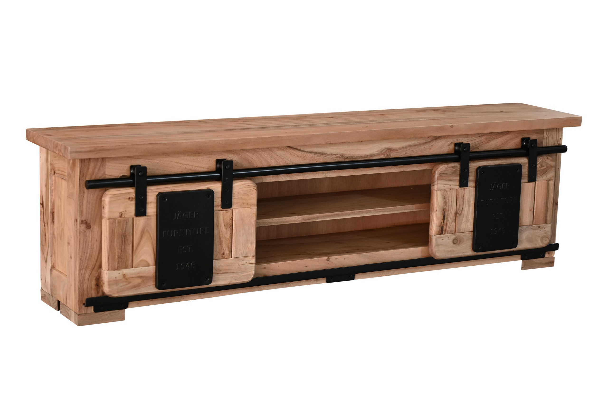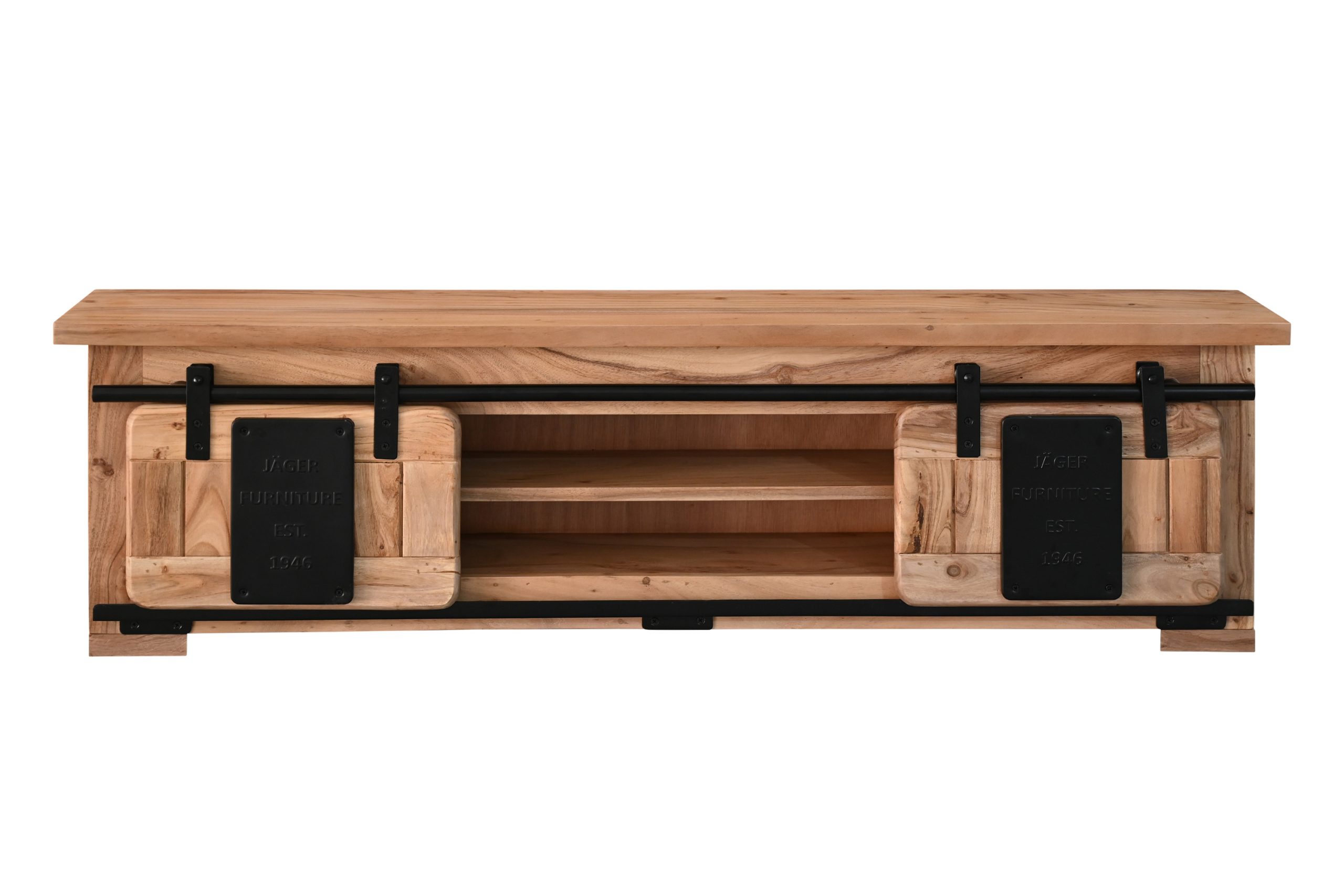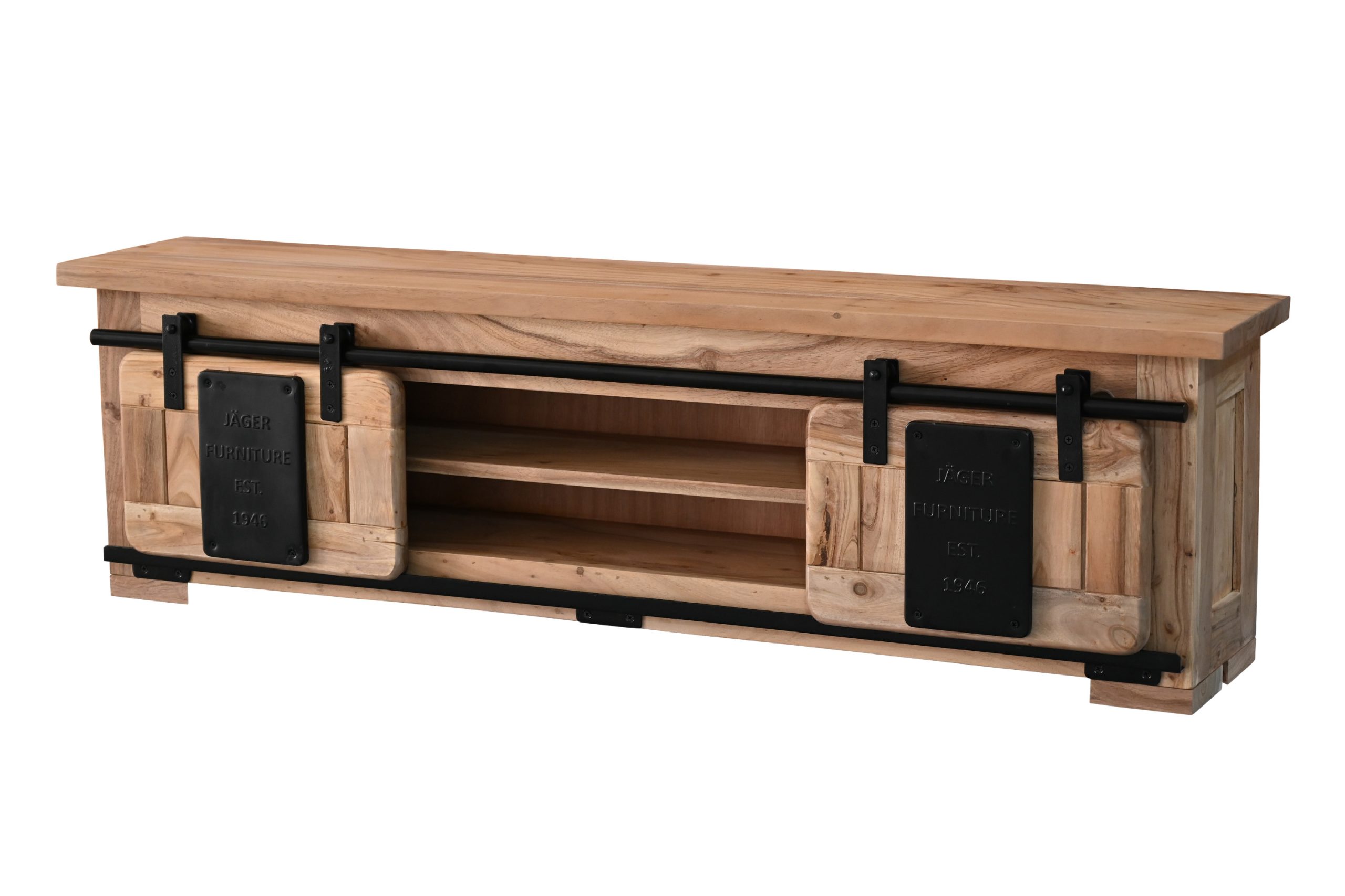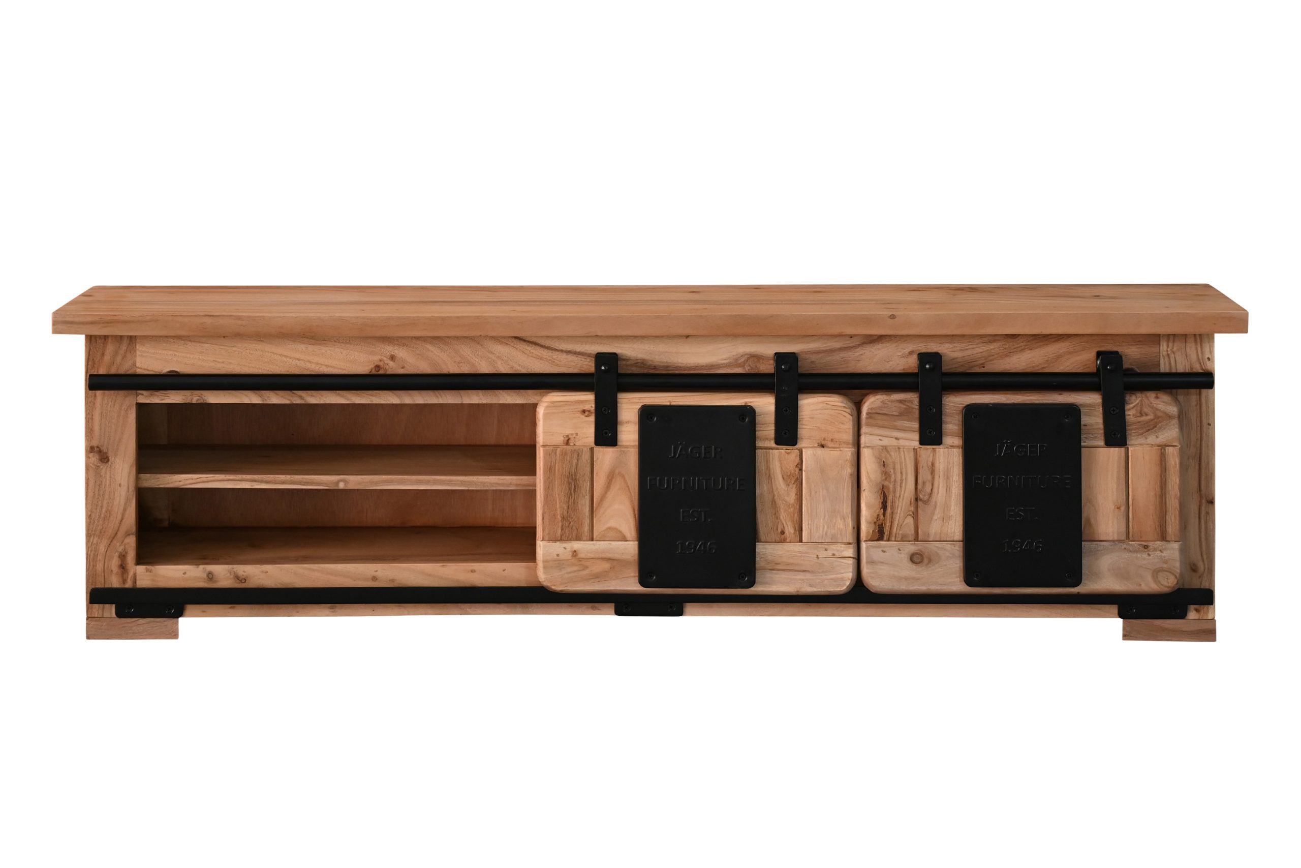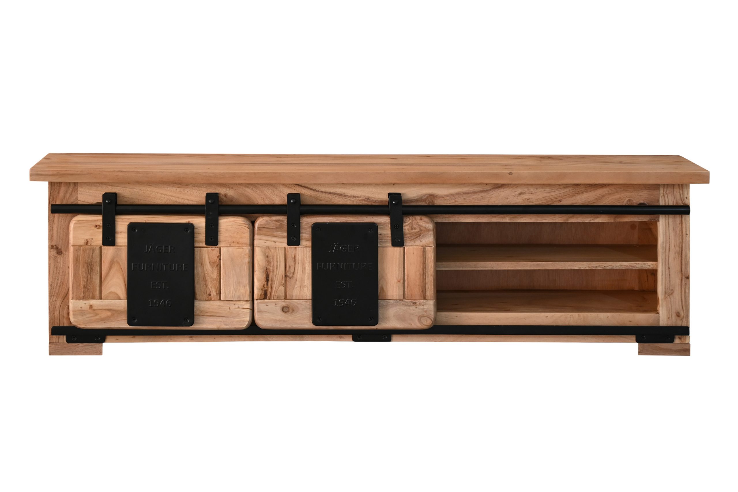 Die beiden Holzschiebetüren laufen sanft auf einer Eisen-Reling mit stabilen Metallrollen und ermöglichen flexiblen Zugriff. Zwei offene Fächer schaffen Platz für Bücher, Gläser, Deko oder kleine Alltagsgegenstände, die stilvoll in Szene gesetzt werden können. Dekorative Applikationen aus Gusseisen betonen den Industrial- und Used-Look und machen das Regal zu einem echten Blickfang an Ihrer Wand.