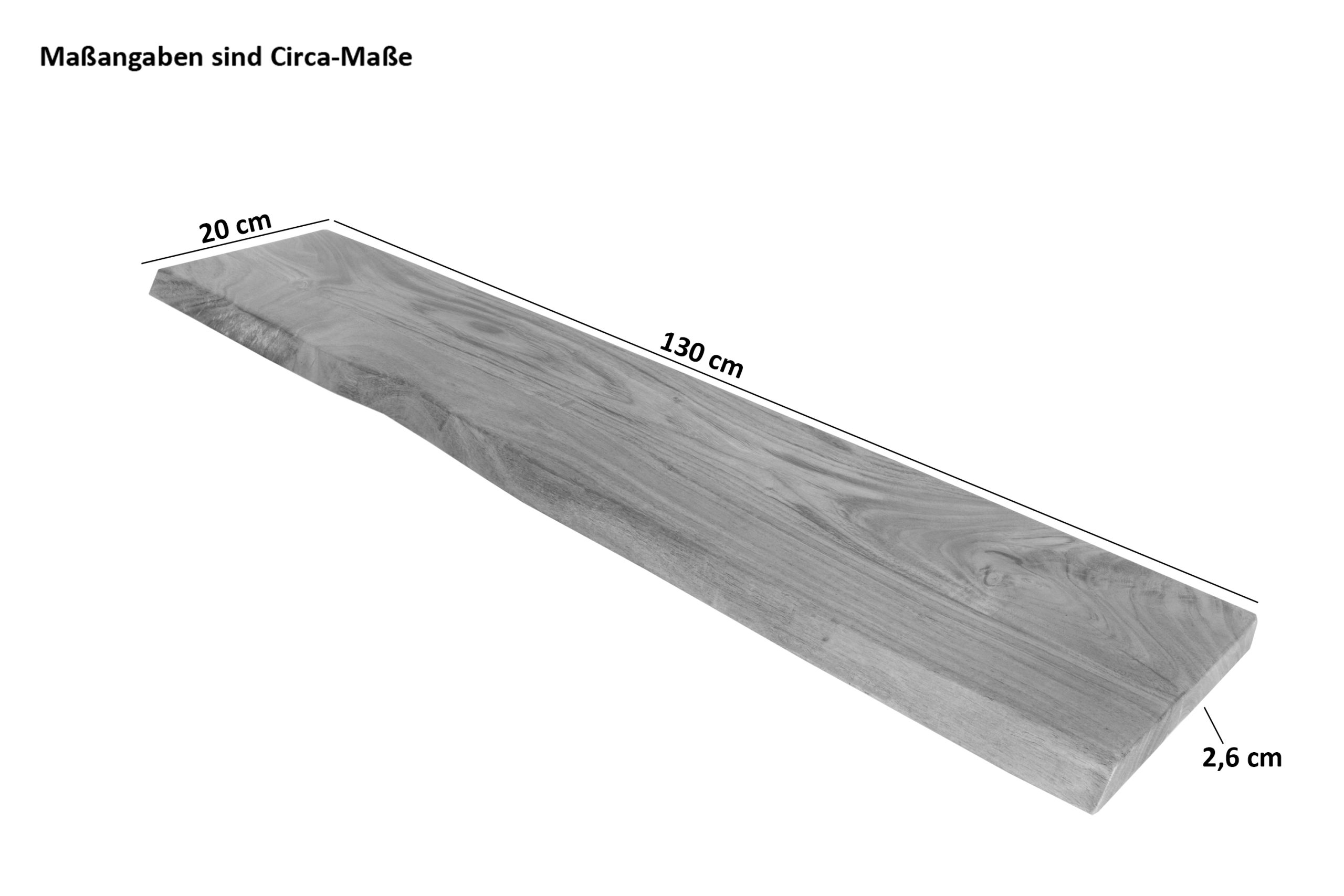 - Breite: ca. 130 cm | Tiefe: ca. 20 cm | Gesamthöhe: ca. 26 mm | Regalbrettstärke: ca. 26 mm