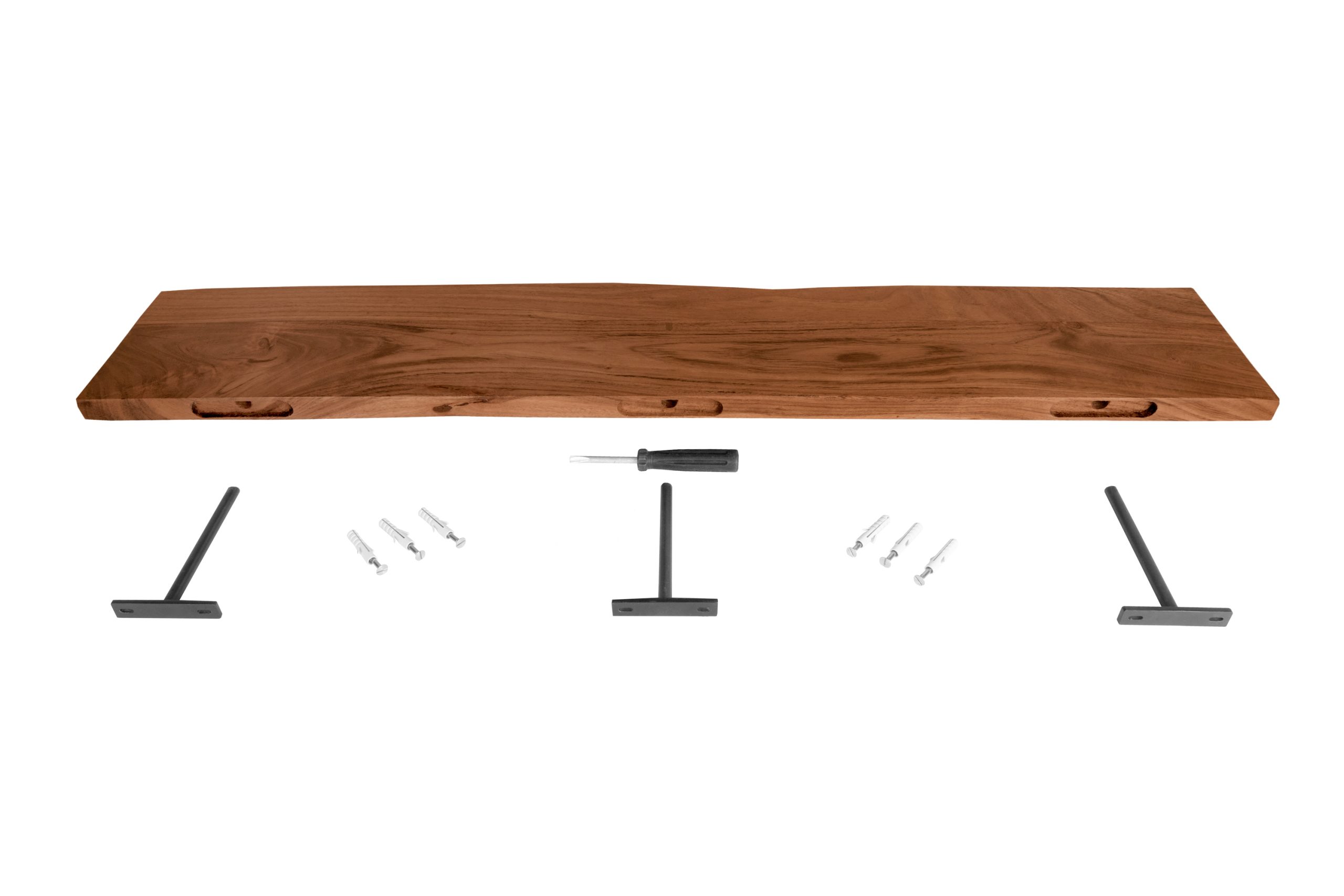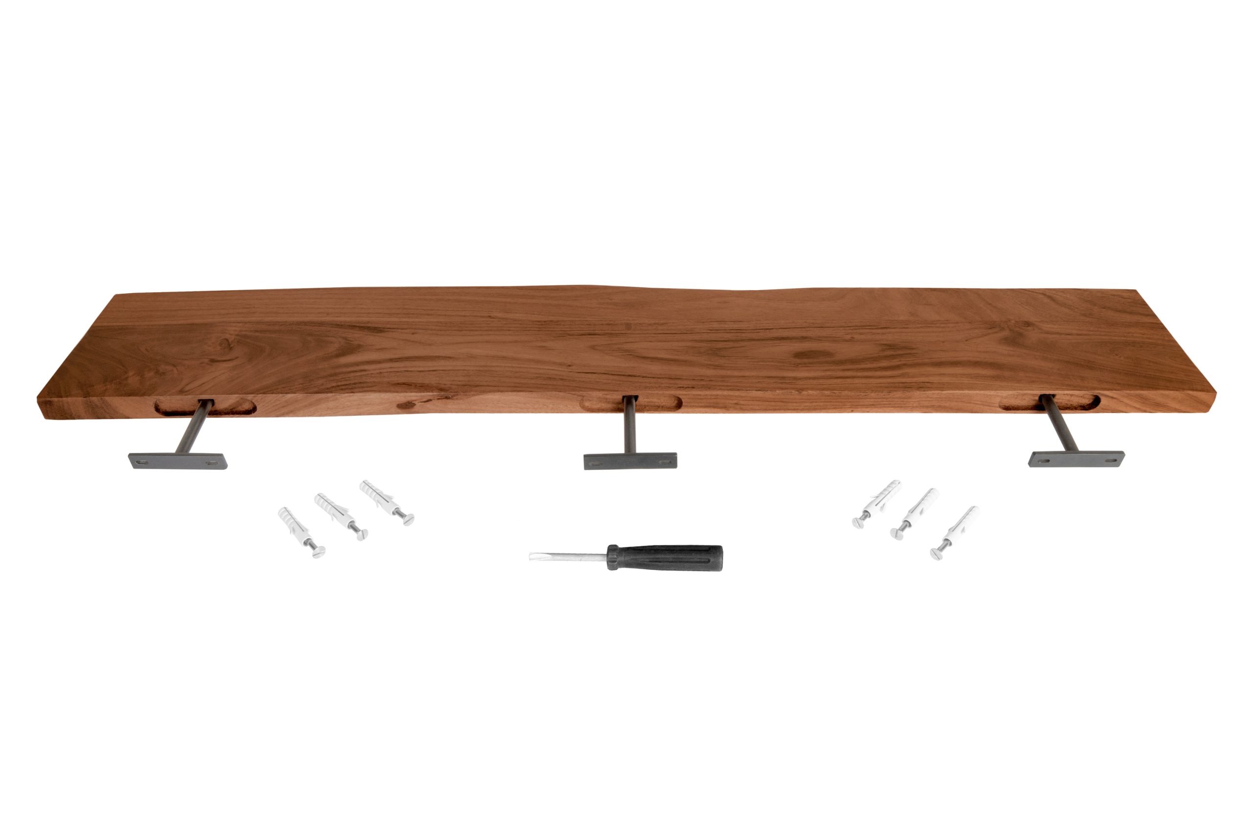 Trendiges Wandregal Amanda, echte Baumkante, Akazienholz nussbaumfarben, lackiert & massiv, 130×20 cm