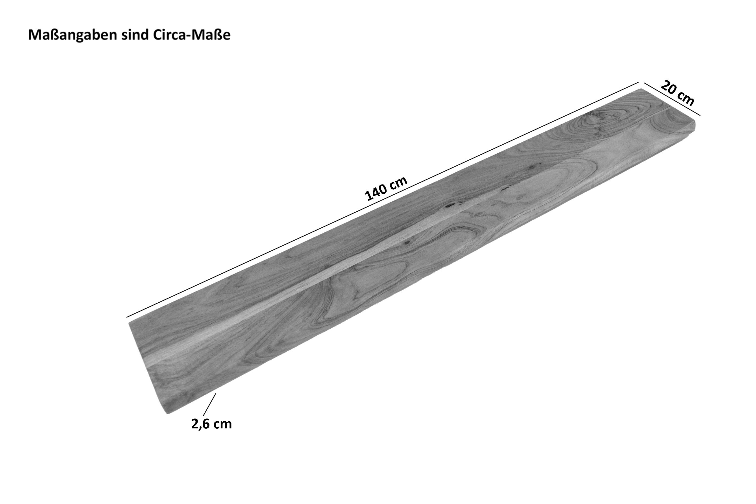 - Breite: ca. 140 cm | Tiefe: ca. 20 cm | Gesamthöhe: ca. 26 mm | Regalbrettstärke: ca. 26 mm